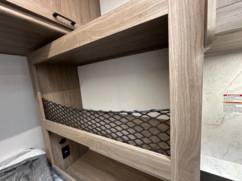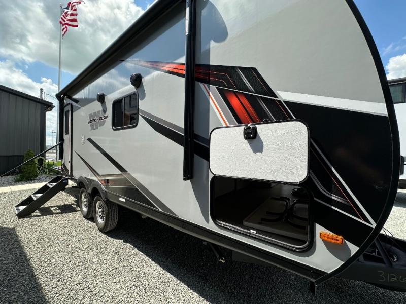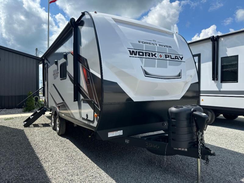 Each Work and Play toy hauler by Forest River is built tough with a mega rail powder coated chassis, a one-piece Tufflex PVC roof membrane, and a fiberglass front cap with rock guard. You will find many convenient features, such as a Winegard Air 360 and TV antenna, an outside spray port, and slam latch door catches to store your riding gear. These toy haulers also include hidden hinge cabinets and doors, USB charging ports in multiple locations, a tankless water heater, plus many more amenities!