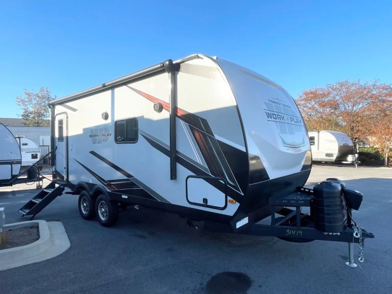 Each Work and Play toy hauler by Forest River is built tough with a mega rail powder coated chassis, a one-piece Tufflex PVC roof membrane, and a fiberglass front cap with rock guard. You will find many convenient features, such as a Winegard Air 360 and TV antenna, an outside spray port, and slam latch door catches to store your riding gear. These toy haulers also include hidden hinge cabinets and doors, USB charging ports in multiple locations, a tankless water heater, plus many more amenities!