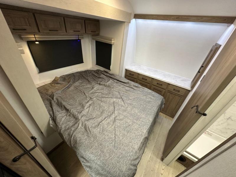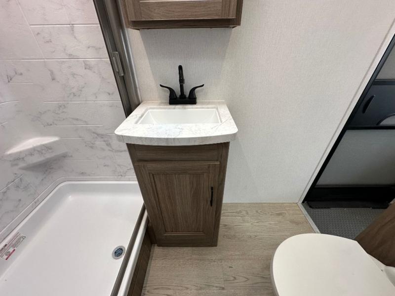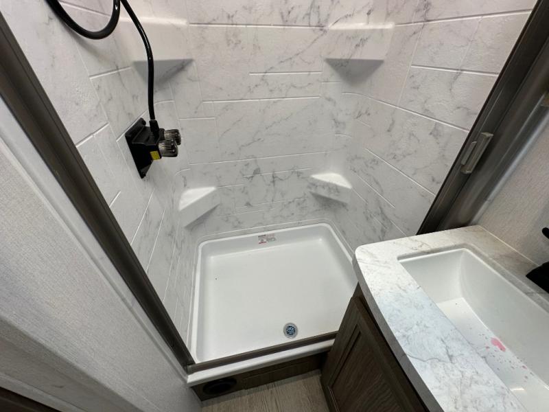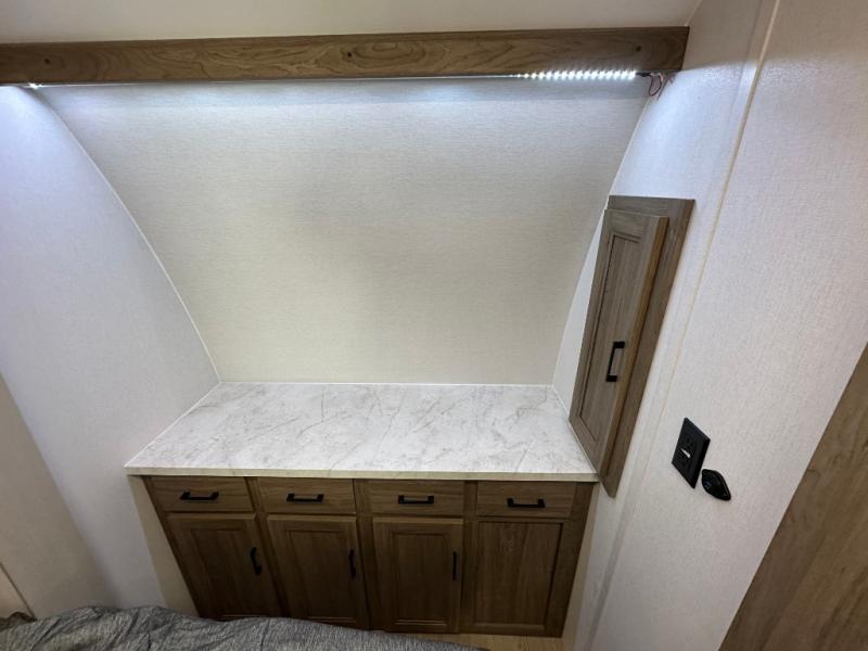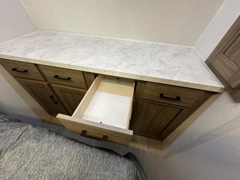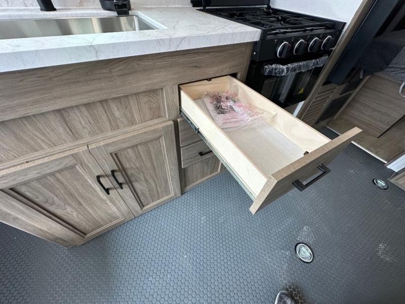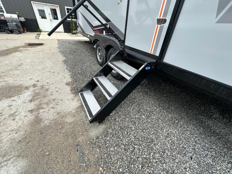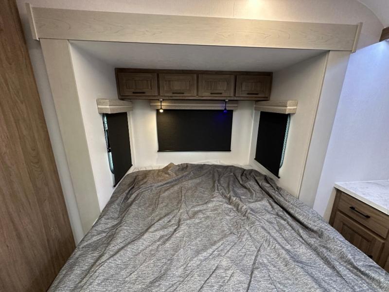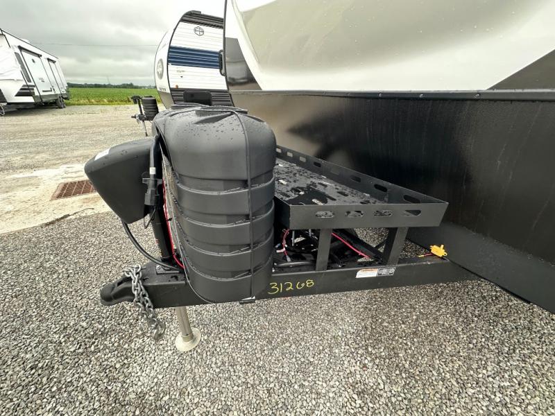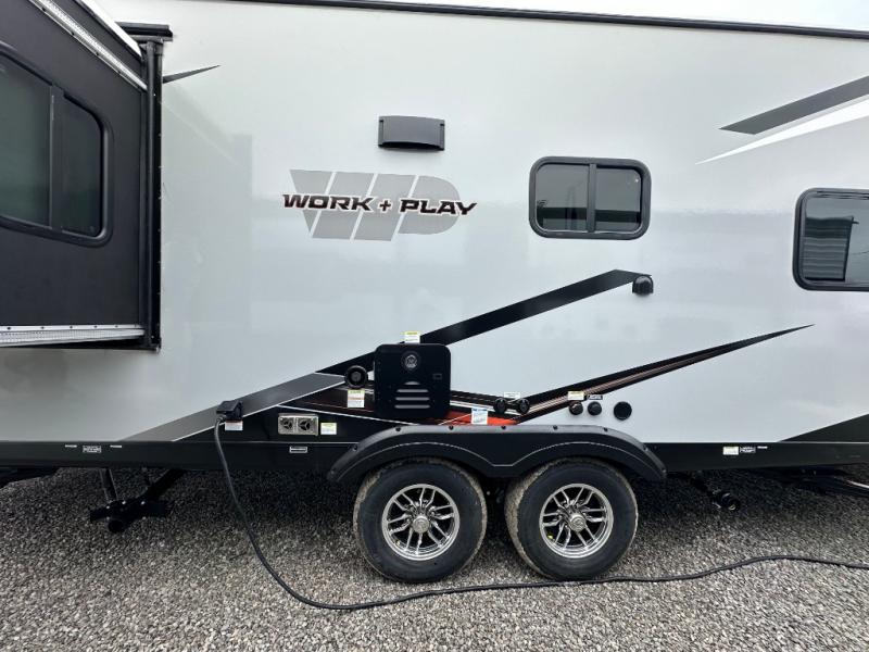 Each Work and Play toy hauler by Forest River is built tough with a mega rail powder coated chassis, a one-piece Tufflex PVC roof membrane, and a fiberglass front cap with rock guard. Towing is made hassle-free with the heavy duty Dexter axles with Nev-R-Adjust brakes and nitrogen filled tires. You will find many convenient features, such as a Winegard Air 360 and TV antenna, an outside spray port, and magnetic compartment door catches to store your riding gear. These toy haulers also include shaker style cabinets and doors, a residential bedspread, multiple USB ports for all your electronics, and many more amenities!