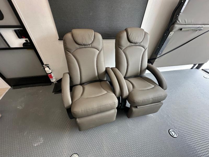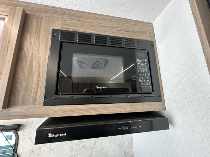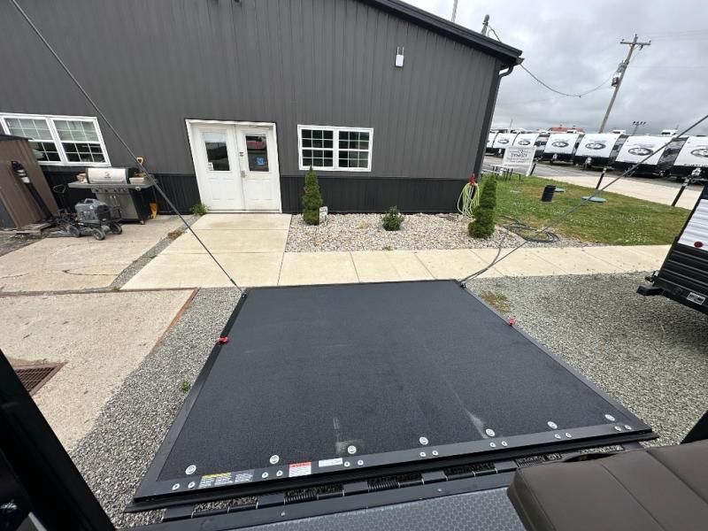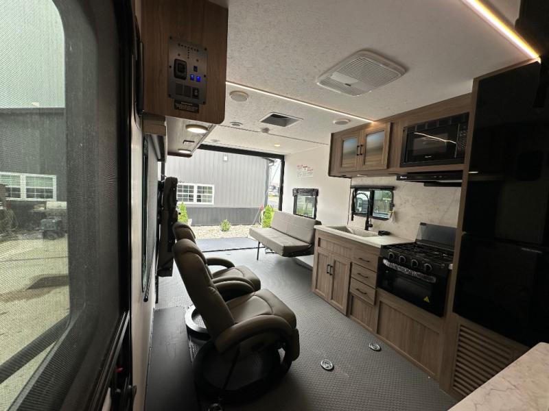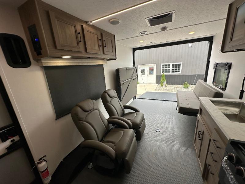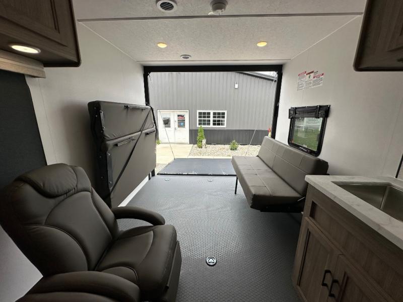 You can have the best of both worlds with this toy hauler; a little work and a little play! Once you unload your bikes from the ramp door, relax on the roll-over sofas while the chef of your group prepares lunch on the three burner cooktop. There are also two Euro recliners and an entertainment center that will make it feel more like home. The dual entry bath will create a master suite you are sure to love. Here, you will sleep soundly on the queen bed slide out, and there is a dresser to store your clothes for the week. It's time to load up and head out! This LT model has a few options you can choose from to further customize your camping experience, like the optional electric queen bed, the optional 30 gallon fuel station, and the optional second 15K BTU A/C!