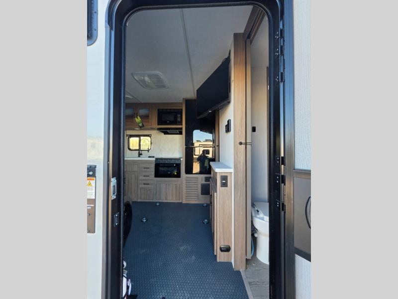 Each Work and Play toy hauler by Forest River is built tough with a mega rail powder coated chassis, a one-piece Tufflex PVC roof membrane, and a fiberglass front cap with rock guard. You will find many convenient features, such as a Winegard Air 360 and TV antenna, an outside spray port, and slam latch door catches to store your riding gear. These toy haulers also include hidden hinge cabinets and doors, USB charging ports in multiple locations, a tankless water heater, plus many more amenities!