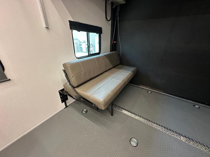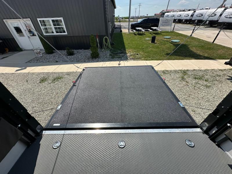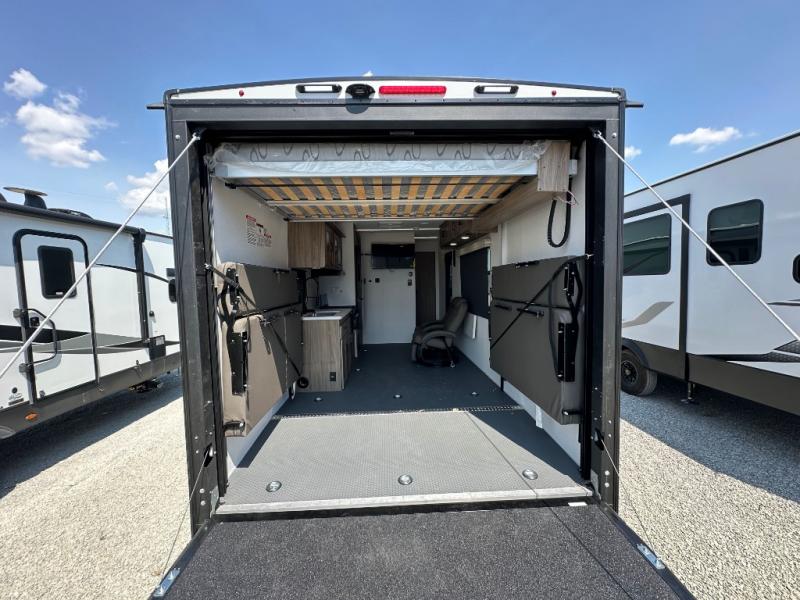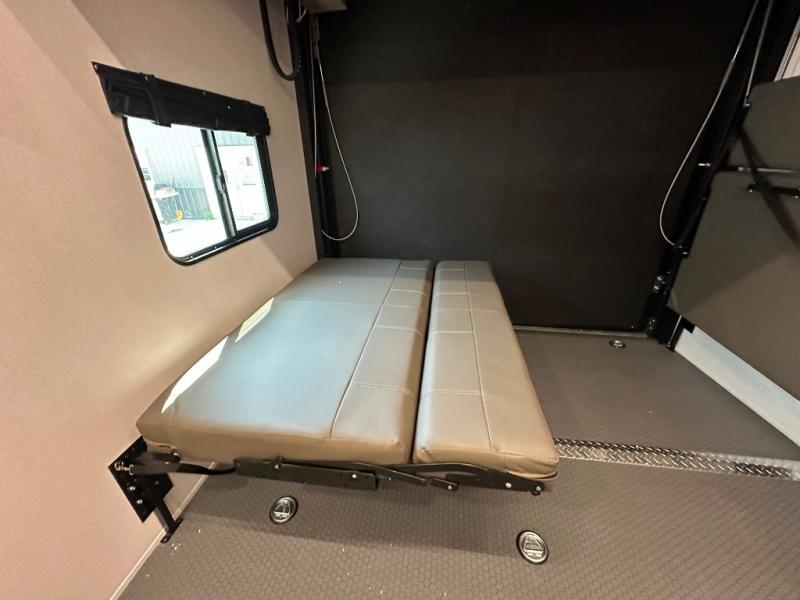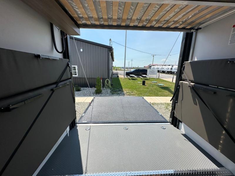 This high profile toy hauler is the one you've been looking for! You can easily sleep six people since it includes two roll-over sofas and a queen bed electric lift, along with the king bed in the master. The dual entry bath is convenient for everyone, and you'll find storage space throughout for all your belongings. The kitchen includes everything you need to prepare a meal after trail riding, including a three burner cooktop, a microwave oven, plus a 12V refrigerator for cold drinks and perishables. You can choose additional optional equipment with this model, like the optional 5.5K Onan generator, the optional ramp door party patio kit, or the optional second 15K BTU A/C!