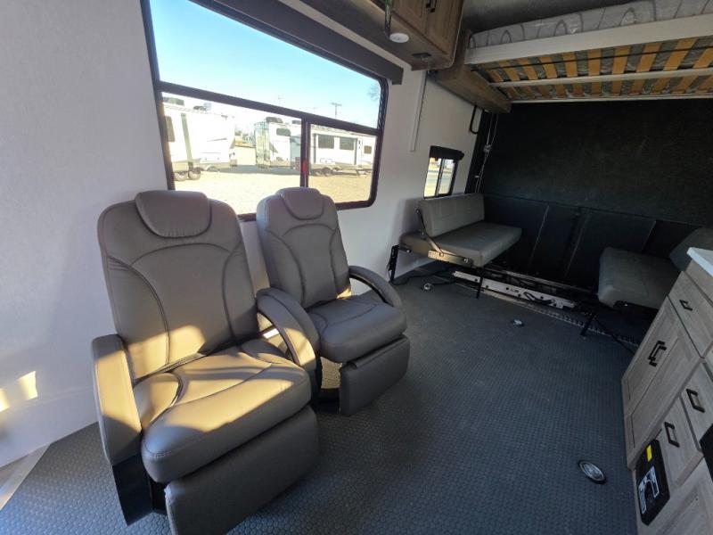 This high profile toy hauler is the one you've been looking for! You can easily sleep six people since it includes two roll-over sofas and a queen bed electric lift, along with the king bed in the master. The dual entry bath is convenient for everyone, and you'll find storage space throughout for all your belongings. The kitchen includes everything you need to prepare a meal after trail riding, including a three burner cooktop, a microwave oven, plus a 12V refrigerator for cold drinks and perishables. You can choose additional optional equipment with this model, like the optional 5.5K Onan generator, the optional ramp door party patio kit, or the optional second 15K BTU A/C!