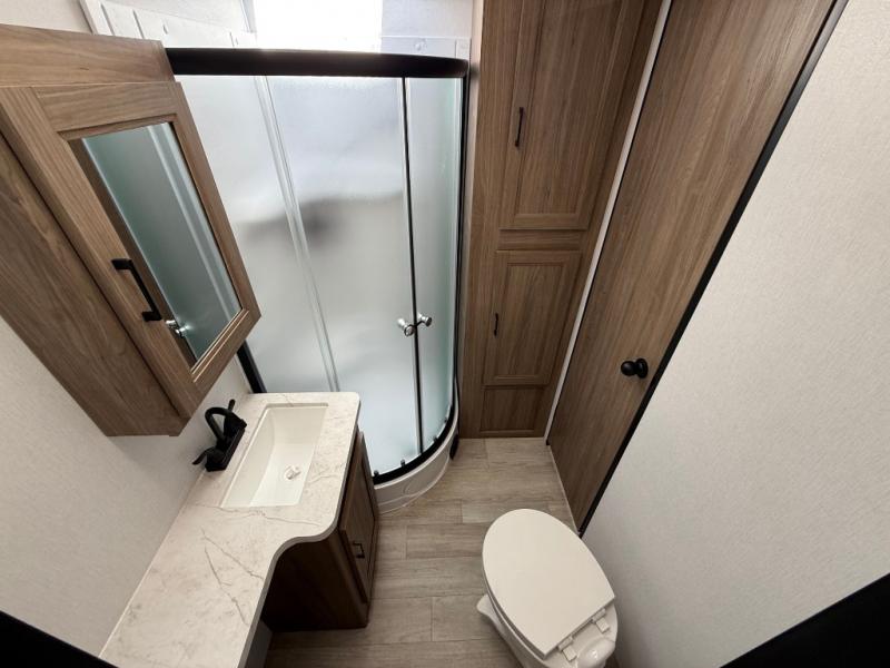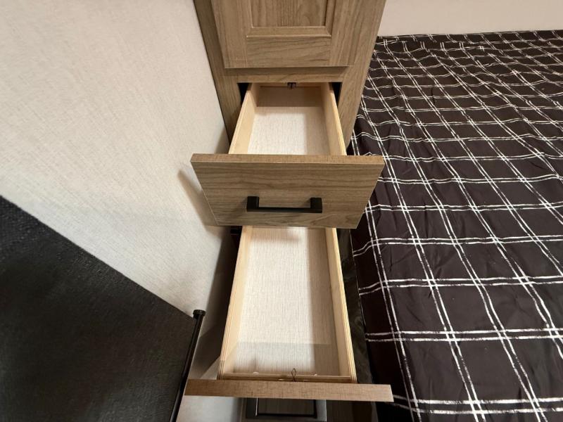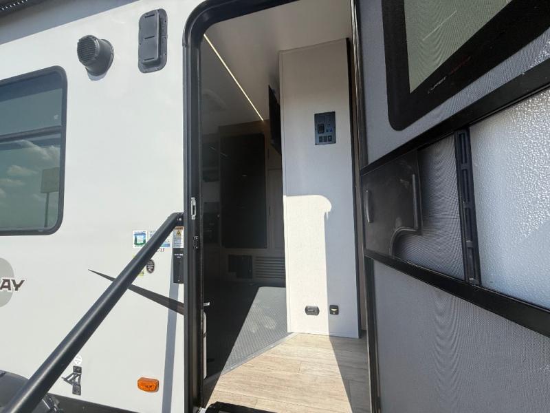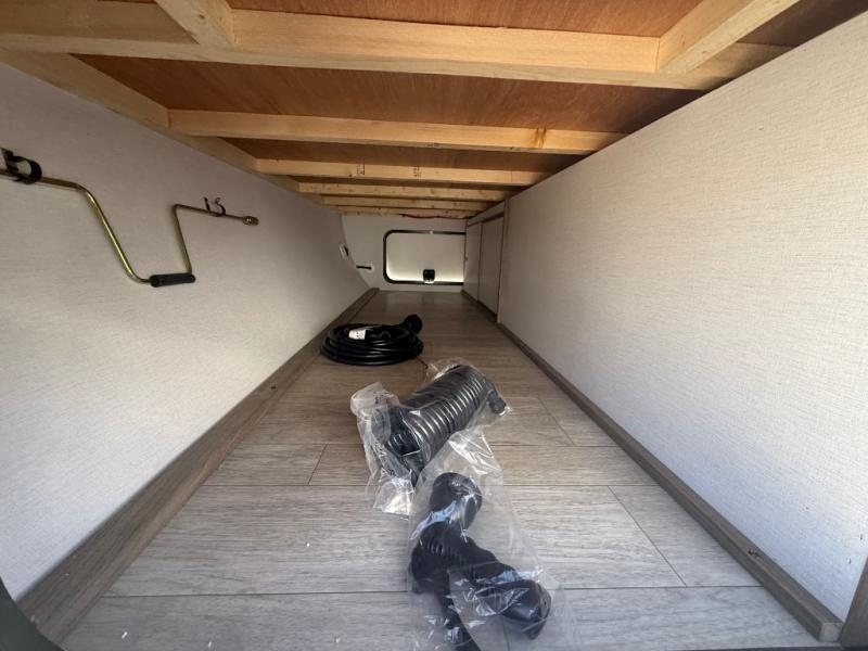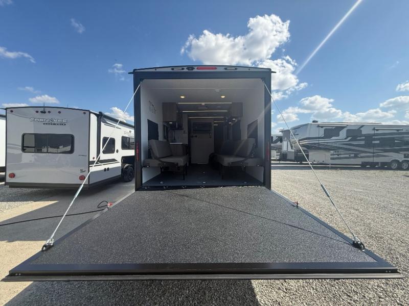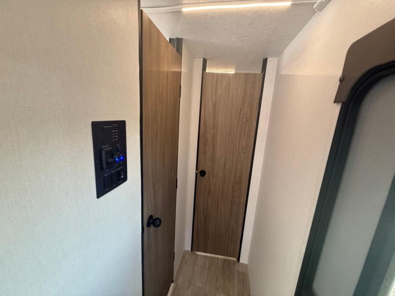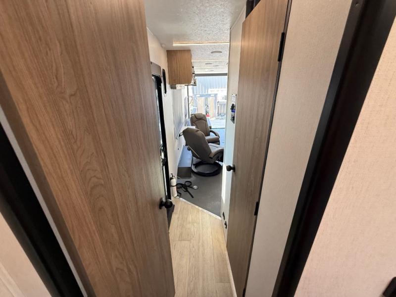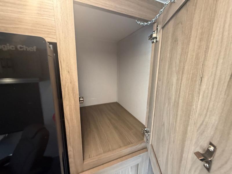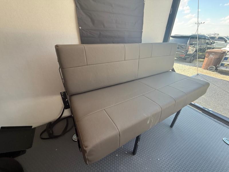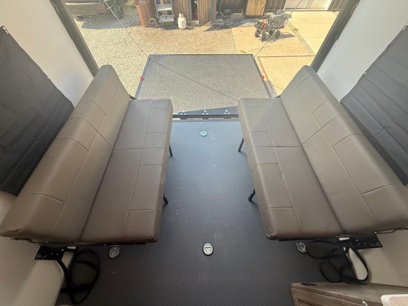 Get ready for a weekend of trail riding with buddies in this toy hauler! You'll have a total of 15' 9" of garage space to load up your dirt bikes or kayaks, and there are two roll-over sofas with a dinette table so you can eat lunch before heading out. The outdoor spray port will allow you to wash off the mud from your tires when you return, and you can choose the optional 30 gallon fuel station so you'll be ready to go the next day. This model also includes a dual entry bath that will create a front master bedroom you are sure to love. Here, you'll sleep soundly on the king bed, and you can keep your clothes wrinkle-free in the dual shirt closets!