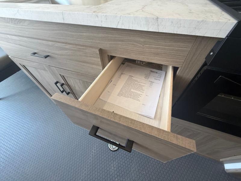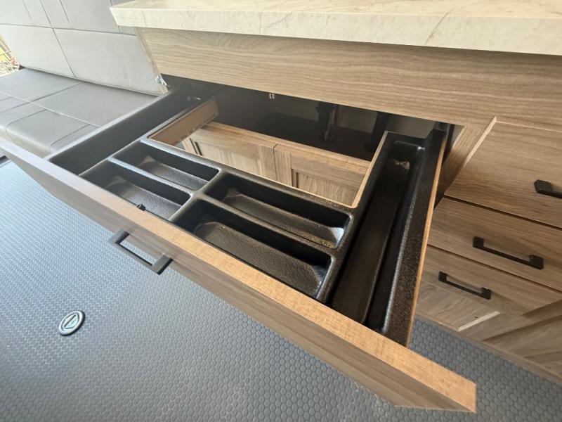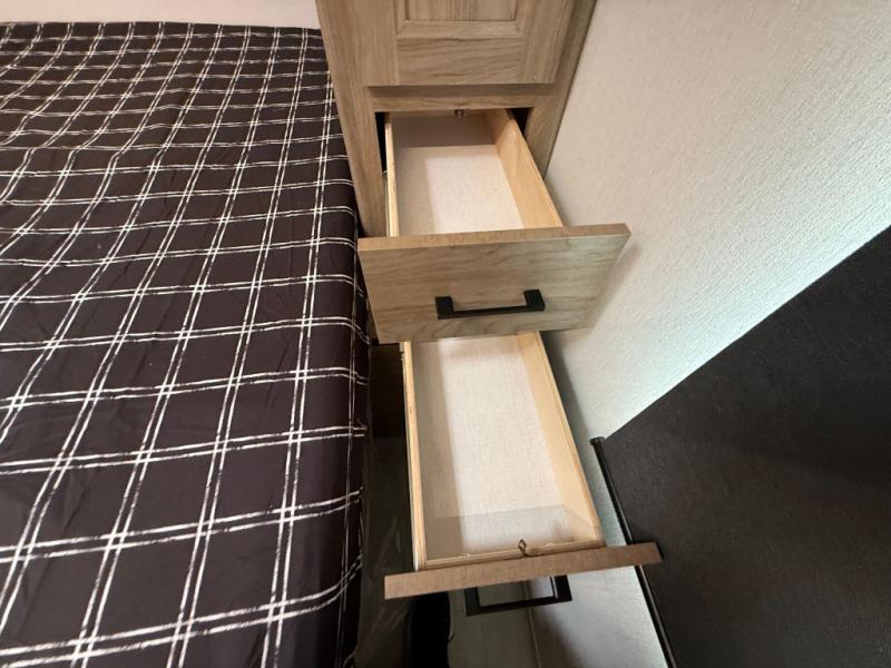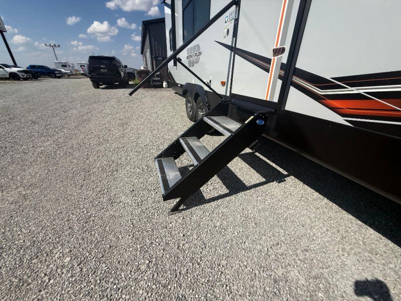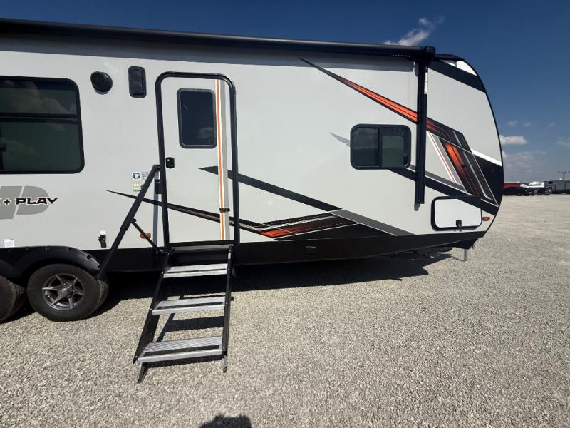 Each Work and Play toy hauler by Forest River is built tough with a mega rail powder coated chassis, a one-piece Tufflex PVC roof membrane, and a fiberglass front cap with rock guard. Towing is made hassle-free with the heavy duty Dexter axles with Nev-R-Adjust brakes and nitrogen filled tires. You will find many convenient features, such as a Winegard Air 360 and TV antenna, an outside spray port, and magnetic compartment door catches to store your riding gear. These toy haulers also include shaker style cabinets and doors, a residential bedspread, multiple USB ports for all your electronics, and many more amenities!