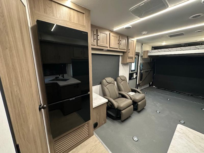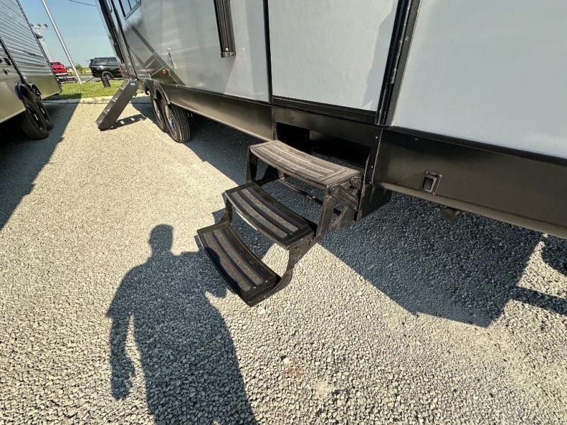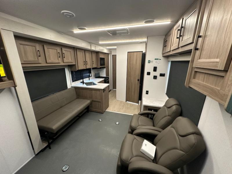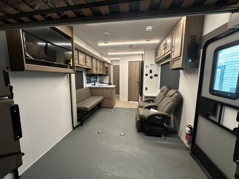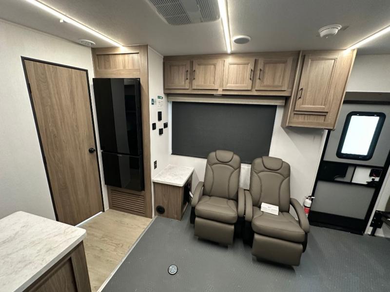 This dual entry toy hauler is perfect for your family of seven or group of friends! There is a queen bed electric lift above the dual roll-over sofas, plus a flip-up sofa and a king bed for plenty of sleeping space. You will appreciate the ramp door and a 30 gallon fuel station to keep your toys ready to go when you are. The flip-up slide floor will provide more space for the chef of the group to prepare lunch on the three burner cooktop, and there are dual Euro recliners to relax in style. This high profile model has additional optional equipment that can be added such as, an optional 5.5K Onan generator, an optional 10 cu. ft. refrigerator, and an optional ramp door party patio kit for more outdoor fun!