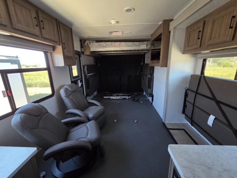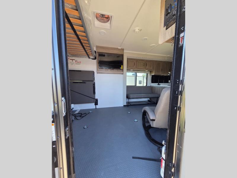 This dual entry toy hauler is perfect for your family of seven or group of friends! There is a queen bed electric lift above the dual roll-over sofas, plus a flip-up sofa and a king bed for plenty of sleeping space. You will appreciate the ramp door and a 30 gallon fuel station to keep your toys ready to go when you are. The flip-up slide floor will provide more space for the chef of the group to prepare lunch on the three burner cooktop, and there are dual Euro recliners to relax in style. This high profile model has additional optional equipment that can be added such as, an optional 5.5K Onan generator, an optional 10 cu. ft. refrigerator, and an optional ramp door party patio kit for more outdoor fun!