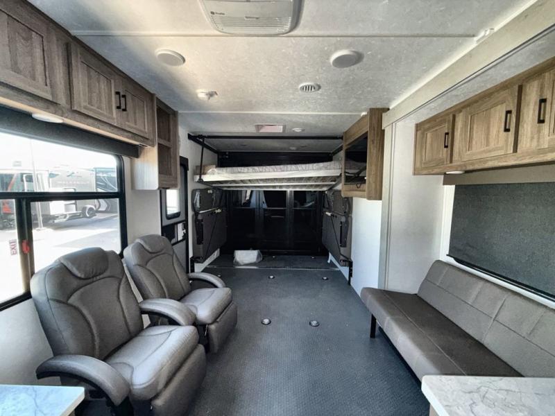 This dual entry toy hauler is perfect for your family of seven or group of friends! There is a queen bed electric lift above the dual roll-over sofas, plus a flip-up sofa and a king bed for plenty of sleeping space. You will appreciate the ramp door and a 30 gallon fuel station to keep your toys ready to go when you are. The flip-up slide floor will provide more space for the chef of the group to prepare lunch on the three burner cooktop, and there are dual Euro recliners to relax in style. This high profile model has additional optional equipment that can be added such as, an optional 5.5K Onan generator, second 15K BTU A/C, and an optional ramp door party patio kit for more outdoor fun!