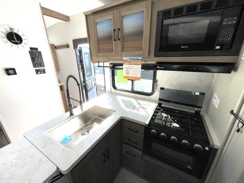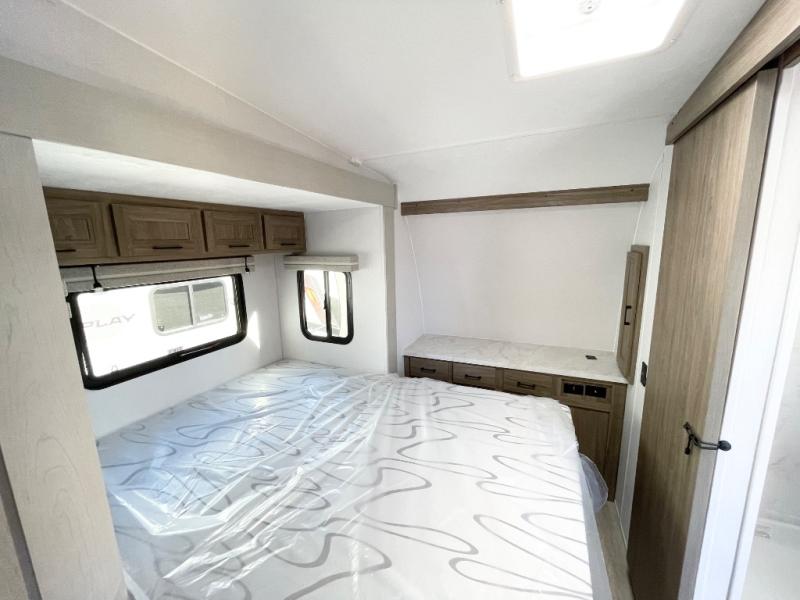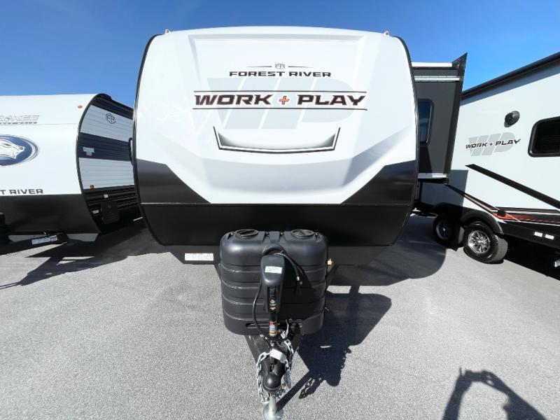 Each Work and Play toy hauler by Forest River is built tough with a mega rail powder coated chassis, a one-piece Tufflex PVC roof membrane, and a fiberglass front cap with rock guard. You will find many convenient features, such as a Winegard Air 360 and TV antenna, an outside spray port, and slam latch door catches to store your riding gear. These toy haulers also include hidden hinge cabinets and doors, USB charging ports in multiple locations, a tankless water heater, plus many more amenities!