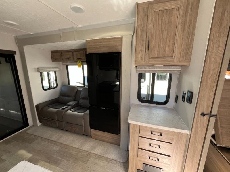 You will love the amount of space you have in this toy hauler with dual slides and dual entry doors. There is a spacious garage where you can load up dirt bikes, a side-by-side or kayaks, and the Zero Gravity ramp door will make unloading easier than ever. The front of this model is shared with the private bedroom and dual entry bath. You'll sleep soundly on the king bed slide out here, while your guests take the roll-over sofas in the garage. A combined kitchen and living area includes a theater seats within a slide, a hidden storage behind the TV, and all the appliances needed to create meals each day. This high profile model also features pull-down roller night shades, generator prep, a 300W solar panel, and more stand-out features!