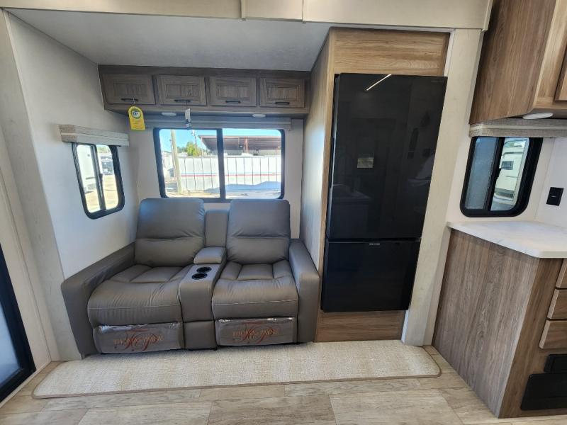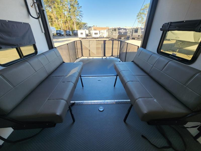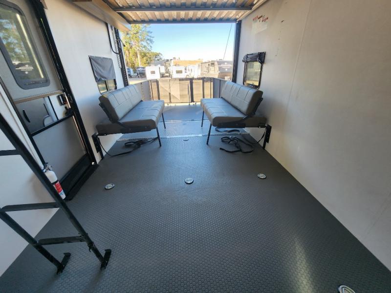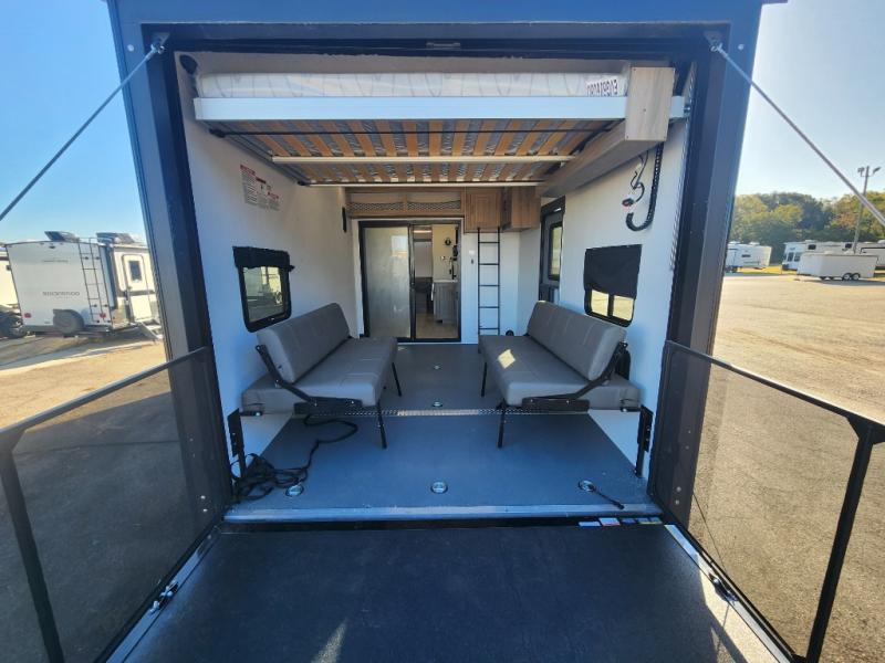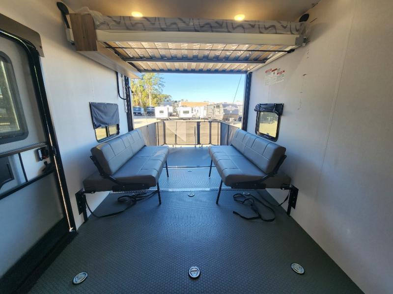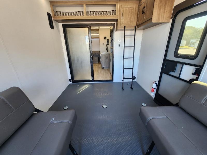 You will love the amount of space you have in this toy hauler with dual slides and dual entry doors. There is a spacious garage where you can load up dirt bikes, a side-by-side or kayaks, and the Zero Gravity ramp door will make unloading easier than ever. The front of this model is shared with the private bedroom and dual entry bath. You'll sleep soundly on the king bed slide out here, while your guests take the roll-over sofas in the garage. A combined kitchen and living area includes a theater seats within a slide, a hidden storage behind the TV, and all the appliances needed to create meals each day. This high profile model also features pull-down roller night shades, generator prep, a 300W solar panel, and more stand-out features!