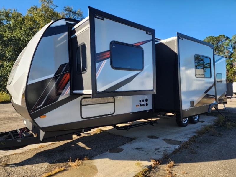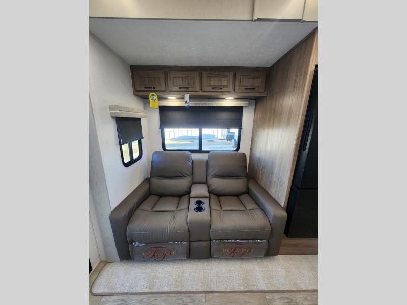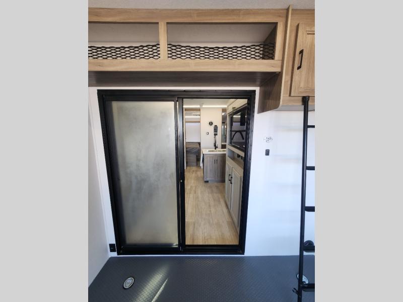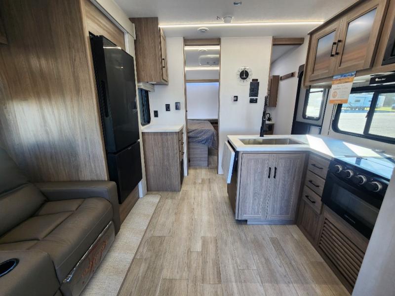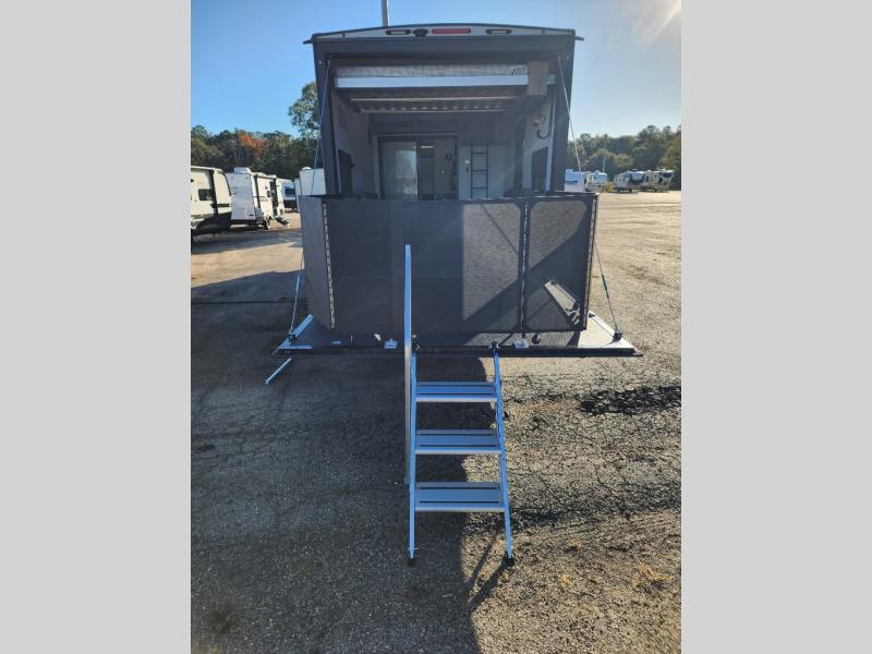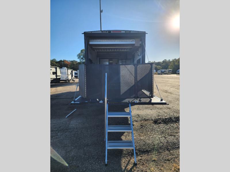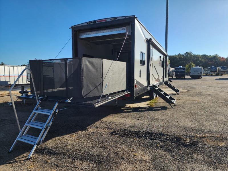 You will love the amount of space you have in this toy hauler with dual slides and dual entry doors. There is a spacious garage where you can load up dirt bikes, a side-by-side or kayaks, and the Zero Gravity ramp door will make unloading easier than ever. The front of this model is shared with the private bedroom and dual entry bath. You'll sleep soundly on the king bed slide out here, while your guests take the roll-over sofas in the garage. A combined kitchen and living area includes a theater seats within a slide, a hidden storage behind the TV, and all the appliances needed to create meals each day. This high profile model also features pull-down roller night shades, generator prep, a 300W solar panel, and more stand-out features!