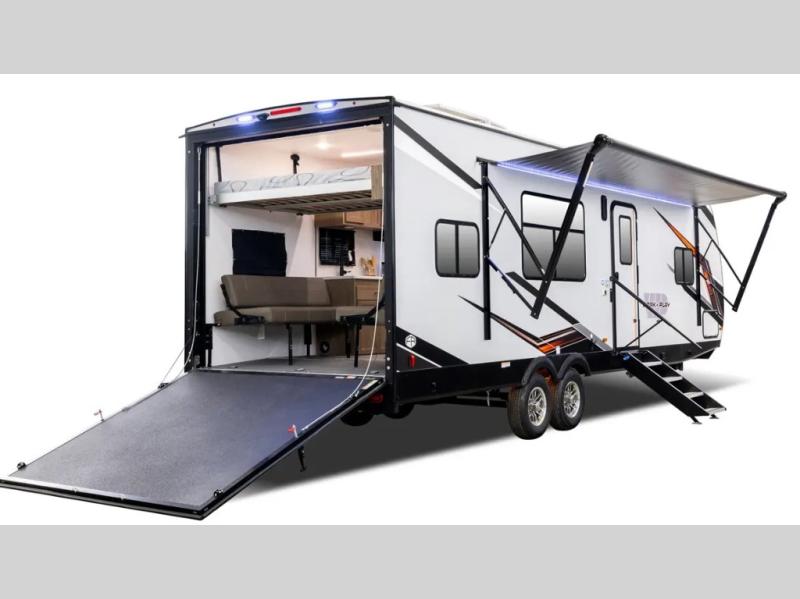 Each Work and Play toy hauler by Forest River is built tough with a mega rail powder coated chassis, a one-piece Tufflex PVC roof membrane, and a fiberglass front cap with rock guard. You will find many convenient features, such as a Winegard Air 360 and TV antenna, an outside spray port, and slam latch door catches to store your riding gear. These toy haulers also include hidden hinge cabinets and doors, USB charging ports in multiple locations, a tankless water heater, plus many more amenities!