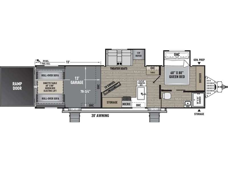 You will love the amount of space you have in this toy hauler with dual slides and dual entry doors. There is a spacious garage where you can load up dirt bikes, a side-by-side or kayaks, and the Zero Gravity ramp door will make unloading easier than ever. The front of this model is shared with the private bedroom and dual entry bath. You'll sleep soundly on the king bed slide out here, while your guests take the roll-over sofas in the garage. A combined kitchen and living area includes a theater seats within a slide, a hidden storage behind the TV, and all the appliances needed to create meals each day. This high profile model also features pull-down roller night shades, generator prep, a 300W solar panel, and more stand-out features!