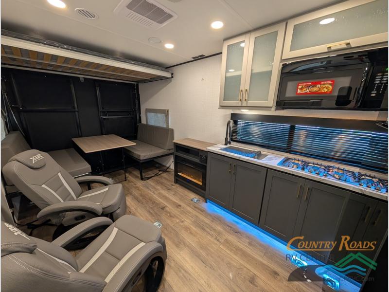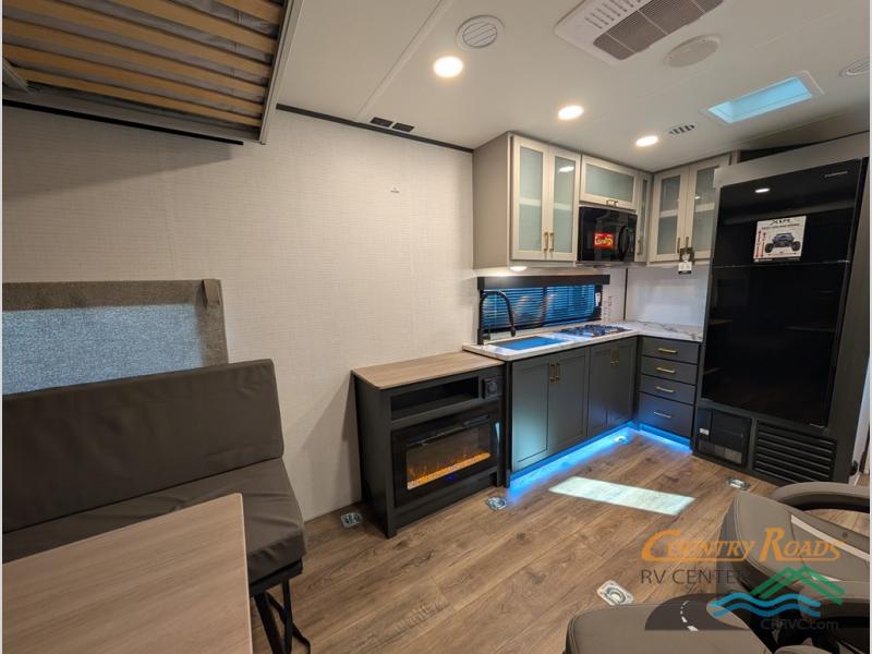 This toy hauler with a 14' 2" garage is sure to meet all your camping needs! Once you unload using the 3,000 lb. capacity ramp door, you can enjoy the 1,500 lb. capacity patio deck and enjoy a cold drink. There is seating space on the dual gaucho sofas with a table in between, and your guests can sleep on the queen-size Euro bed lift above. A full kitchen lets you cook meals each day, and the fireplace will make your space feel more like home. There is a spacious full bath where you can clean up each day, and the front private bedroom will feel just like home with its RV queen bed and generous storage space!