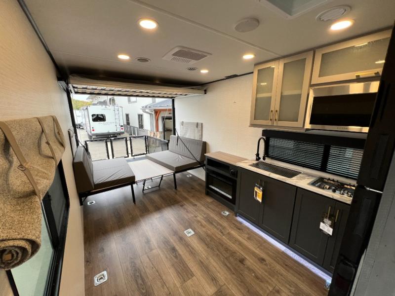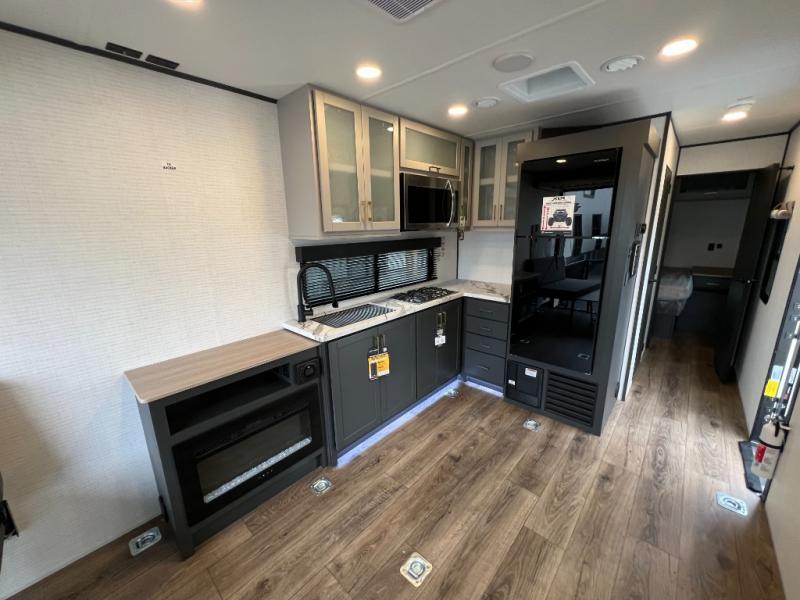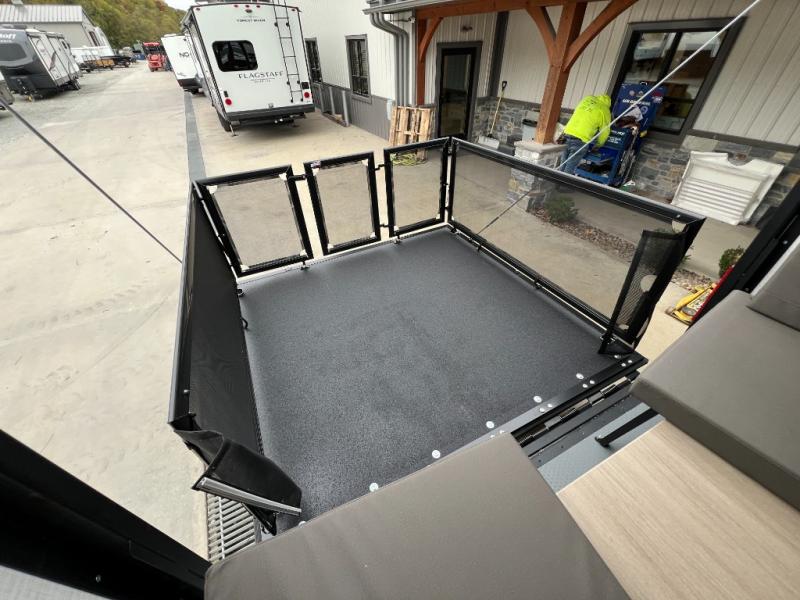 This toy hauler with a 14' 2" garage is sure to meet all your camping needs! Once you unload using the 3,000 lb. capacity ramp door, you can enjoy the 1,500 lb. capacity patio deck and enjoy a cold drink. There is seating space on the dual gaucho sofas with a table in between, and your guests can sleep on the queen-size Euro bed lift above. A full kitchen lets you cook meals each day, and the fireplace will make your space feel more like home. There is a spacious full bath where you can clean up each day, and the front private bedroom will feel just like home with its RV queen bed and generous storage space!