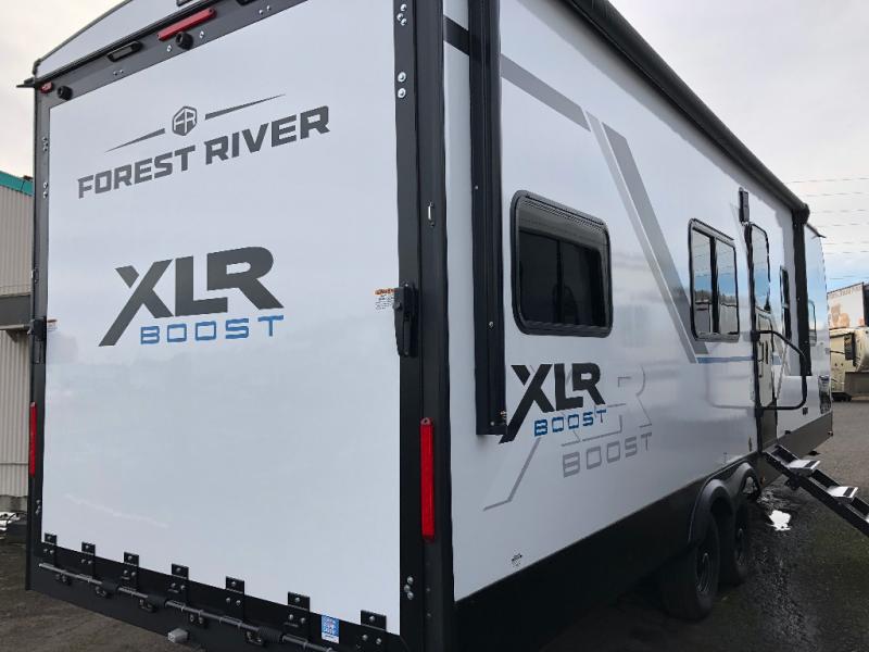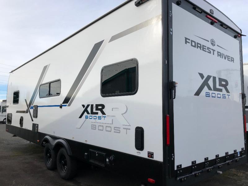 Boost into action camping with one of these Forest River XLR Boost fifth wheel toy haulers or travel trailer toy haulers! The 8' 5" wide body design not only provides ample interior space, but also packs in all of the luxurious features to make your trips great. There is fiberglass flooring insulation, a 35K BTU furnace and built-in vents within the mandatory Climate Comfort Package so you can camp all year around. The Convenience Package is also mandatory, and includes a tankless water heater, a French door black refrigerator and more features to make each trip accommodating. You will love the decorative kitchen backsplash inside, as well as a residential style kitchen faucet, a bath vent fan, and a USB charging station to keep your electronics charged and ready to go.