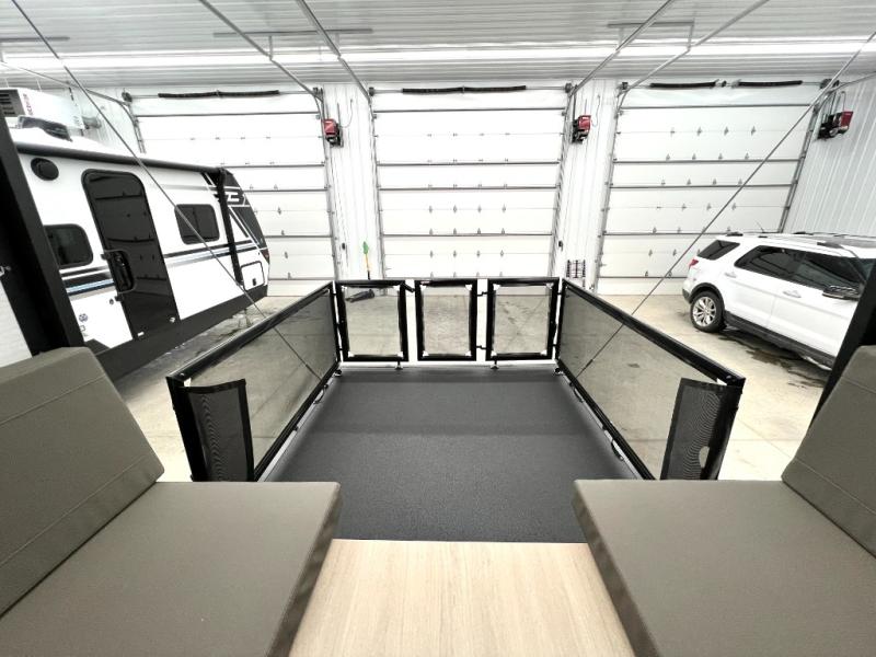 This toy hauler with a 14' 2" garage is sure to meet all your camping needs! Once you unload using the 3,000 lb. capacity ramp door, you can enjoy the 1,500 lb. capacity patio deck and enjoy a cold drink. There is seating space on the dual gaucho sofas with a table in between, and your guests can sleep on the queen-size Euro bed lift above. A full kitchen lets you cook meals each day, and the fireplace will make your space feel more like home. There is a spacious full bath where you can clean up each day, and the front private bedroom will feel just like home with its RV queen bed and generous storage space!