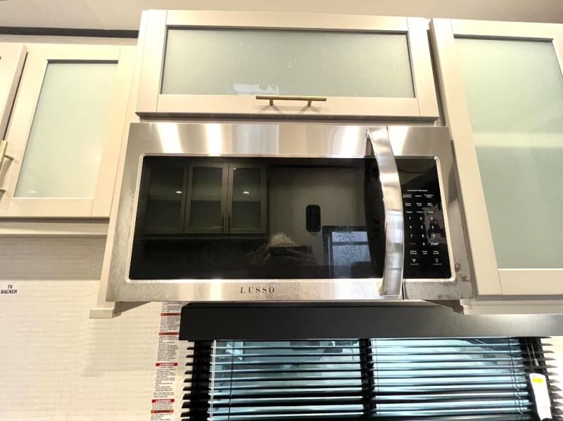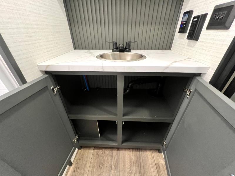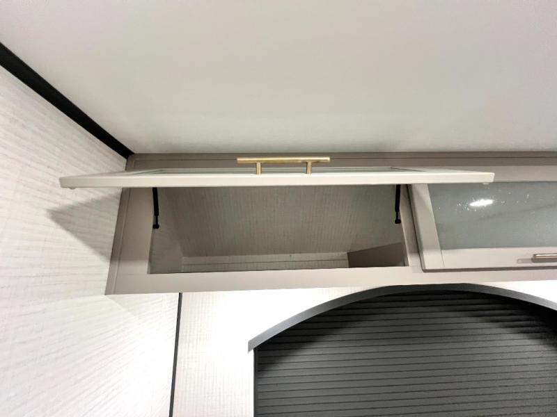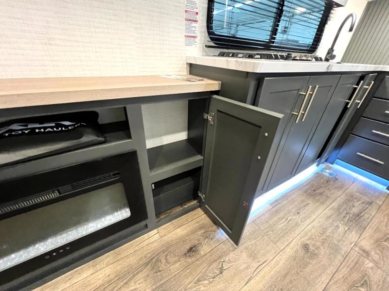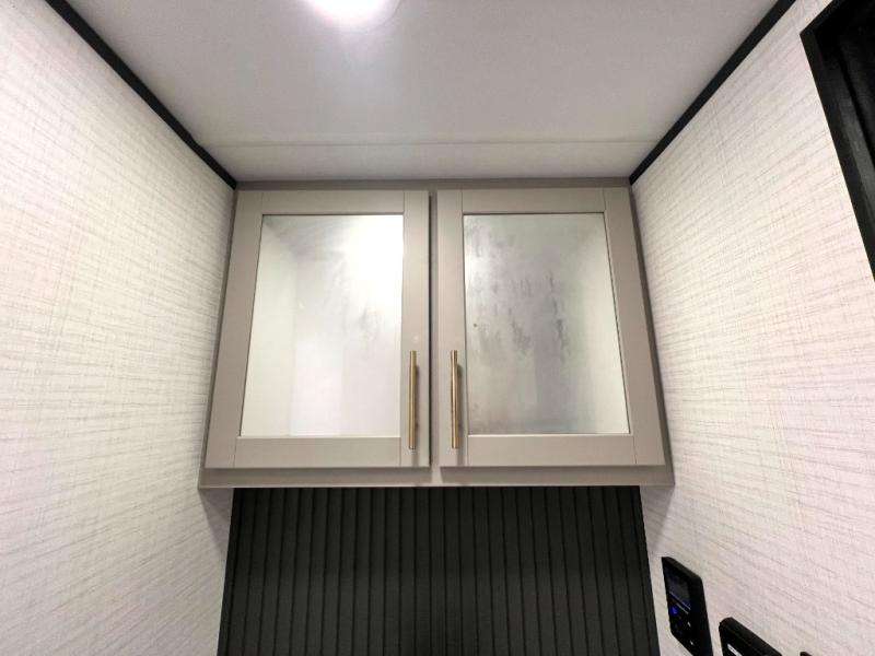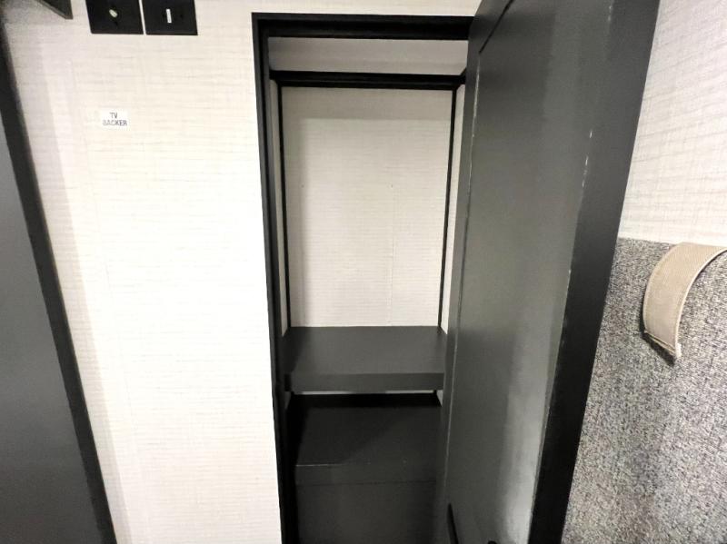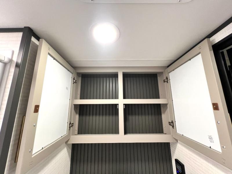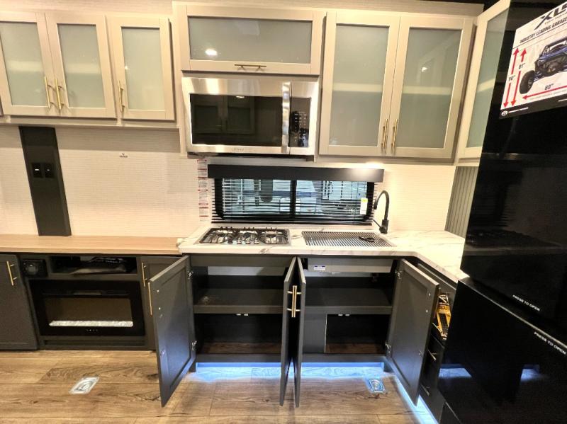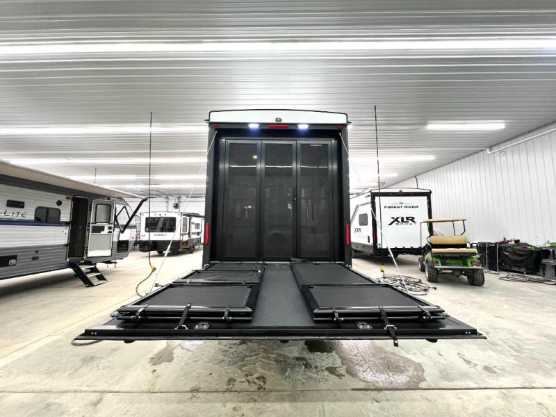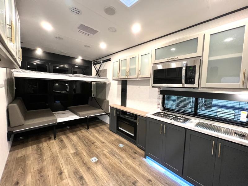 This toy hauler includes everything you need while at the campground. A front private bedroom includes an RV queen bed, dual nightstands and wardrobes plus a third wardrobe to keep your space tidy. The full bath will let you freshen up each day, and there is a convenient medicine cabinet to keep first aid items on hand. A three burner cooktop and microwave oven will be perfect to cook meals with, and there are dual gaucho sofas with a removable dinette table to dine at. Your guests can sleep here at night, along with the queen-size Euro lift bed above!