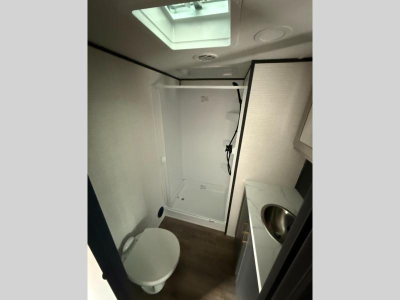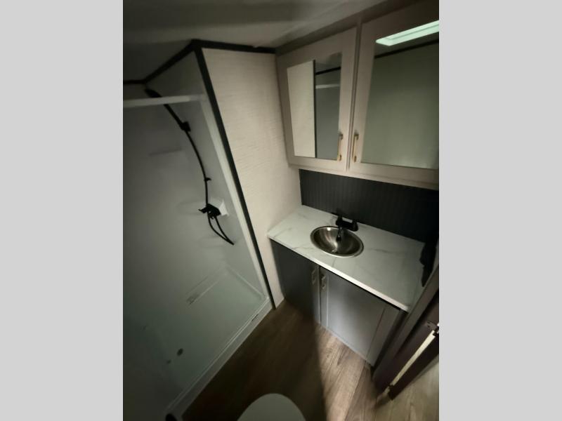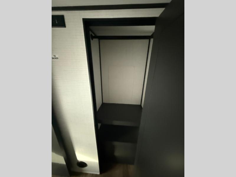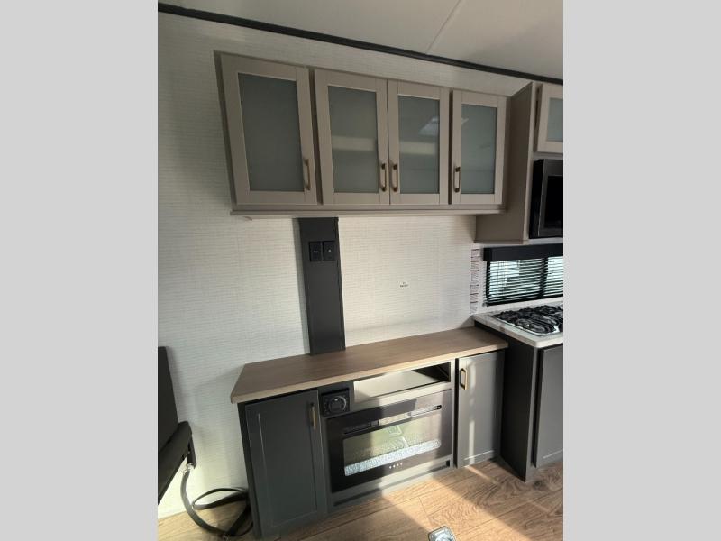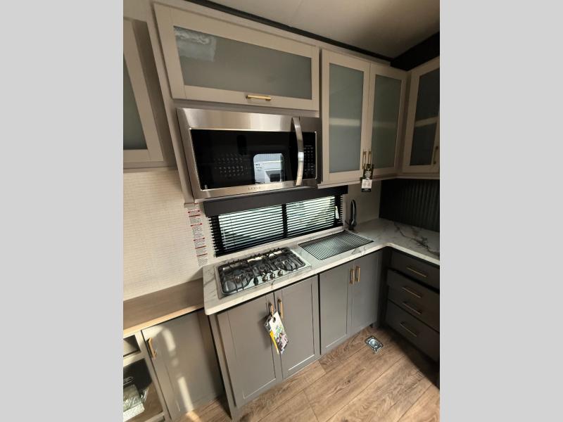 This toy hauler includes everything you need while at the campground. A front private bedroom includes an RV queen bed, dual nightstands and wardrobes plus a third wardrobe to keep your space tidy. The full bath will let you freshen up each day, and there is a convenient medicine cabinet to keep first aid items on hand. A three burner cooktop and microwave oven will be perfect to cook meals with, and there are dual gaucho sofas with a removable dinette table to dine at. Your guests can sleep here at night, along with the queen-size Euro lift bed above!