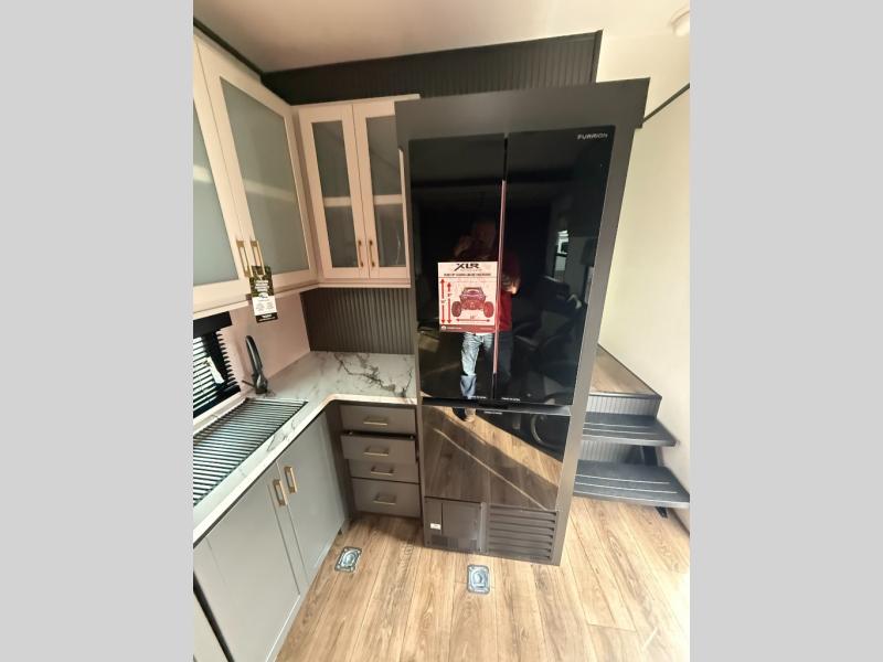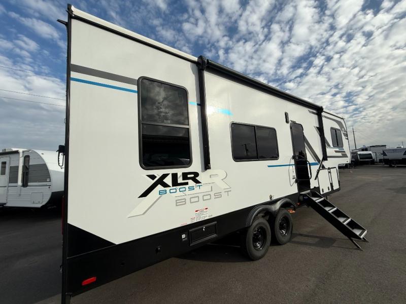 Boost into action camping with one of these Forest River XLR Boost fifth wheel toy haulers or travel trailer toy haulers! The 8' 5" wide body design not only provides ample interior space, but also packs in all of the luxurious features to make your trips great. There is fiberglass flooring insulation, a 35K BTU furnace and built-in vents within the mandatory Climate Comfort Package so you can camp all year around. The Convenience Package is also mandatory, and includes a tankless water heater, a French door black refrigerator and more features to make each trip accommodating. You will love the decorative kitchen backsplash inside, as well as a residential style kitchen faucet, a bath vent fan, and a USB charging station to keep your electronics charged and ready to go.