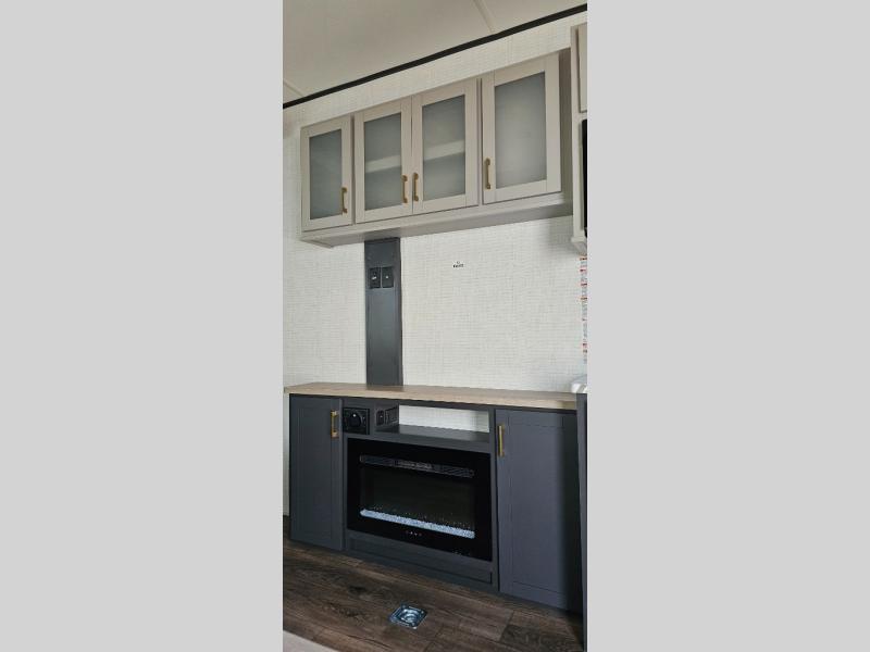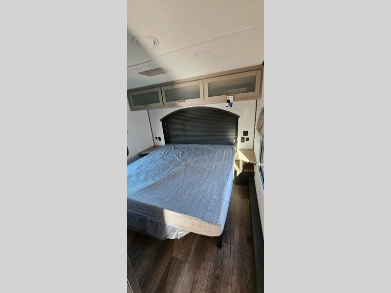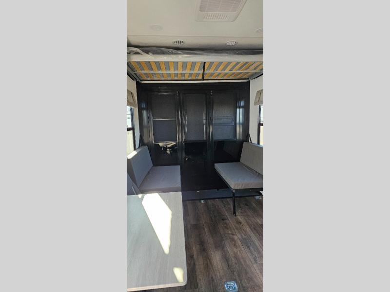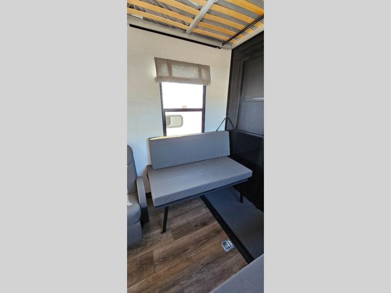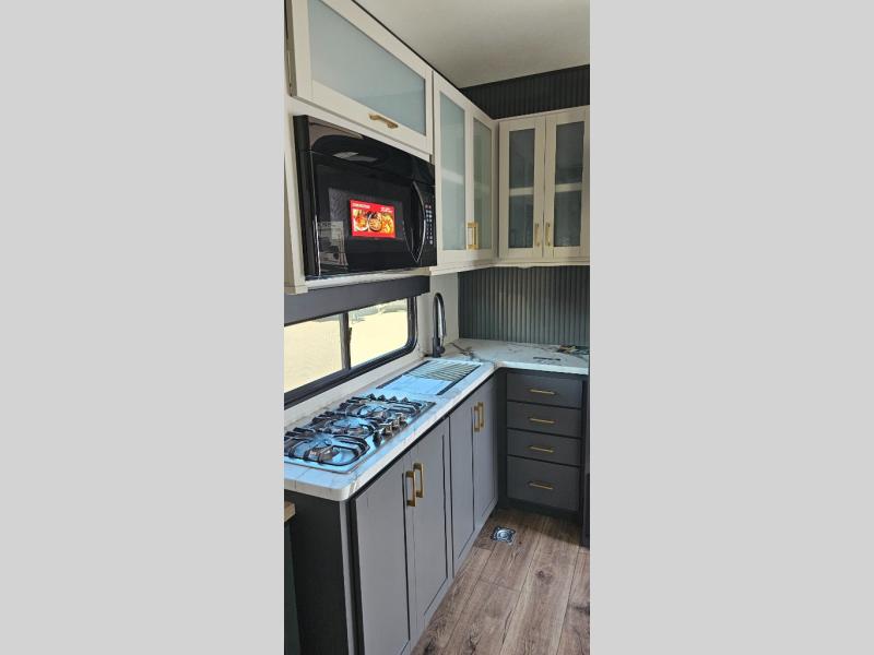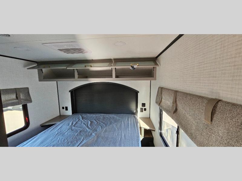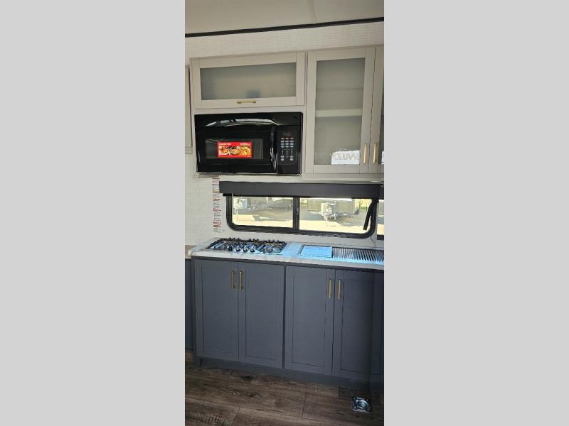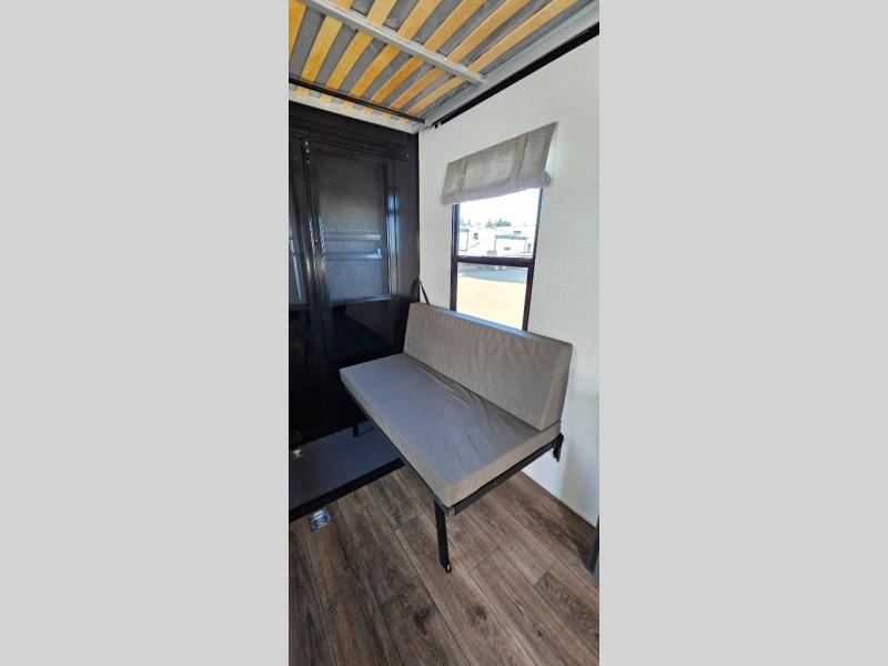 This toy hauler includes everything you need while at the campground. A front private bedroom includes an RV queen bed, dual nightstands and wardrobes plus a third wardrobe to keep your space tidy. The full bath will let you freshen up each day, and there is a convenient medicine cabinet to keep first aid items on hand. A three burner cooktop and microwave oven will be perfect to cook meals with, and there are dual gaucho sofas with a removable dinette table to dine at. Your guests can sleep here at night, along with the queen-size Euro lift bed above!