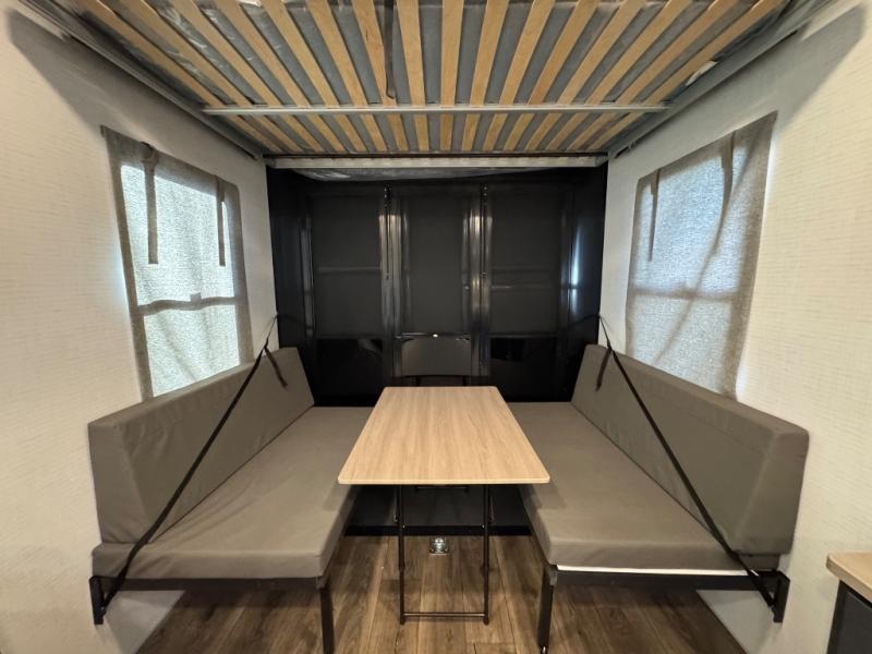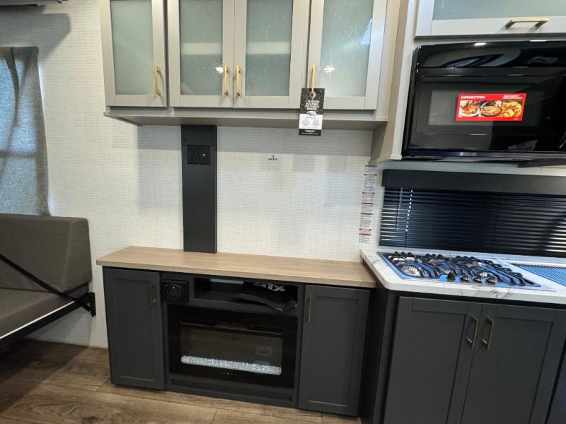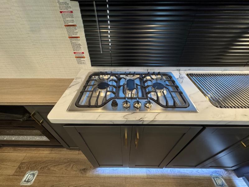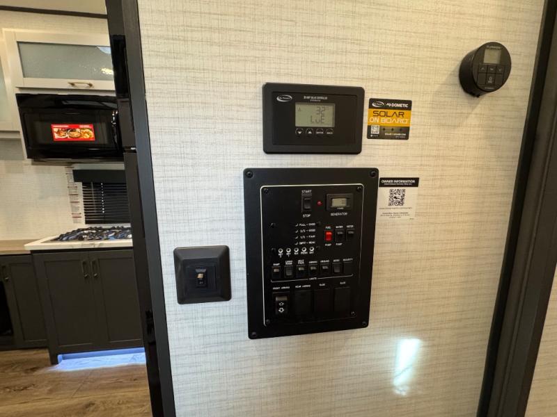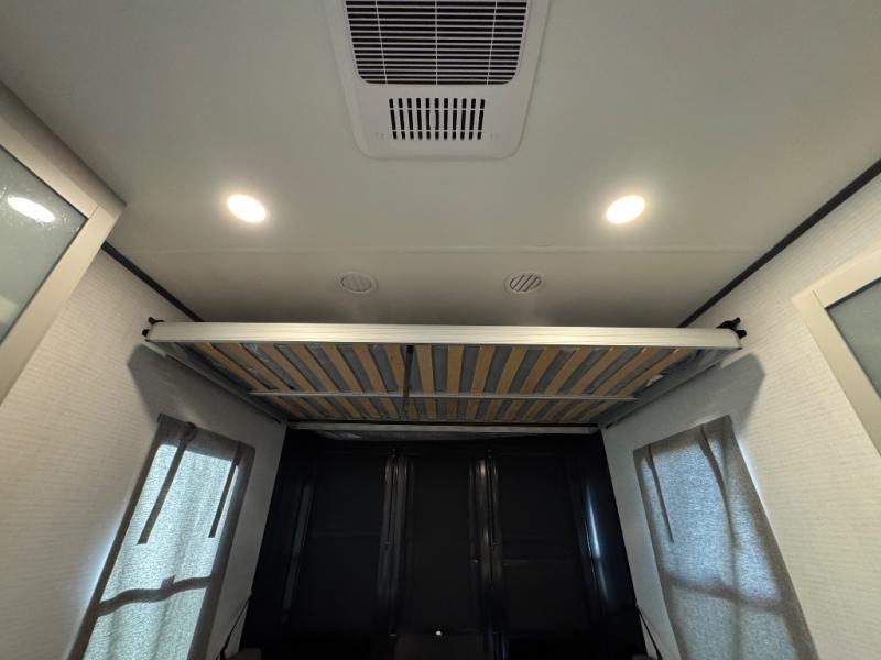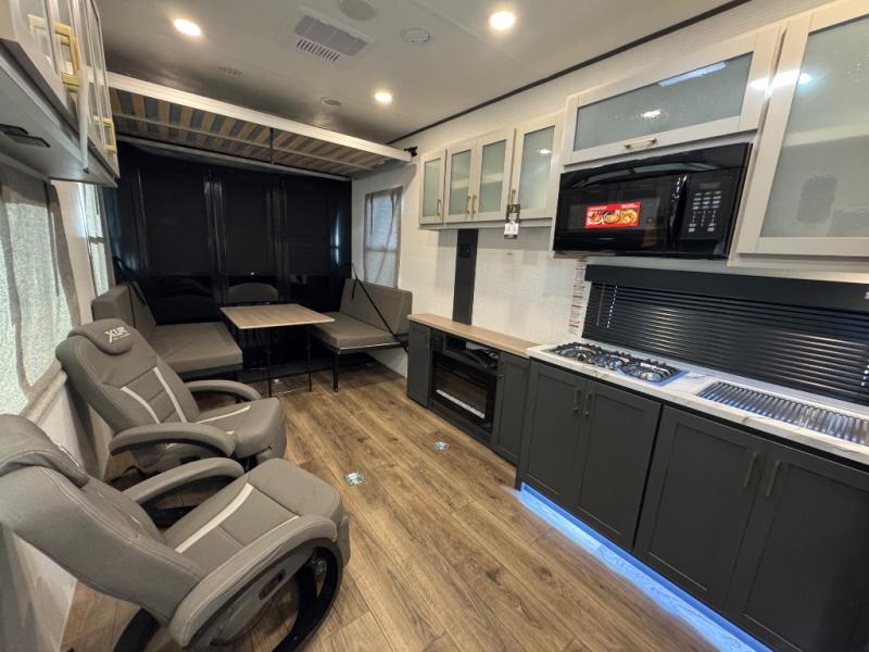 This toy hauler includes everything you need while at the campground. A front private bedroom includes an RV queen bed, dual nightstands and wardrobes plus a third wardrobe to keep your space tidy. The full bath will let you freshen up each day, and there is a convenient medicine cabinet to keep first aid items on hand. A three burner cooktop and microwave oven will be perfect to cook meals with, and there are dual gaucho sofas with a removable dinette table to dine at. Your guests can sleep here at night, along with the queen-size Euro lift bed above!
