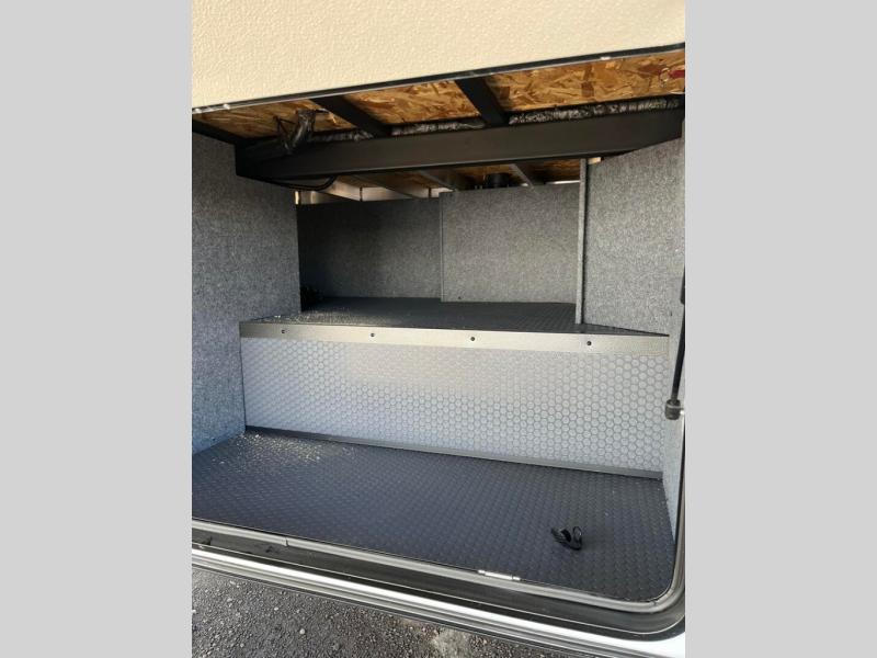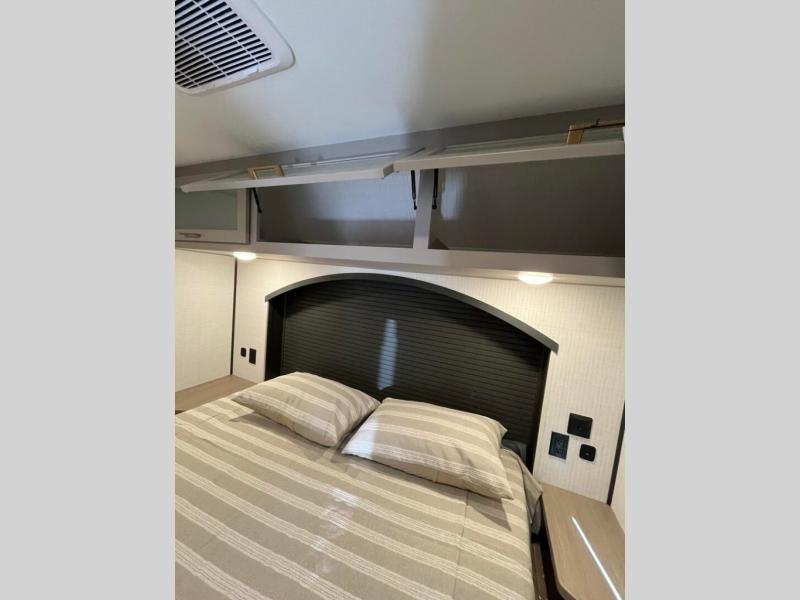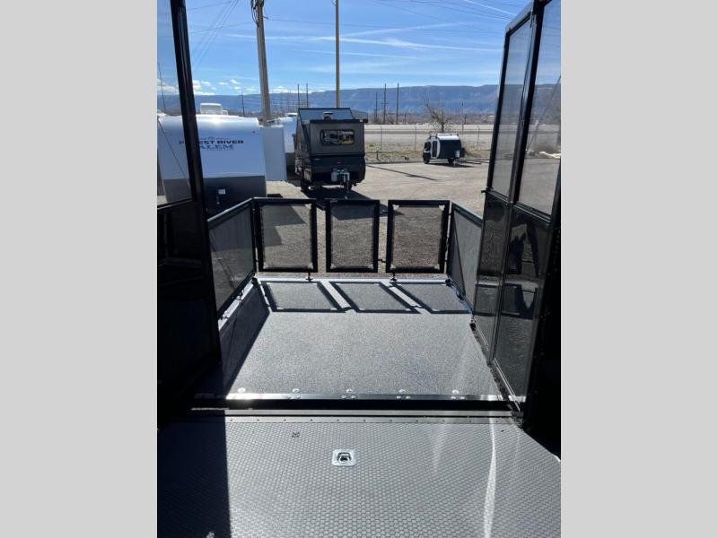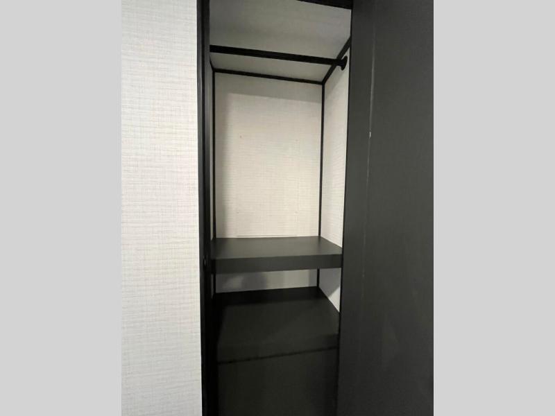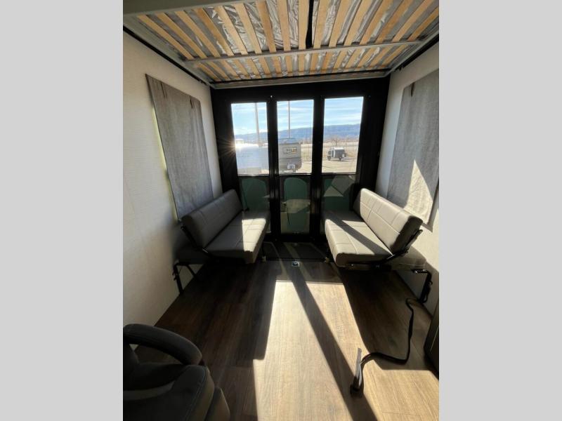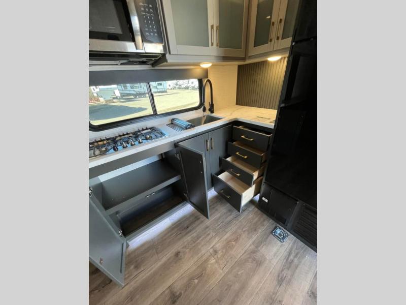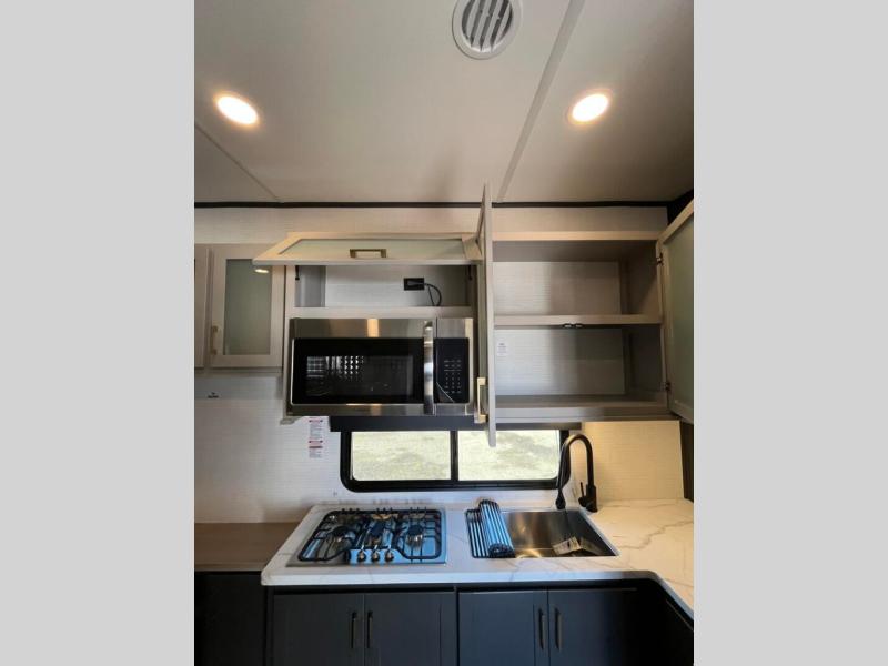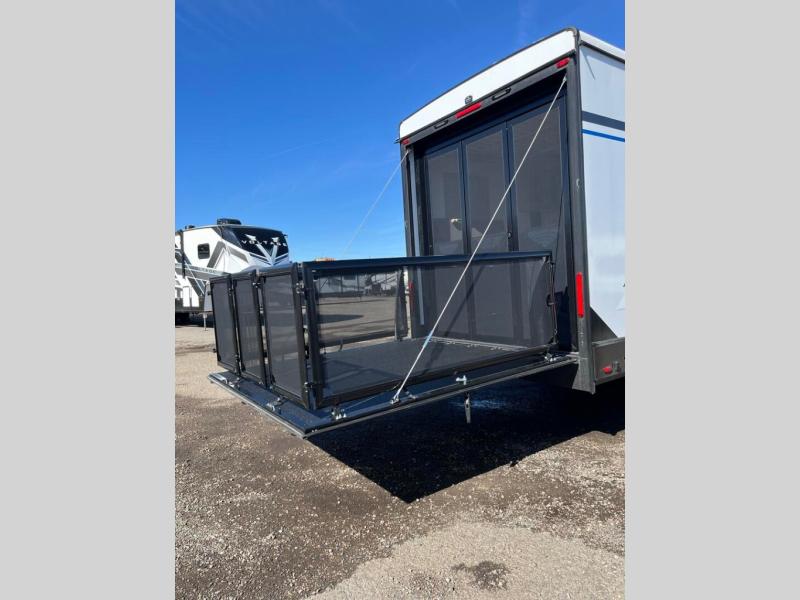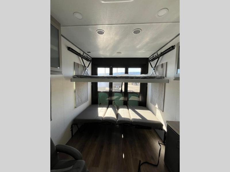 This toy hauler includes everything you need while at the campground. A front private bedroom includes an RV queen bed, dual nightstands and wardrobes plus a third wardrobe to keep your space tidy. The full bath will let you freshen up each day, and there is a convenient medicine cabinet to keep first aid items on hand. A three burner cooktop and microwave oven will be perfect to cook meals with, and there are dual gaucho sofas with a removable dinette table to dine at. Your guests can sleep here at night, along with the queen-size Euro lift bed above!