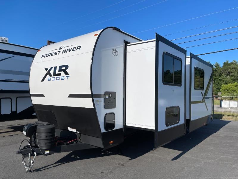 Boost into action camping with one of these Forest River XLR Boost fifth wheel toy haulers or travel trailer toy haulers! The 8' 6" wide body design not only provides ample interior space, but also packs in all of the luxurious features to make your trips great. There is Freon rigid urethane spray foam roof insulation and sidewall construction, along with fiberglass flooring insulation, and roof attic vents within the mandatory Climate Comfort Package so you can camp all year around. The Convenience Package is also mandatory, and includes a tankless water heater, back up camera prep, a 15K BTU main roof A/C, and more features to make each trip accommodating. You will love the decorative vinyl flooring and decorative kitchen backsplash included in the REV Package, as well as a residential style kitchen faucet, a large bath vent fan, and industrial garage flooring that will withstand your many adventures. A Renewable Energy Package includes a 200W roof mounted solar panel for off-grid capabilities, and there is an external fuel cell with a pump that will keep your toys ready to go!