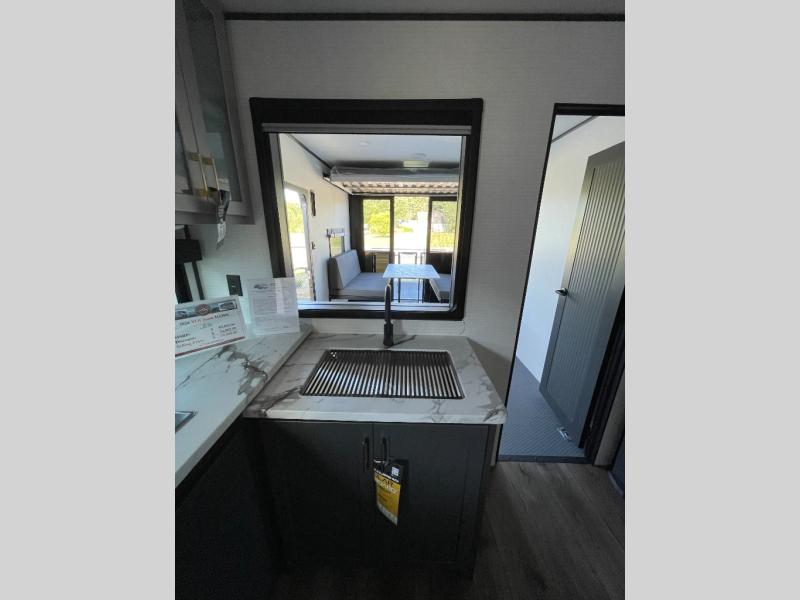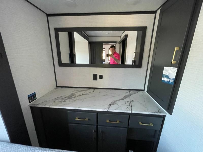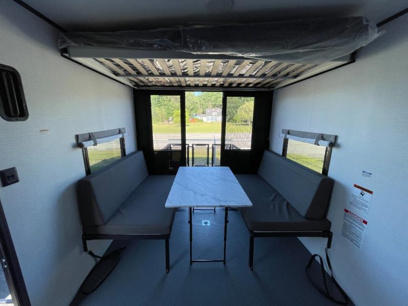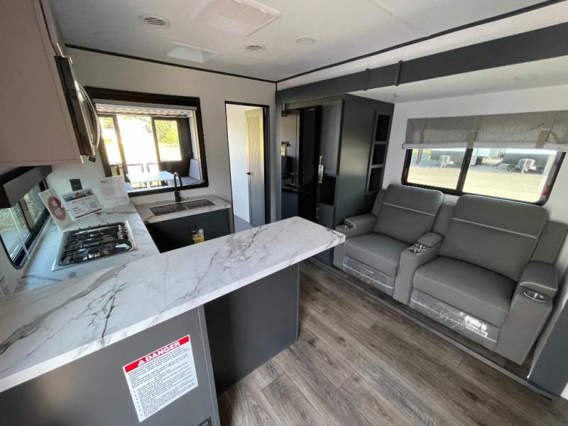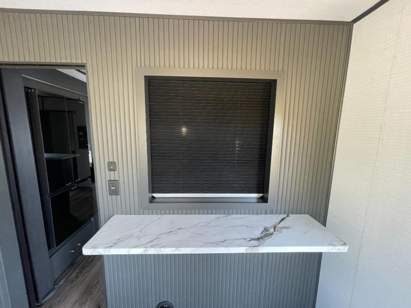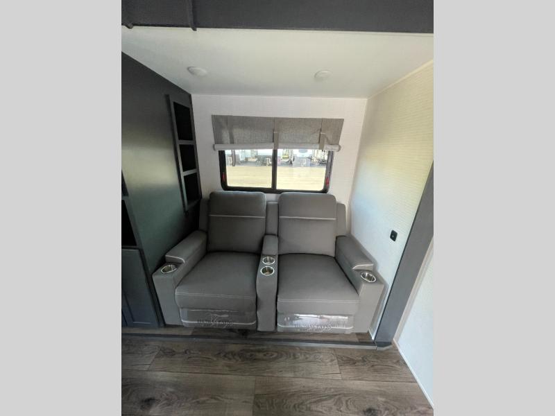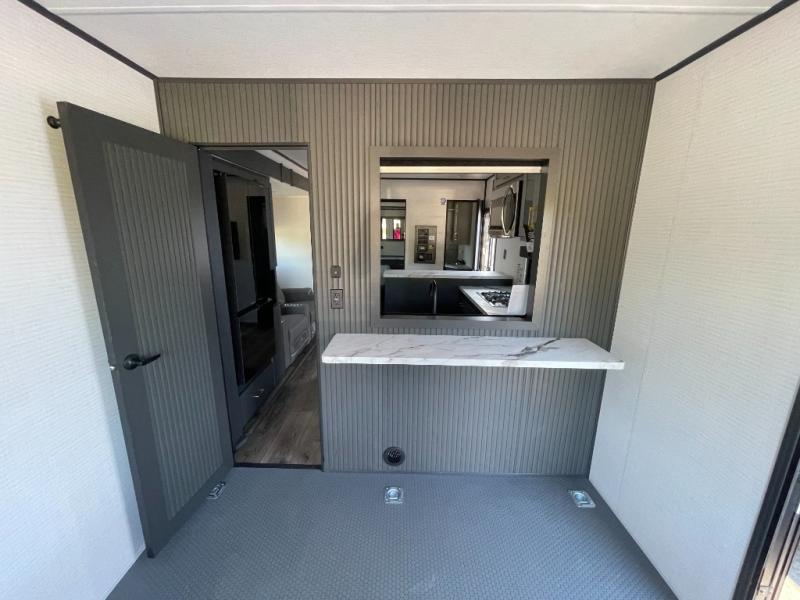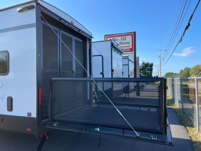 You are sure to love this toy hauler featuring 13' of toy parking space for your favorite ride-on toys, kayaks, or dirt bikes! In the garage area, you will find dual opposing sofas that create a queen bed at night, plus a Euro bed above for more guests to sleep on if needed. There are 5K tiedowns to completely secure your load for travel, and a bar top with two stools to hang out after a ride. Head to the main living/kitchen area to prepare a quick lunch on the three burner cooktop, then relax on the sofa within the slide. The front of this toy hauler master bedroom shares the space with the dual entry bath you are sure to love, plus there is a dresser with a mirror to get ready each day, and TV prep in this space. The exterior has many features you will love like the docking station, the outside TV prep area, power awning, as well as ample storage! The rear ramp can also offer you a 1,500 lb. capacity party deck outdoors to enjoy!