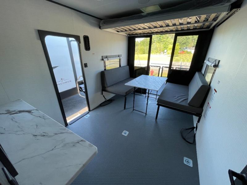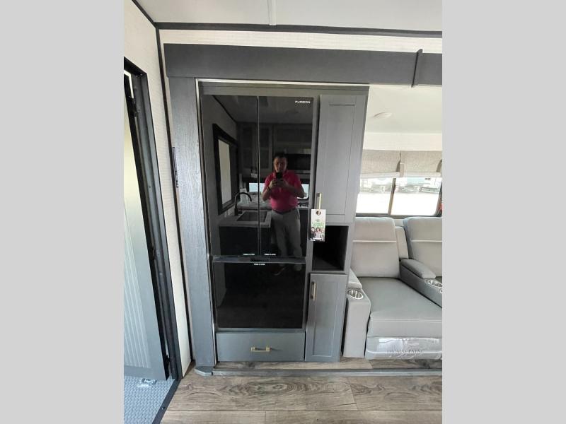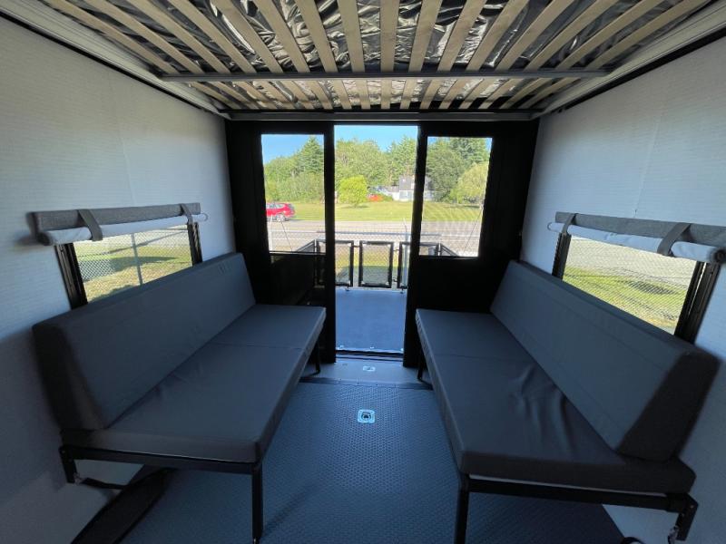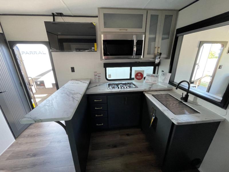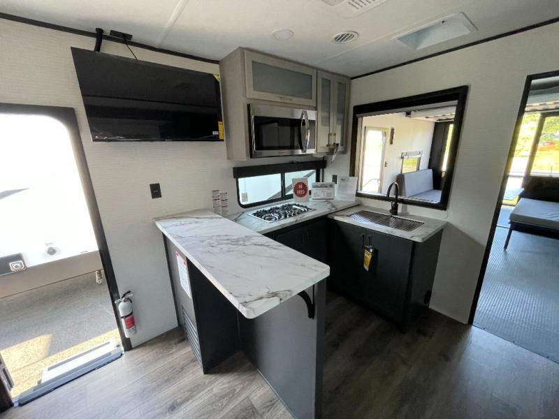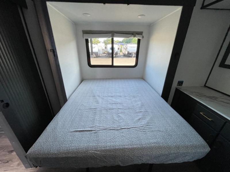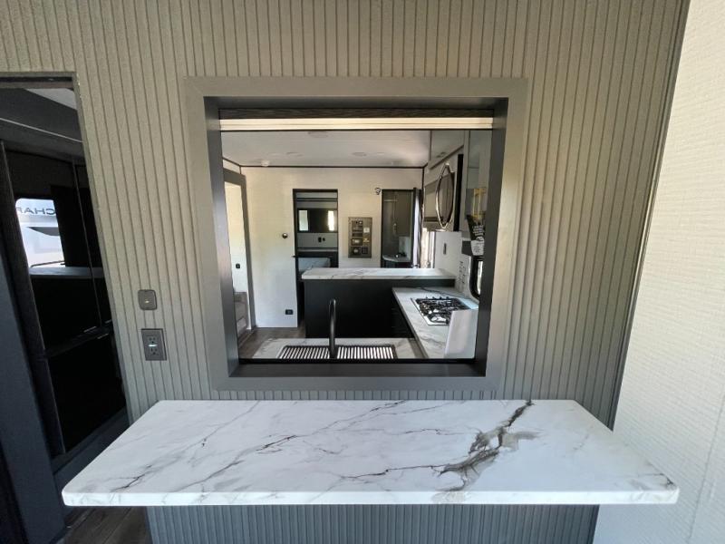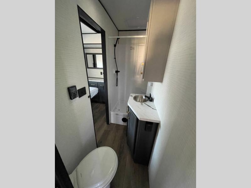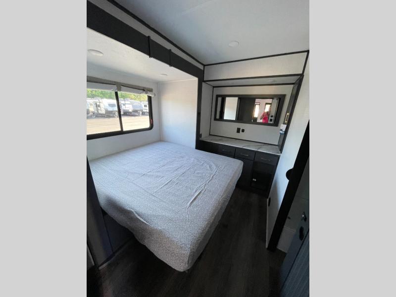 You are sure to love this toy hauler featuring 13' of toy parking space for your favorite ride-on toys, kayaks, or dirt bikes! In the garage area, you will find dual opposing sofas that create a queen bed at night, plus a Euro bed above for more guests to sleep on if needed. There are 5K tiedowns to completely secure your load for travel, and a bar top with two stools to hang out after a ride. Head to the main living/kitchen area to prepare a quick lunch on the three burner cooktop, then relax on the sofa within the slide. The front of this toy hauler master bedroom shares the space with the dual entry bath you are sure to love, plus there is a dresser with a mirror to get ready each day, and TV prep in this space. The exterior has many features you will love like the docking station, the outside TV prep area, power awning, as well as ample storage! The rear ramp can also offer you a 1,500 lb. capacity party deck outdoors to enjoy!
