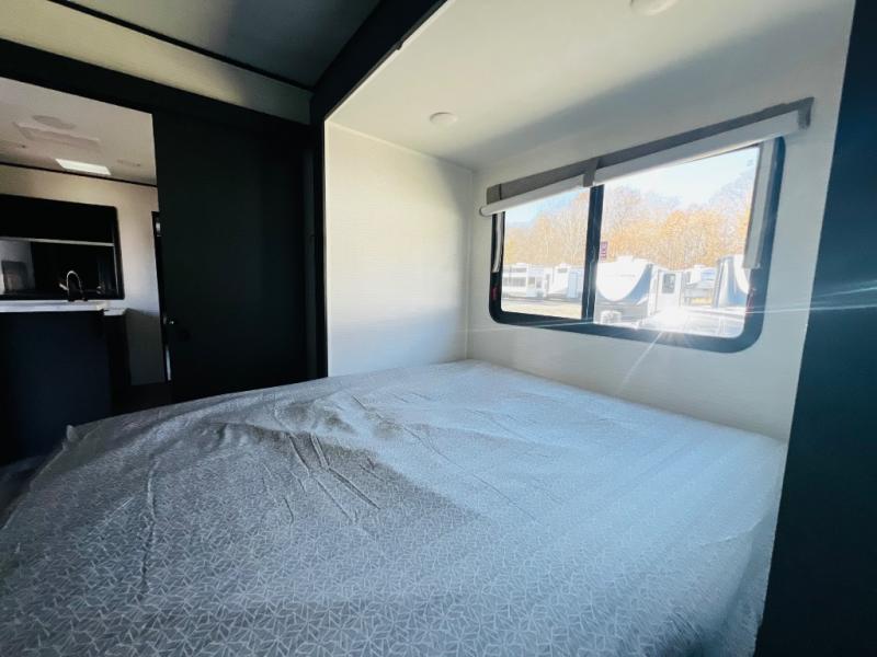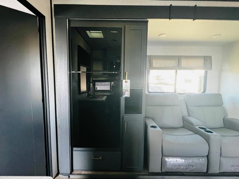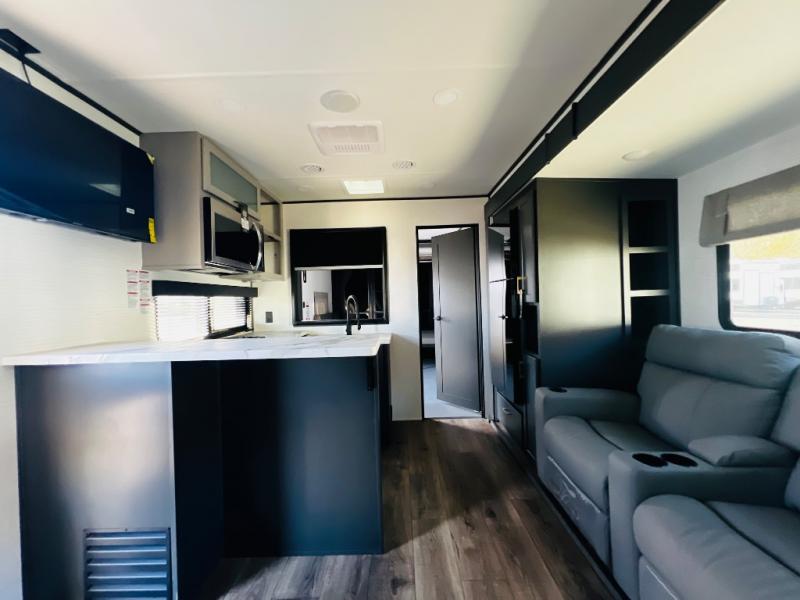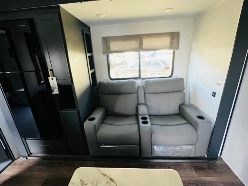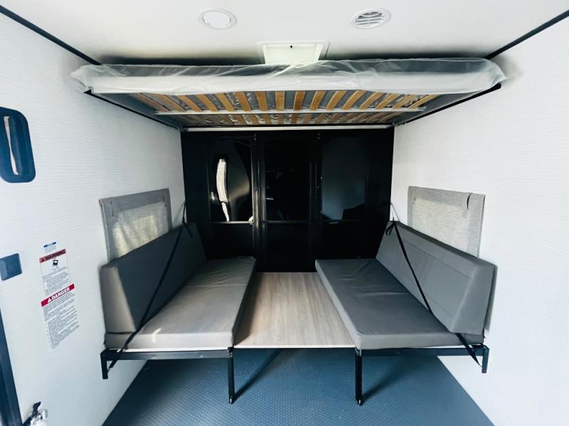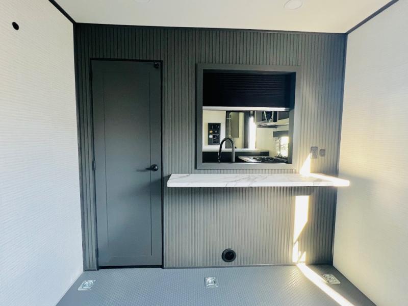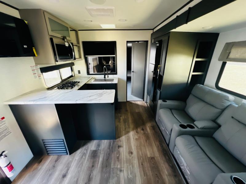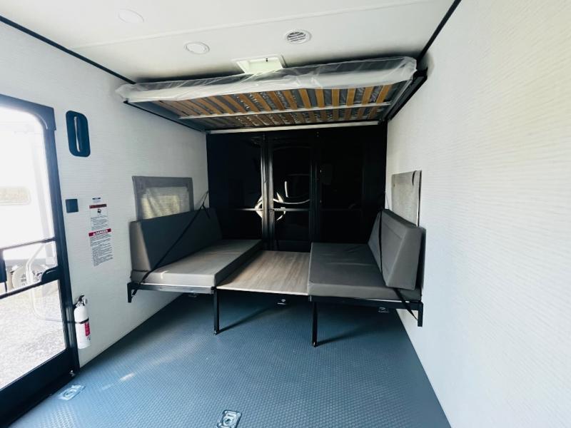You are sure to love this toy hauler featuring 13' of toy parking space for your favorite ride-on toys, kayaks, or dirt bikes! In the garage area, you will find dual opposing sofas that create a queen bed at night, plus a Euro bed above for more guests to sleep on if needed. There are 5K tiedowns to completely secure your load for travel, and a bar top with two stools to hang out after a ride. Head to the main living/kitchen area to prepare a quick lunch on the three burner cooktop, then relax on the sofa within the slide. The front of this toy hauler master bedroom shares the space with the dual entry bath you are sure to love, plus there is a dresser with a mirror to get ready each day, and TV prep in this space. The exterior has many features you will love like the docking station, power awning, as well as ample storage! The rear ramp can also offer you a 1,500 lb. capacity party deck outdoors to enjoy!