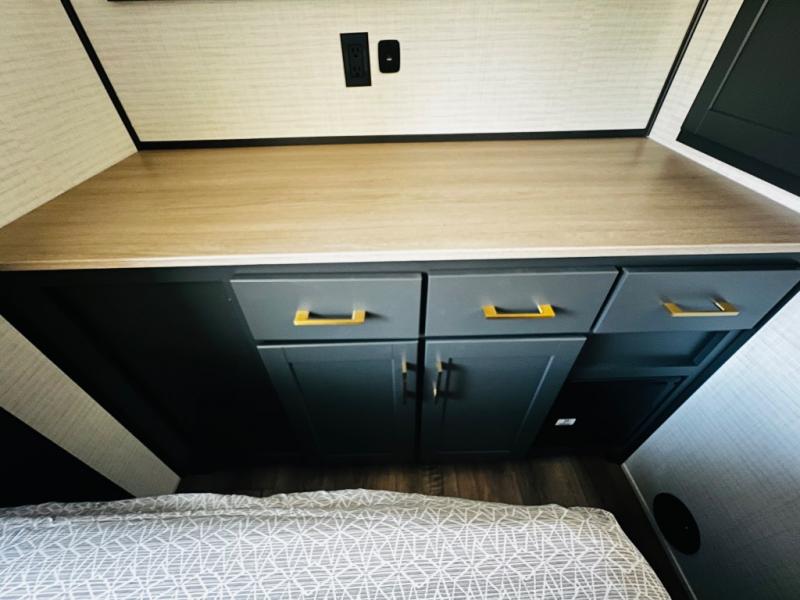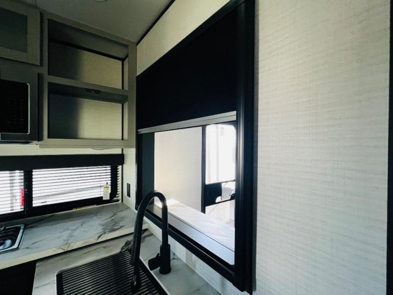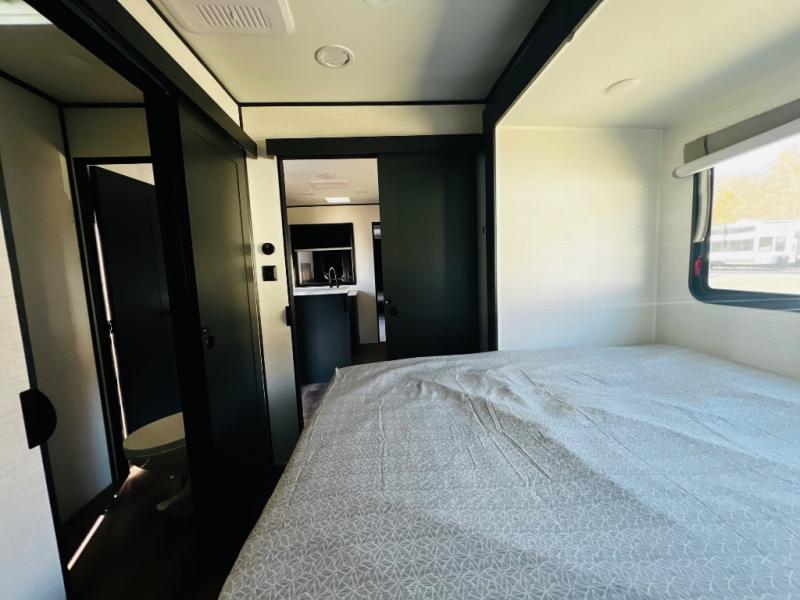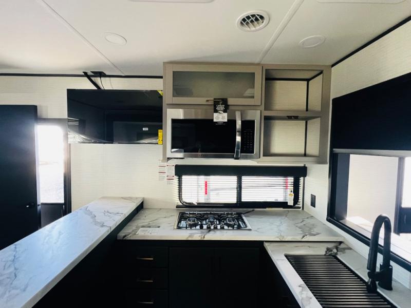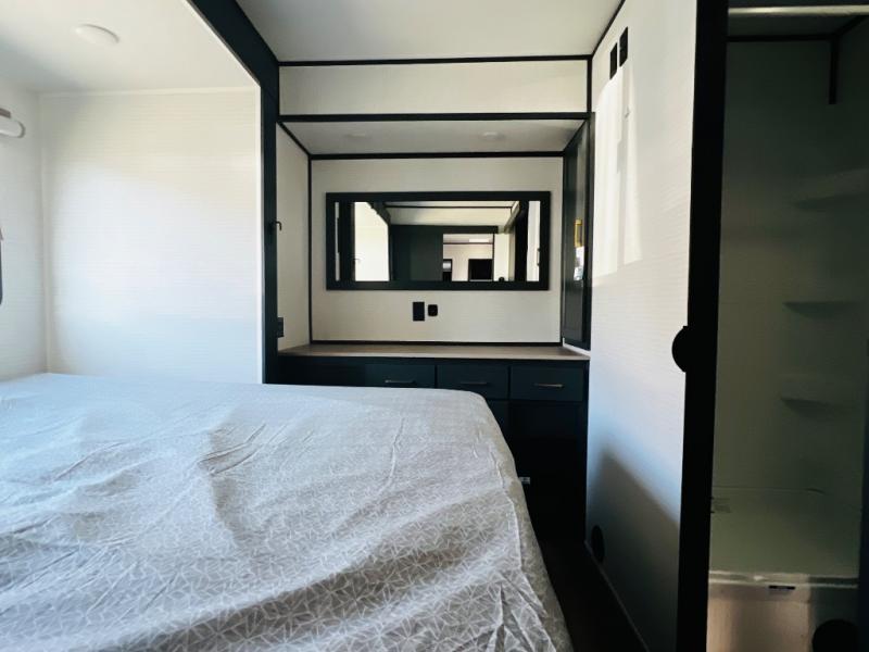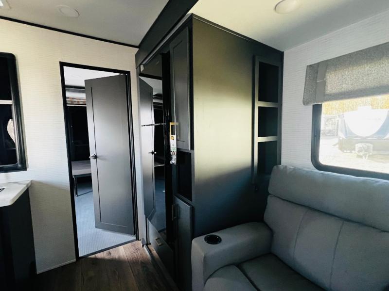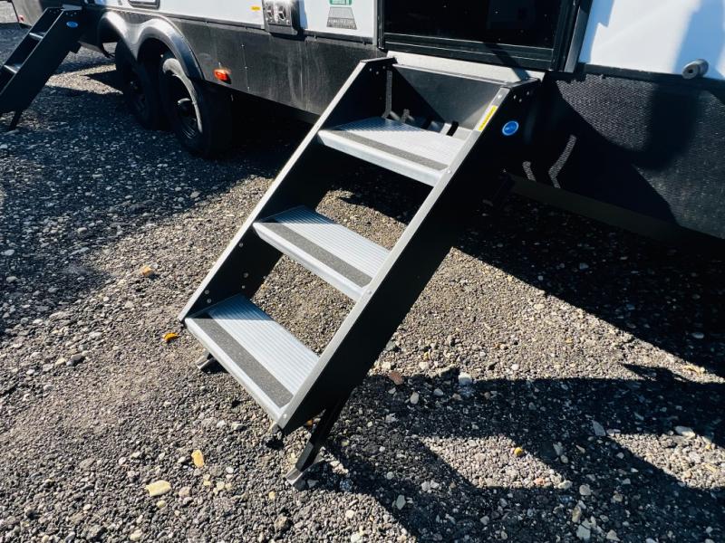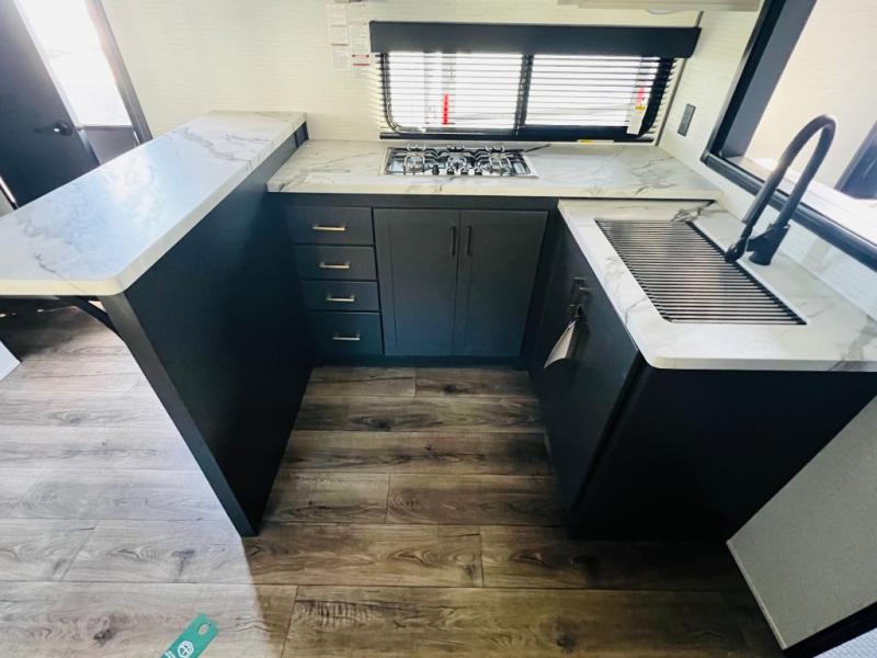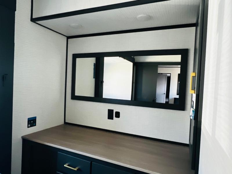 You are sure to love this toy hauler featuring 13' of toy parking space for your favorite ride-on toys, kayaks, or dirt bikes! In the garage area, you will find dual opposing sofas that create a queen bed at night, plus a Euro bed above for more guests to sleep on if needed. There are 5K tiedowns to completely secure your load for travel, and a bar top with two stools to hang out after a ride. Head to the main living/kitchen area to prepare a quick lunch on the three burner cooktop, then relax on the sofa within the slide. The front of this toy hauler master bedroom shares the space with the dual entry bath you are sure to love, plus there is a dresser with a mirror to get ready each day, and TV prep in this space. The exterior has many features you will love like the docking station, power awning, as well as ample storage! The rear ramp can also offer you a 1,500 lb. capacity party deck outdoors to enjoy!