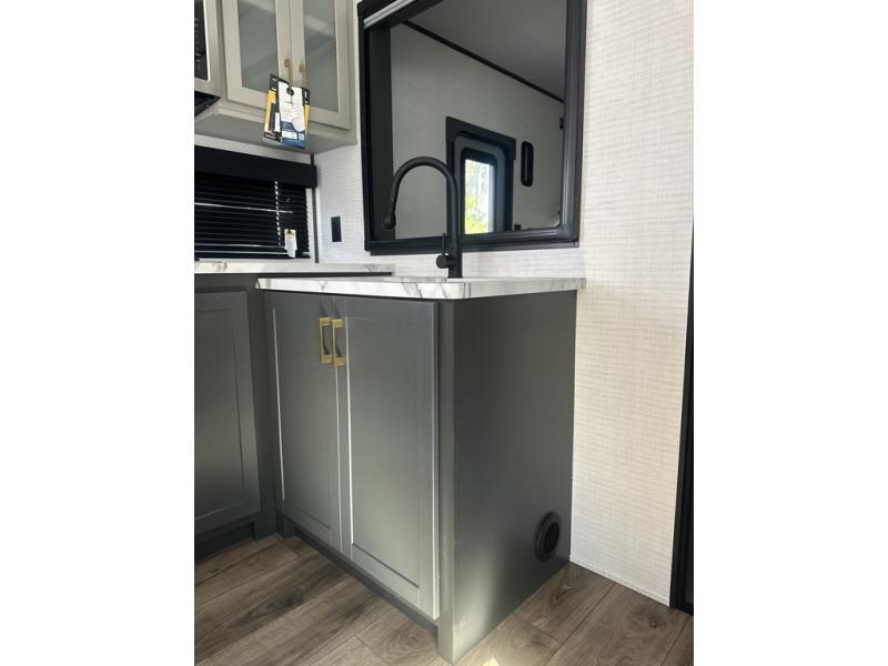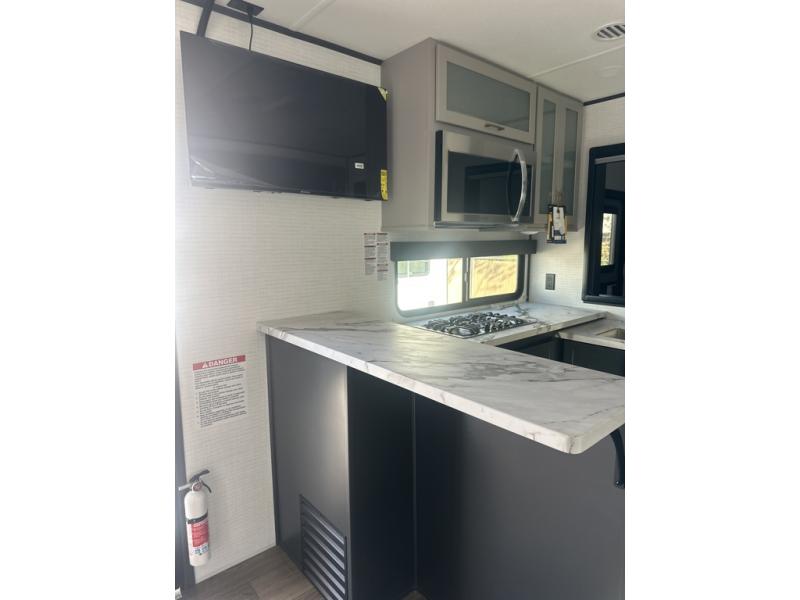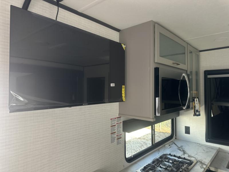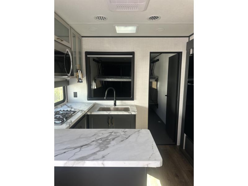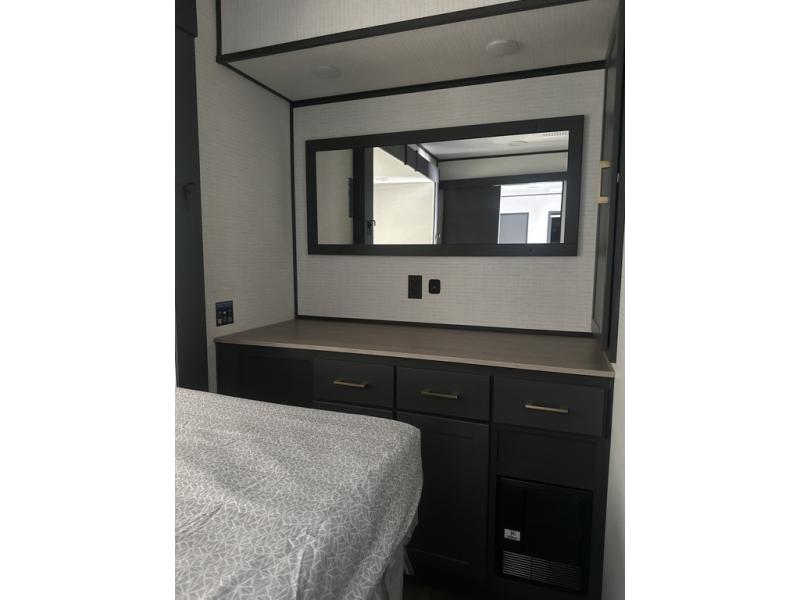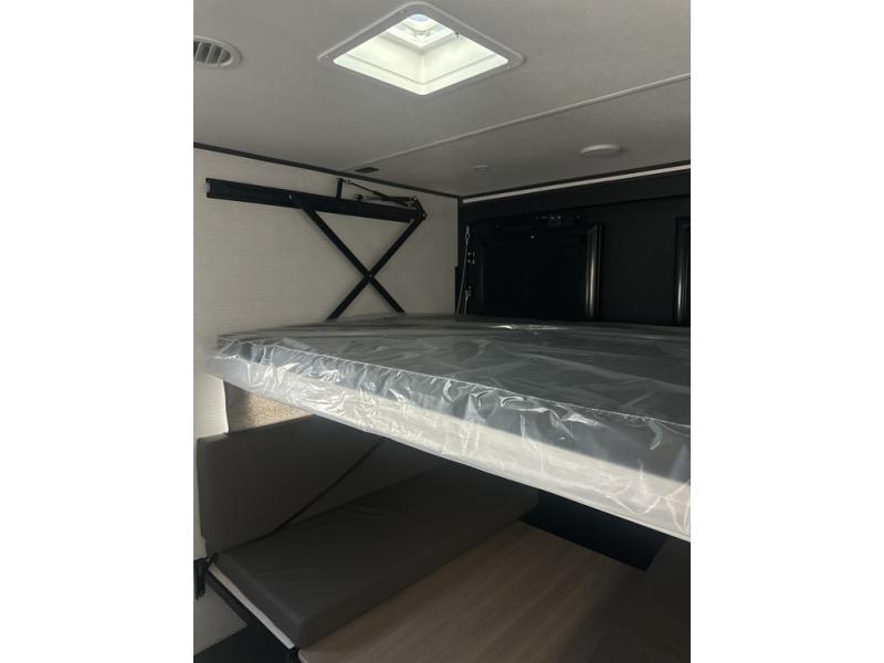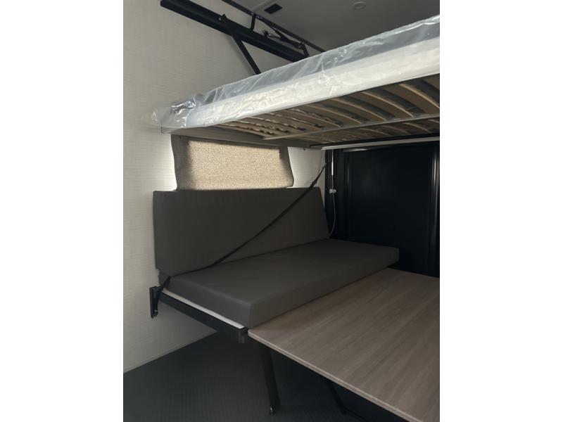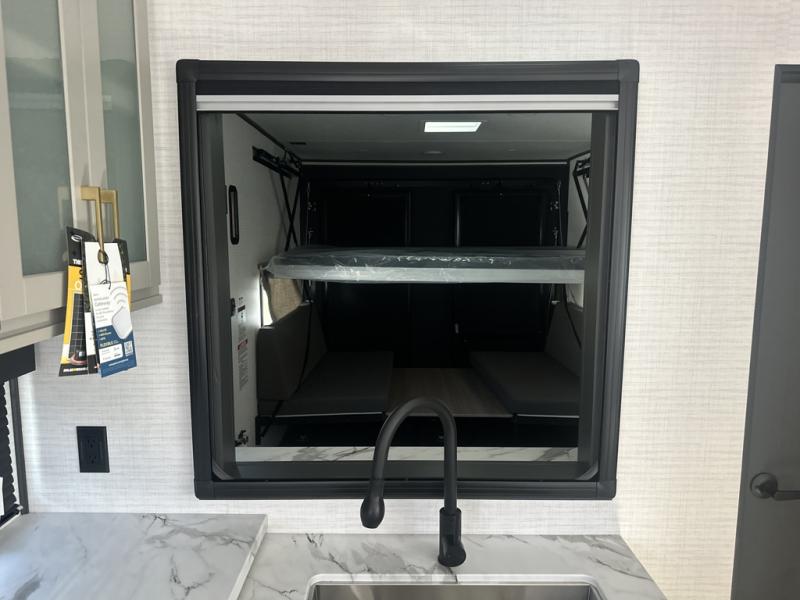 You are sure to love this toy hauler featuring 13' of toy parking space for your favorite ride-on toys, kayaks, or dirt bikes! In the garage area, you will find dual opposing sofas that create a queen bed at night, plus a Euro bed above for more guests to sleep on if needed. There are 5K tiedowns to completely secure your load for travel, and a bar top with two stools to hang out after a ride. Head to the main living/kitchen area to prepare a quick lunch on the three burner cooktop, then relax on the sofa within the slide. The front of this toy hauler master bedroom shares the space with the dual entry bath you are sure to love, plus there is a dresser with a mirror to get ready each day, and TV prep in this space. The exterior has many features you will love like the docking station, power awning, as well as ample storage! The rear ramp can also offer you a 1,500 lb. capacity party deck outdoors to enjoy!