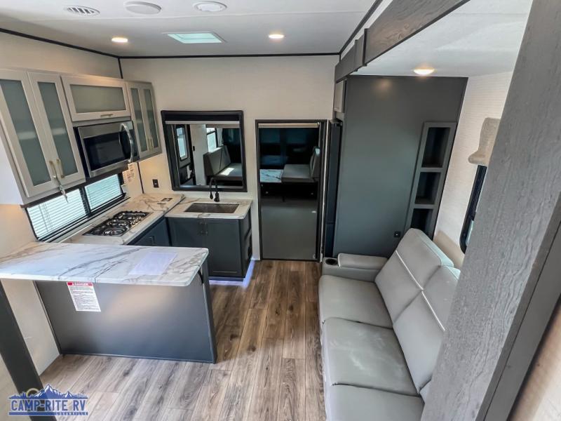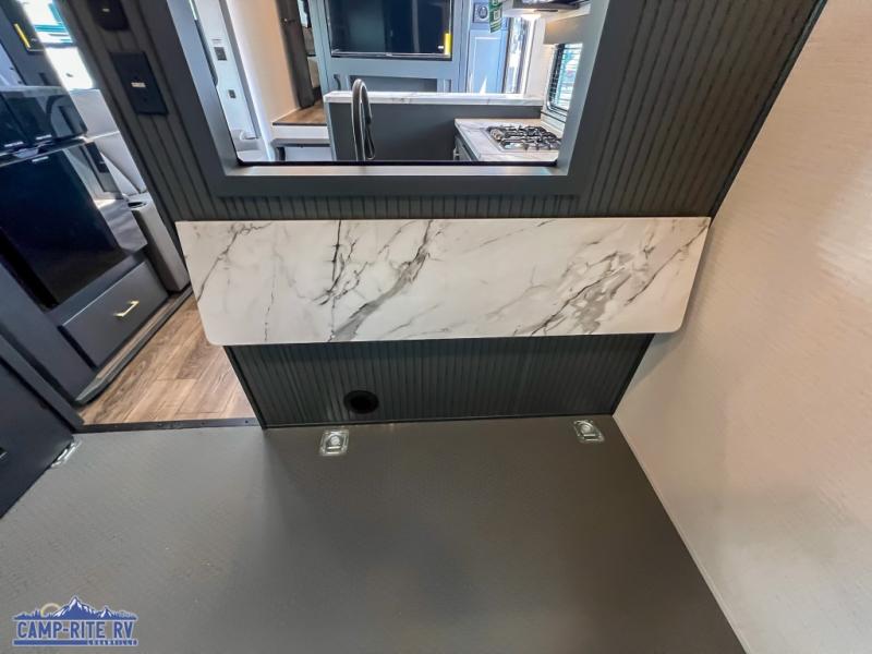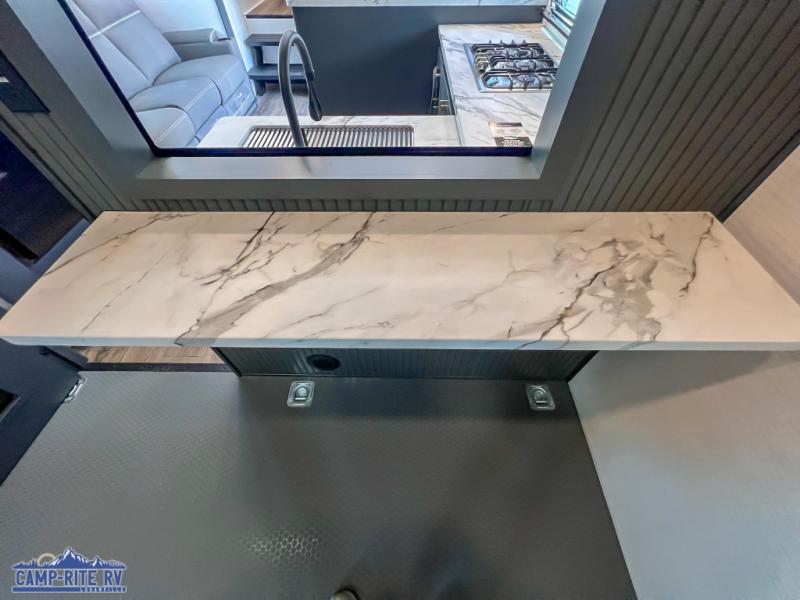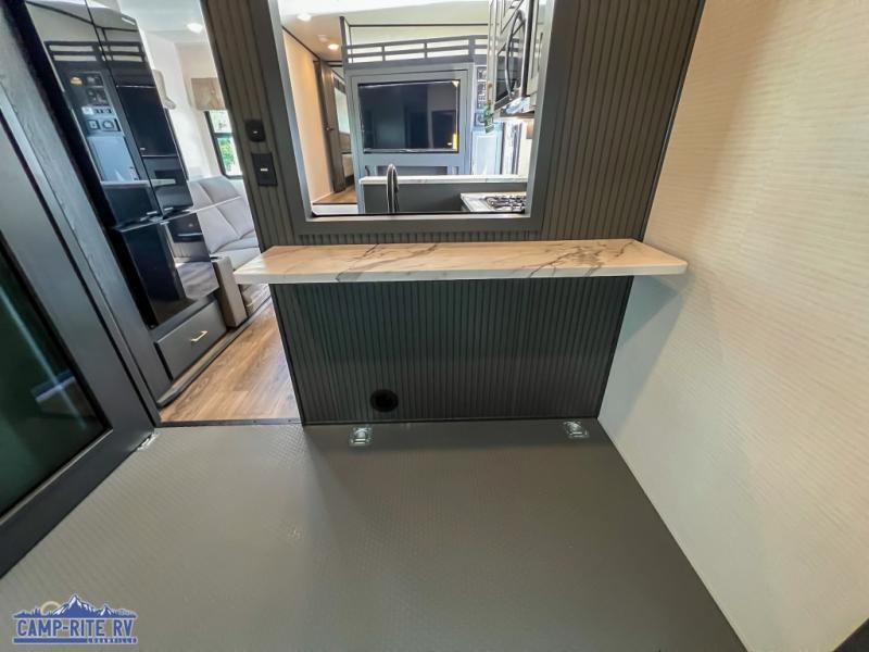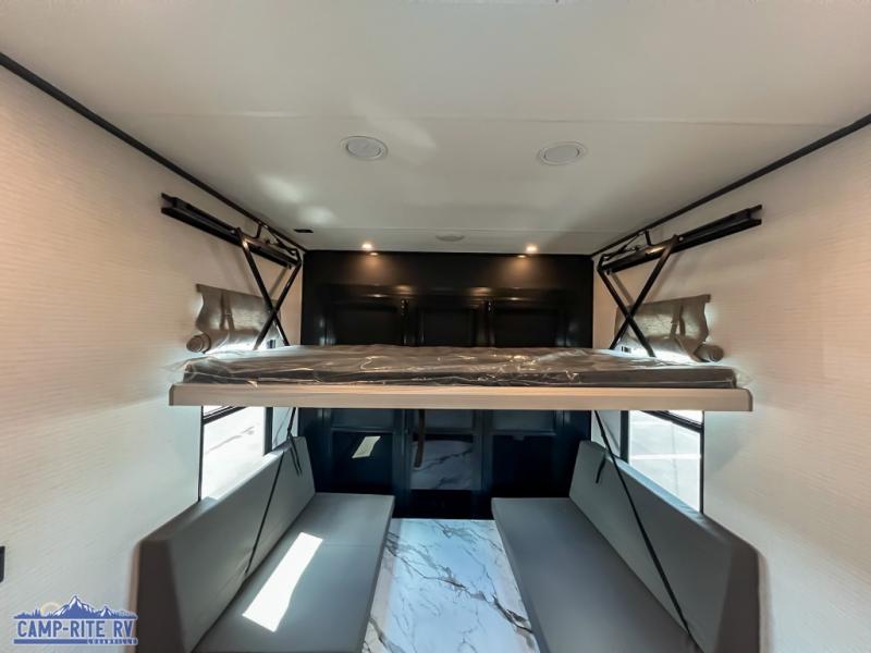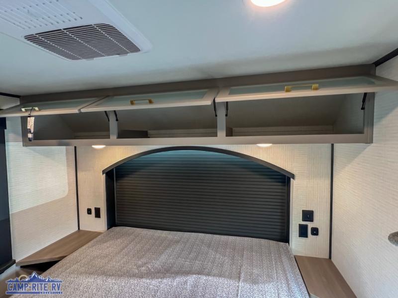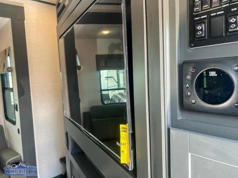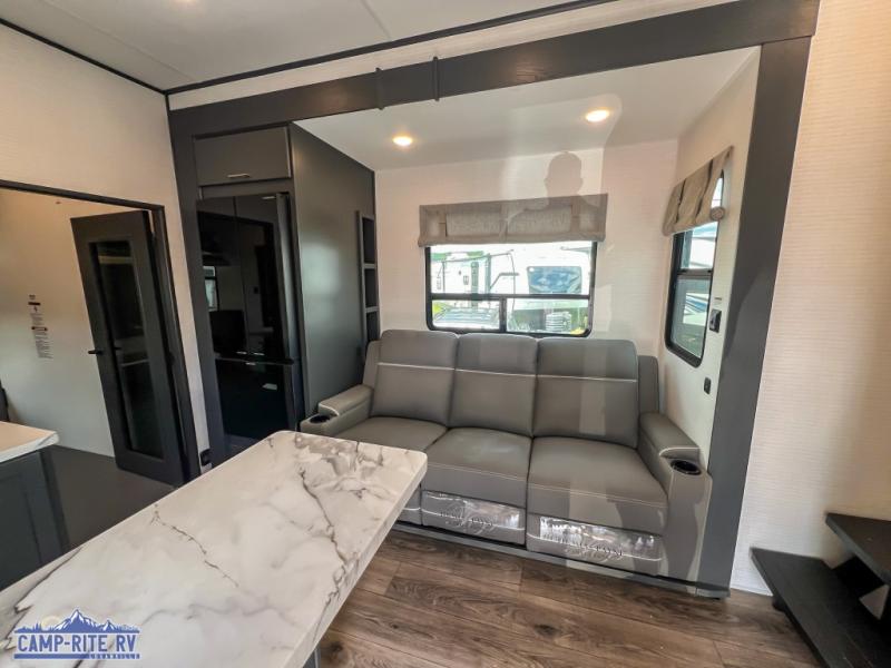 You'll love every minute spent in this double slide out, double entry fifth wheel! Your guests will have the 13' 6" separate garage all to themselves once the toys are unloaded, and here you'll find dual sofa sleepers with a Euro queen bed above. There is also a removable dinette table where you can enjoy a cold drink at when you have the 1,500 lb. capacity patio deck set up! Head to the combined kitchen and living area to relax on the sofa slide out while the cook prepares dinner. There is also a hidden pantry here you are sure to appreciate! The dual entry bath will create a front master bedroom, complete with a queen bed, dual nightstands and wardrobes, plus a wardrobe slide out for added storage and space!