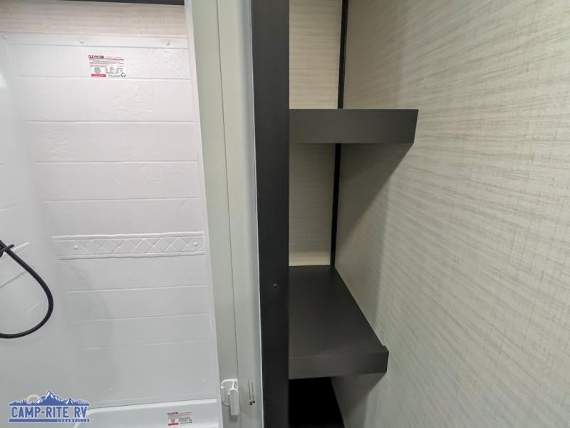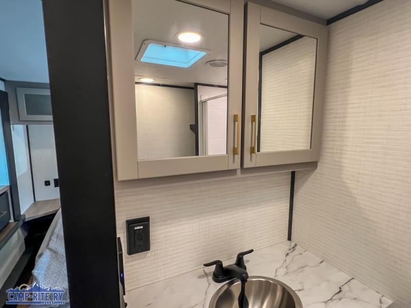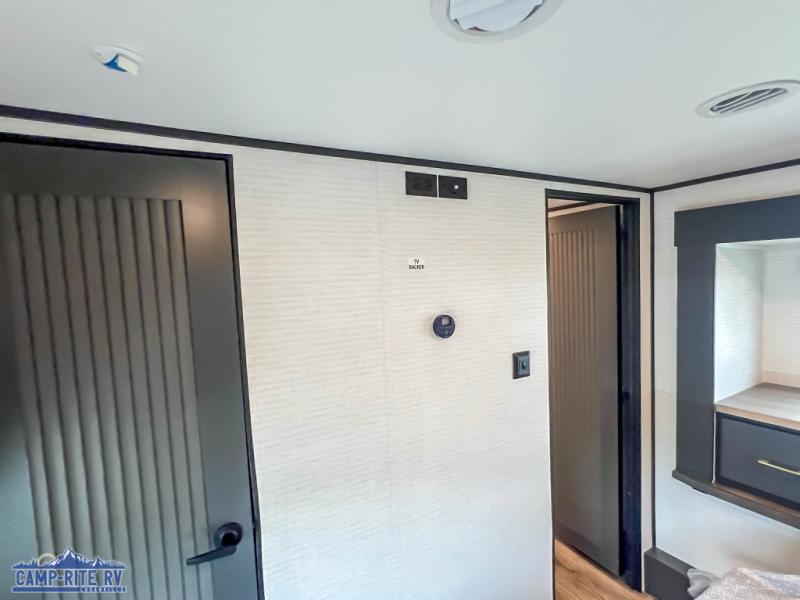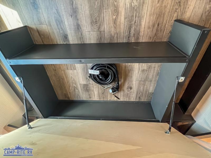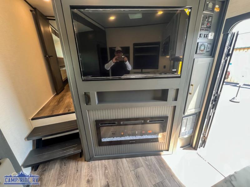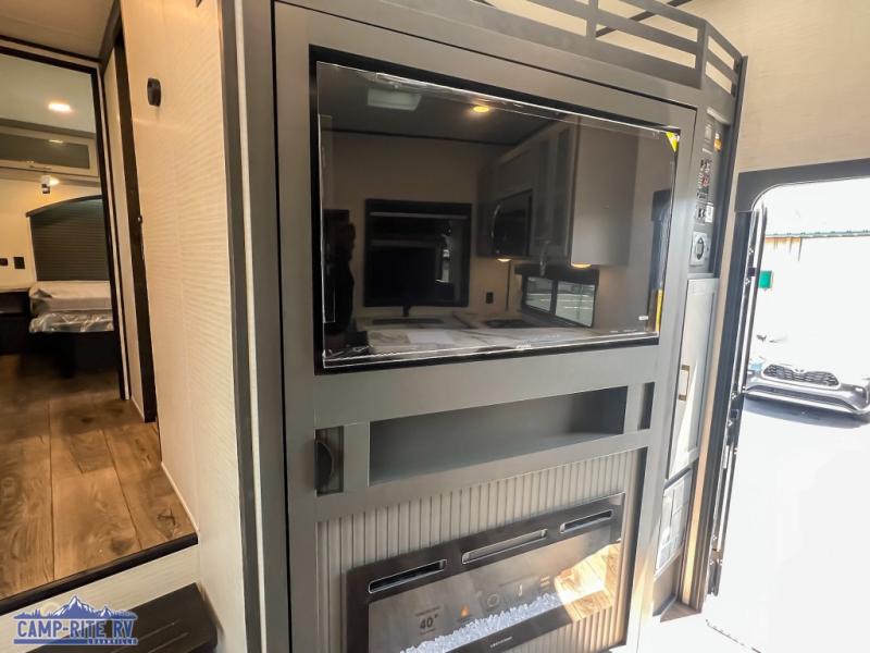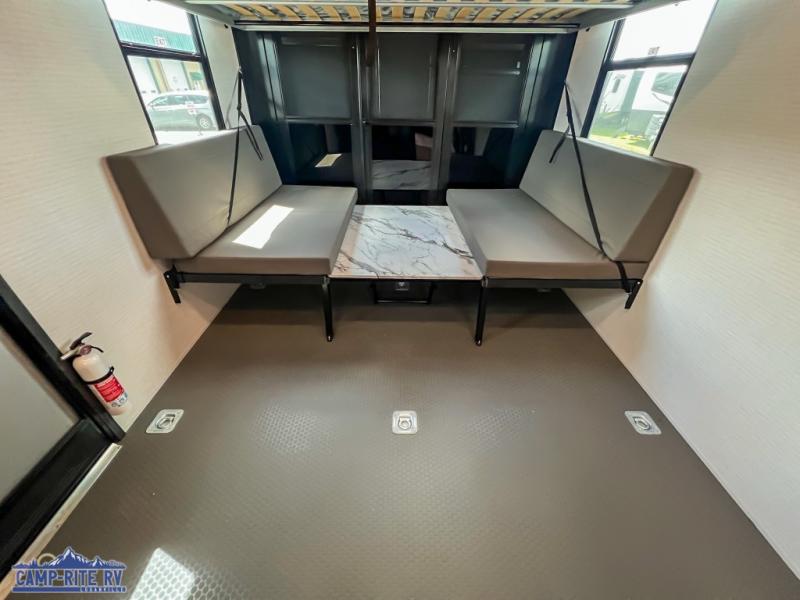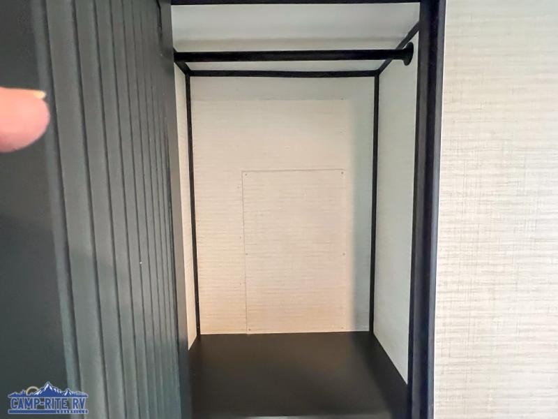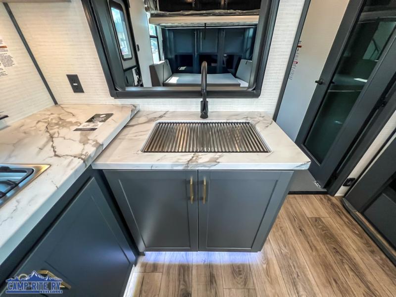 You'll love every minute spent in this double slide out, double entry fifth wheel! Your guests will have the 13' 6" separate garage all to themselves once the toys are unloaded, and here you'll find dual sofa sleepers with a Euro queen bed above. There is also a removable dinette table where you can enjoy a cold drink at when you have the 1,500 lb. capacity patio deck set up! Head to the combined kitchen and living area to relax on the sofa slide out while the cook prepares dinner. There is also a hidden pantry here you are sure to appreciate! The dual entry bath will create a front master bedroom, complete with a queen bed, dual nightstands and wardrobes, plus a wardrobe slide out for added storage and space!