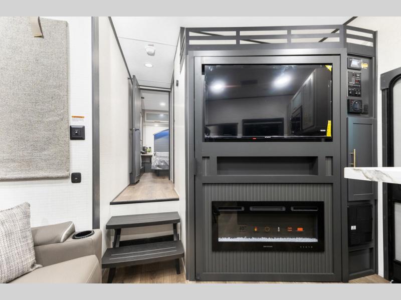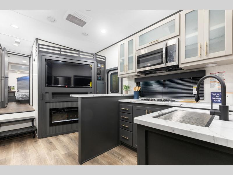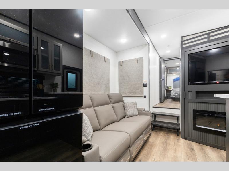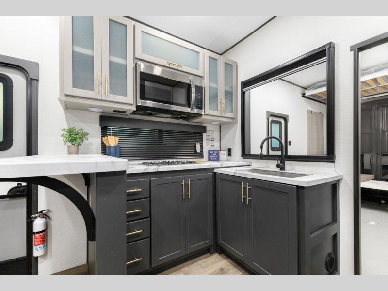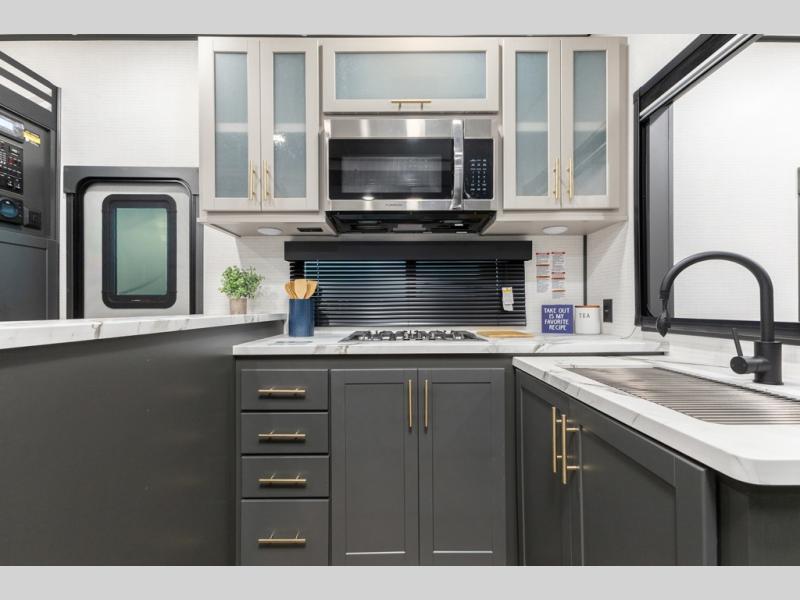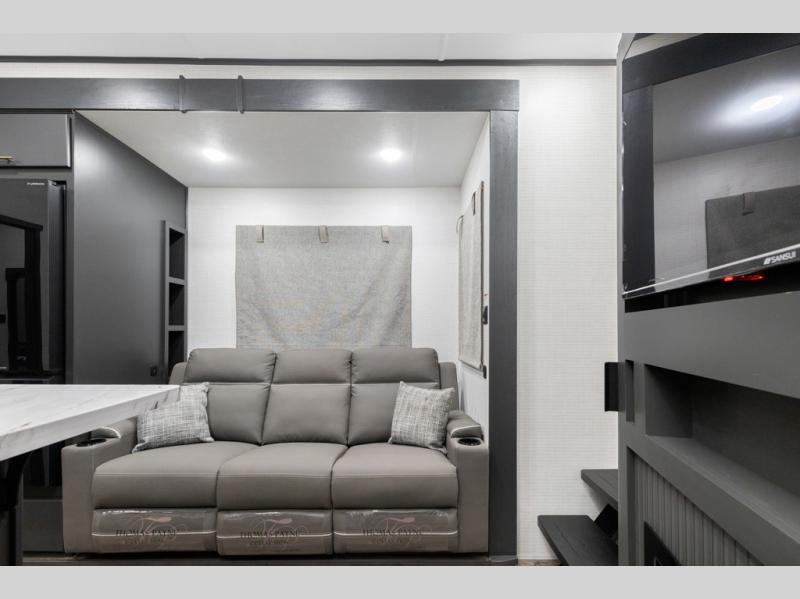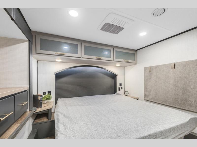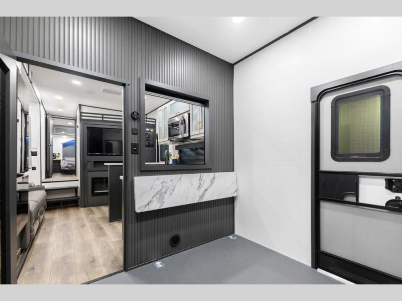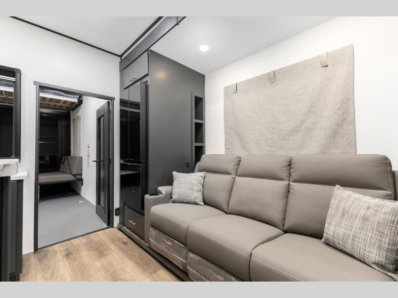You'll love every minute spent in this double slide out, double entry fifth wheel! Your guests will have the 13' 6" separate garage all to themselves once the toys are unloaded, and here you'll find dual sofa sleepers with a Euro queen bed above. There is also a removable dinette table where you can enjoy a cold drink at when you have the 1,500 lb. capacity patio deck set up! Head to the combined kitchen and living area to relax on the sofa slide out while the cook prepares dinner. There is also a hidden pantry here you are sure to appreciate! The dual entry bath will create a front master bedroom, complete with a queen bed, dual nightstands and wardrobes, plus a wardrobe slide out for added storage and space!