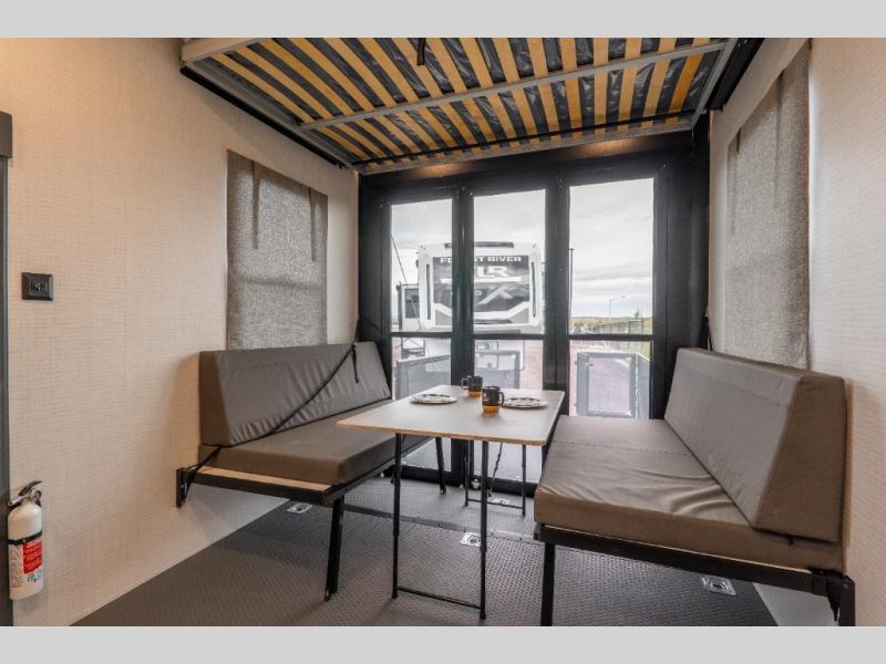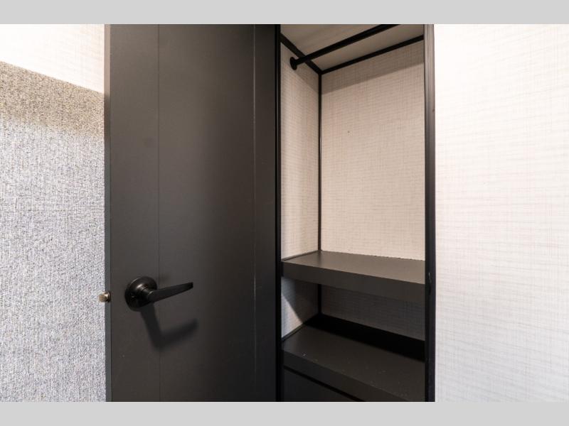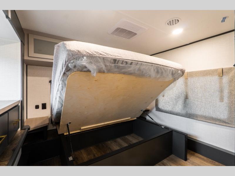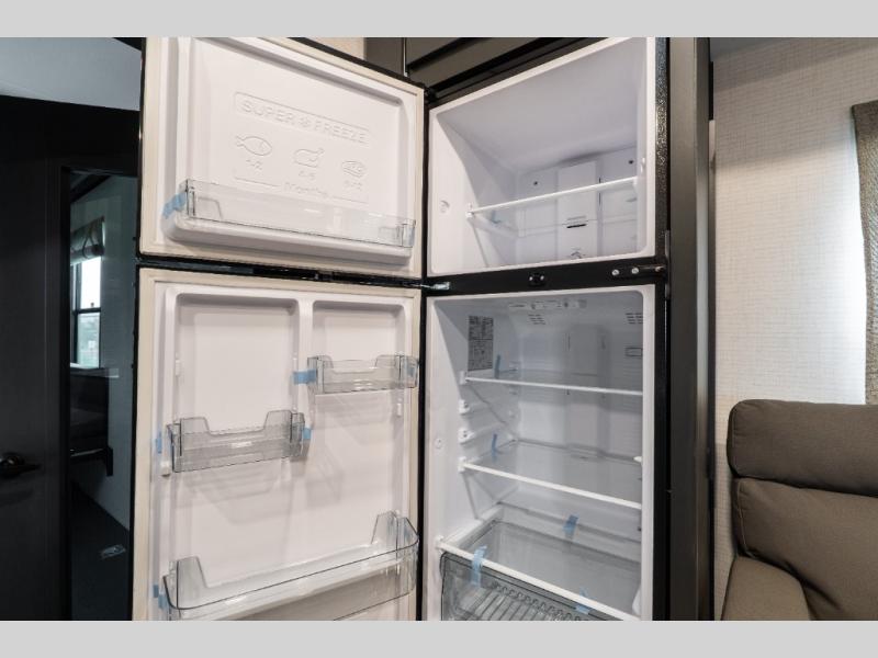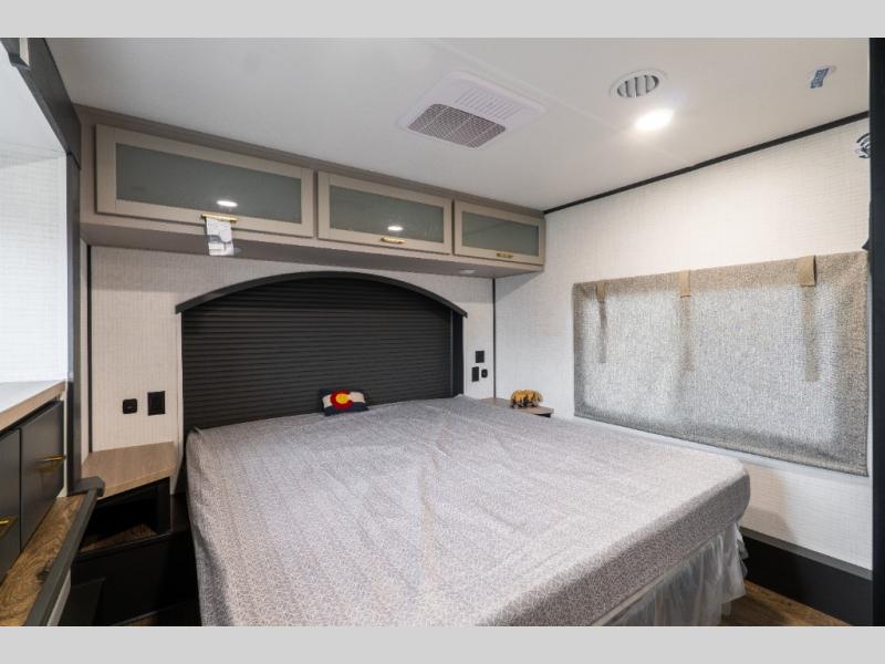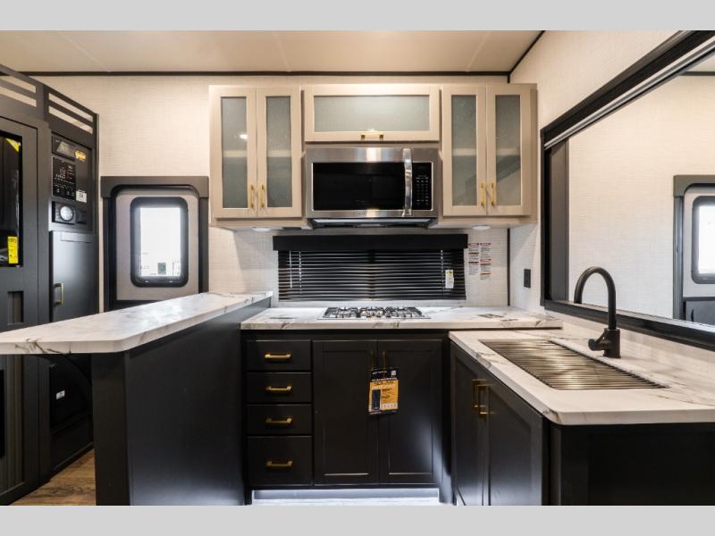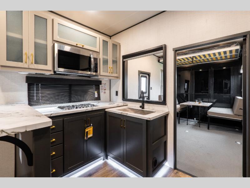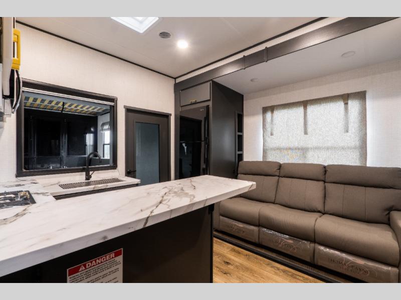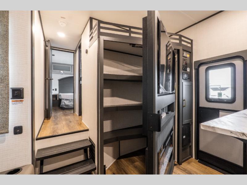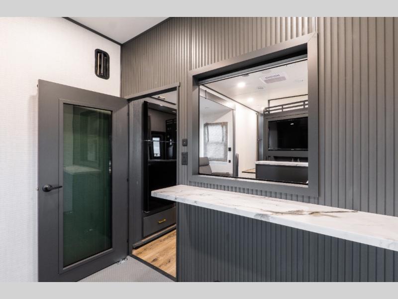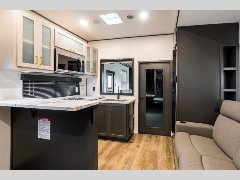 You'll love every minute spent in this double slide out, double entry fifth wheel! Your guests will have the 13' 6" separate garage all to themselves once the toys are unloaded, and here you'll find dual sofa sleepers with a Euro queen bed above. There is also a removable dinette table where you can enjoy a cold drink at when you have the 1,500 lb. capacity patio deck set up! Head to the combined kitchen and living area to relax on the sofa slide out while the cook prepares dinner. There is also a hidden pantry here you are sure to appreciate! The dual entry bath will create a front master bedroom, complete with a queen bed, dual nightstands and wardrobes, plus a wardrobe slide out for added storage and space!