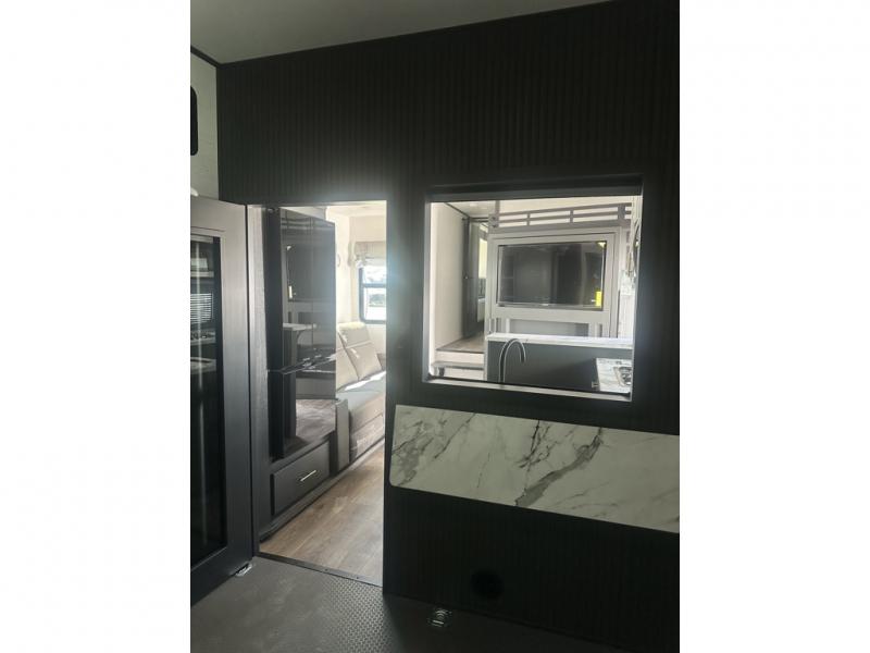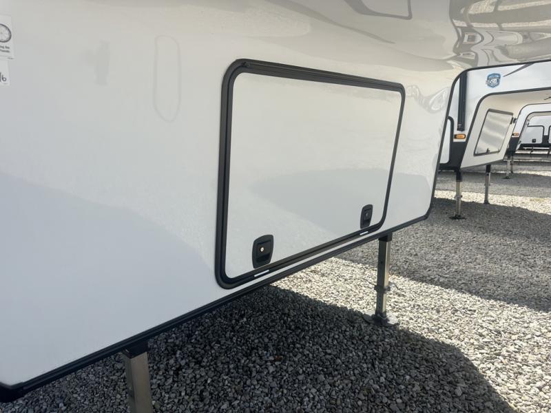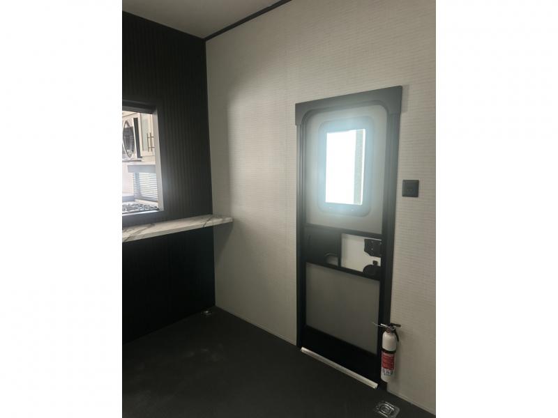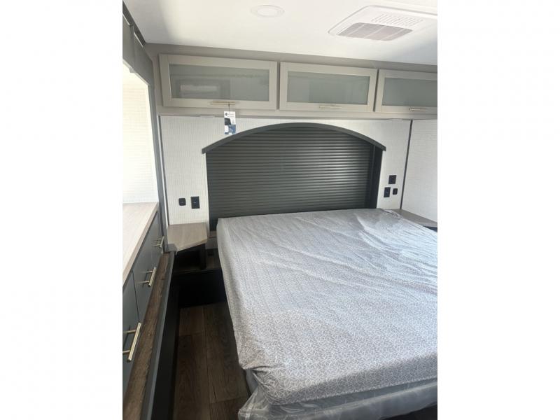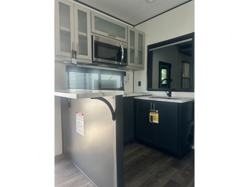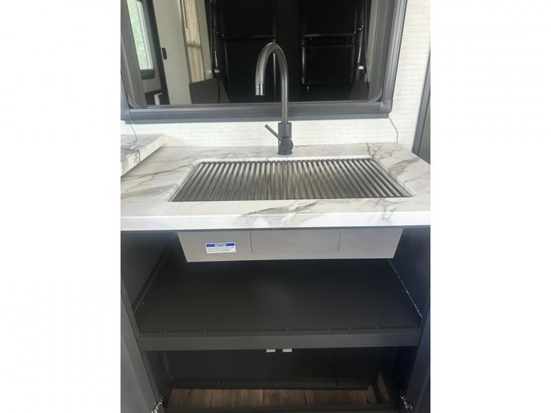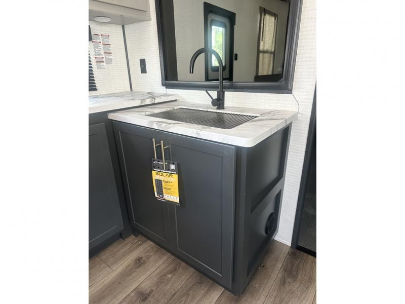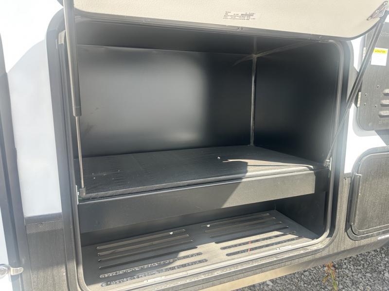 You'll love every minute spent in this double slide out, double entry fifth wheel! Your guests will have the 13' 6" separate garage all to themselves once the toys are unloaded, and here you'll find dual sofa sleepers with a Euro queen bed above. There is also a removable dinette table where you can enjoy a cold drink at when you have the 1,500 lb. capacity patio deck set up! Head to the combined kitchen and living area to relax on the sofa slide out while the cook prepares dinner. There is also a hidden pantry here you are sure to appreciate! The dual entry bath will create a front master bedroom, complete with a queen bed, dual nightstands and wardrobes, plus a wardrobe slide out for added storage and space!