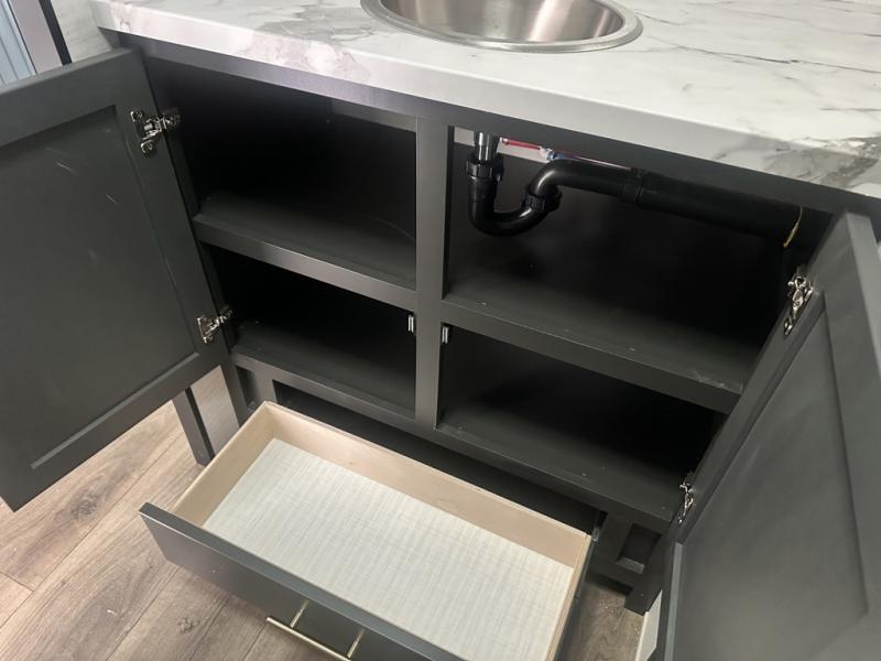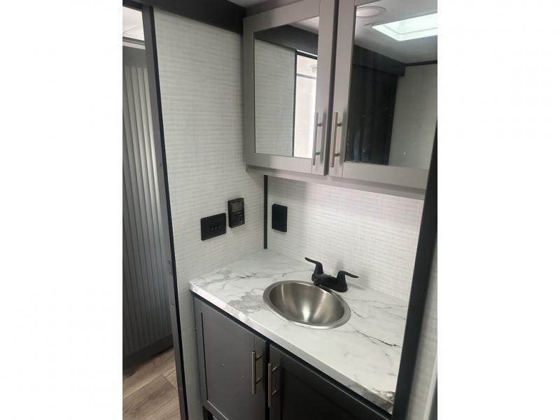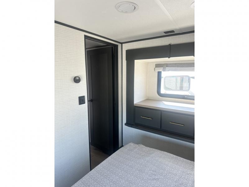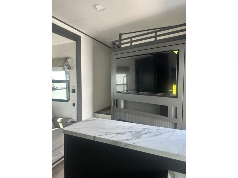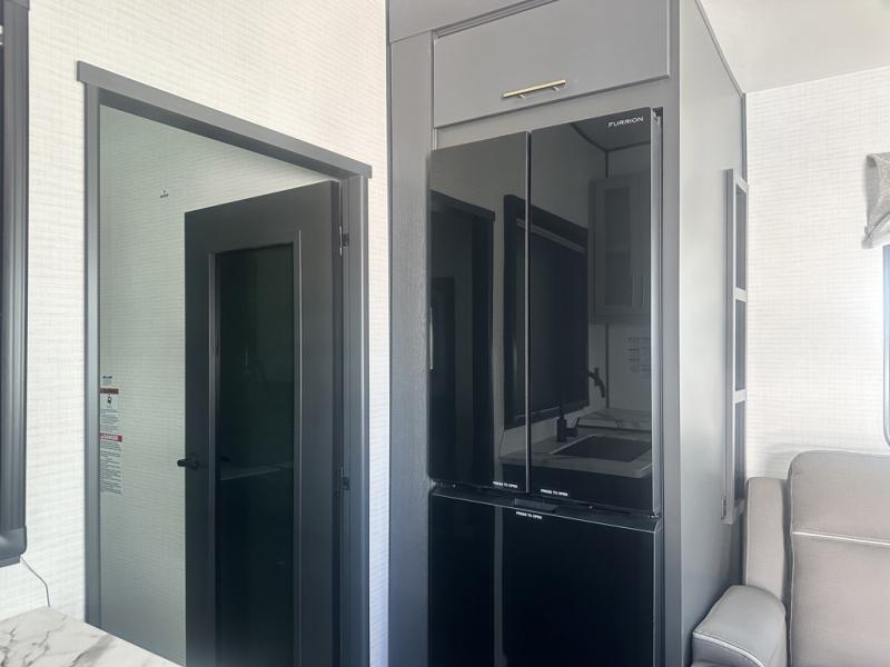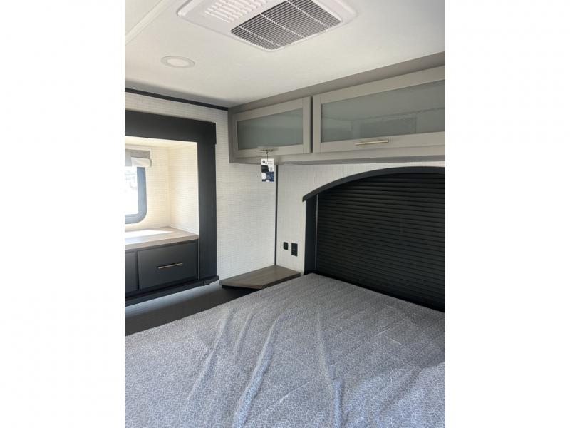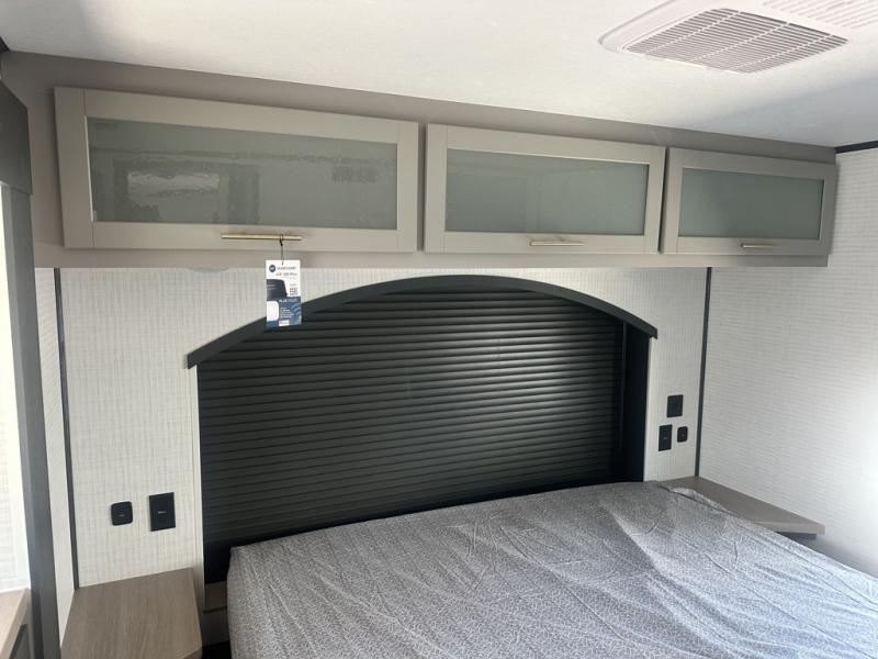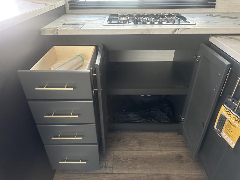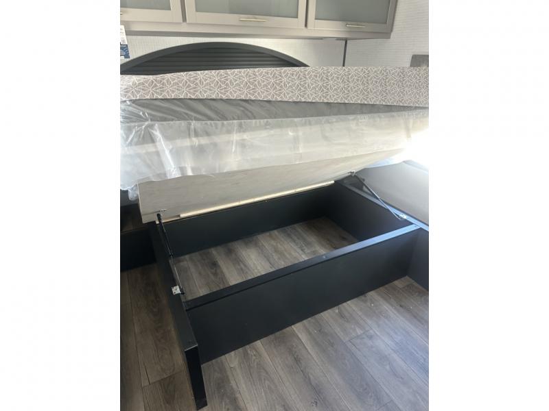 You'll love every minute spent in this double slide out, double entry fifth wheel! Your guests will have the 13' 6" separate garage all to themselves once the toys are unloaded, and here you'll find dual sofa sleepers with a Euro queen bed above. There is also a removable dinette table where you can enjoy a cold drink at when you have the 1,500 lb. capacity patio deck set up! Head to the combined kitchen and living area to relax on the sofa slide out while the cook prepares dinner. There is also a hidden pantry here you are sure to appreciate! The dual entry bath will create a front master bedroom, complete with a queen bed, dual nightstands and wardrobes, plus a wardrobe slide out for added storage and space!