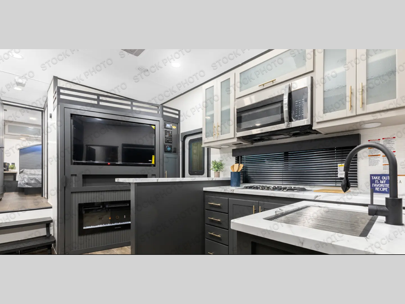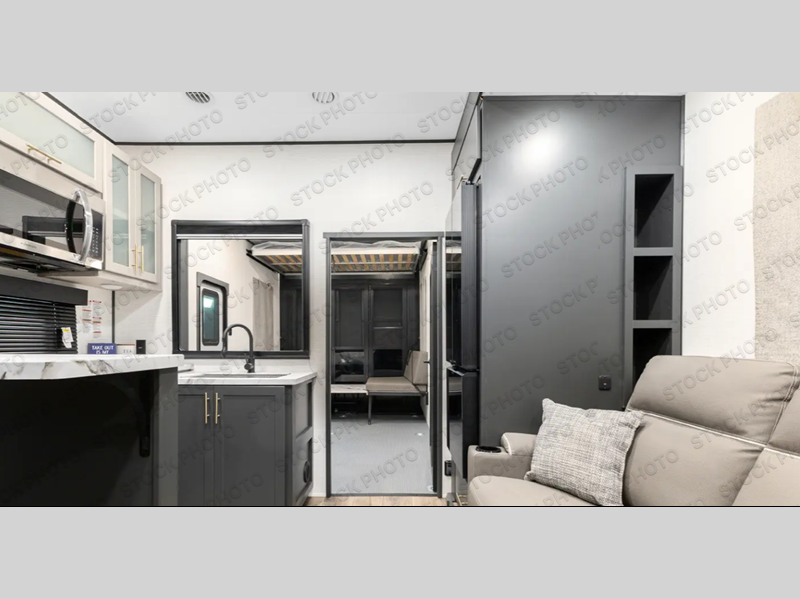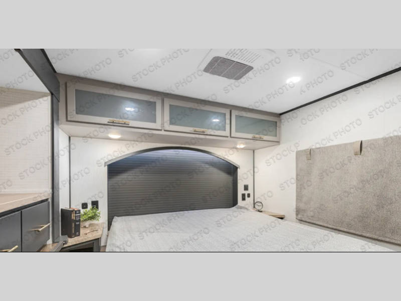 You'll love every minute spent in this double slide out, double entry fifth wheel! Your guests will have the 13' 6" separate garage all to themselves once the toys are unloaded, and here you'll find dual sofa sleepers with a Euro queen bed above. There is also a removable dinette table where you can enjoy a cold drink at when you have the 1,500 lb. capacity patio deck set up! Head to the combined kitchen and living area to relax on the sofa slide out while the cook prepares dinner. There is also a hidden pantry here you are sure to appreciate! The dual entry bath will create a front master bedroom, complete with a queen bed, dual nightstands and wardrobes, plus a wardrobe slide out for added storage and space!