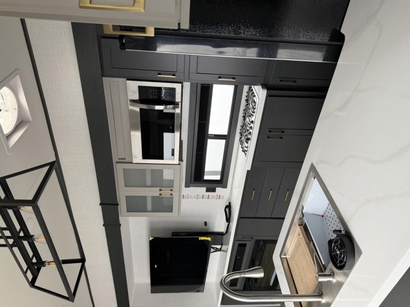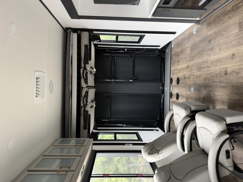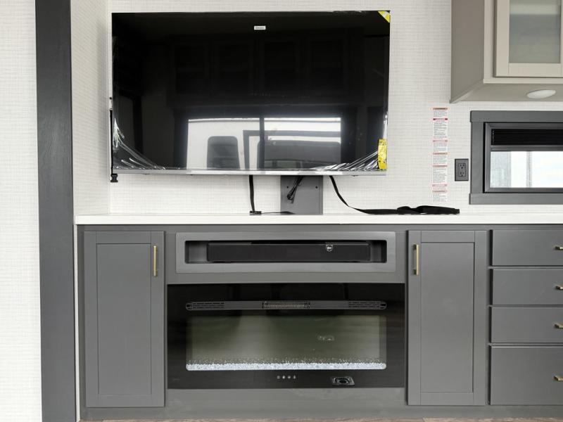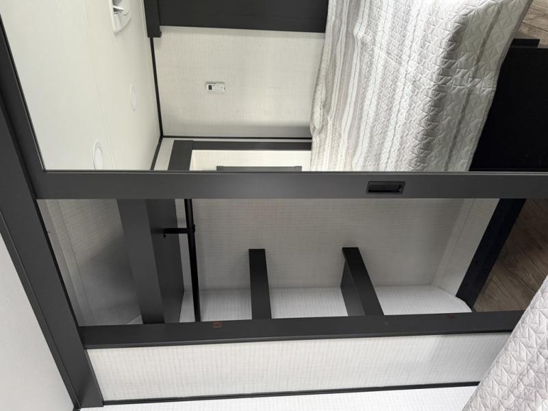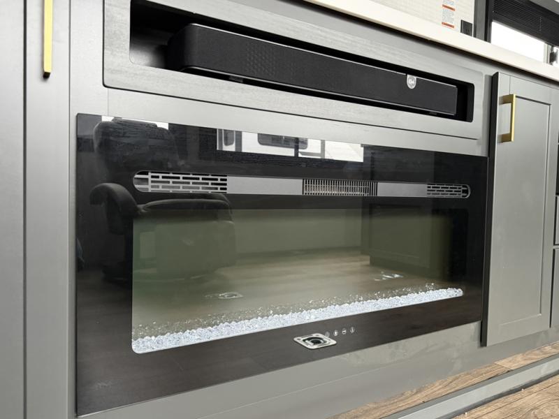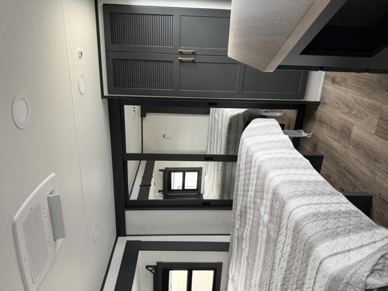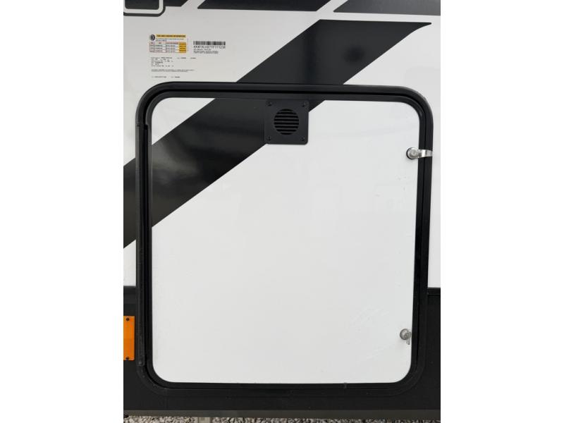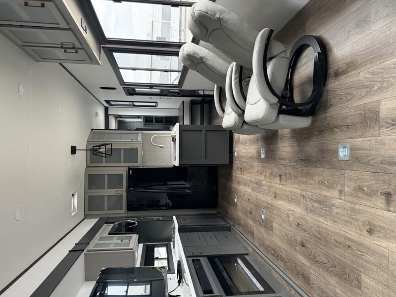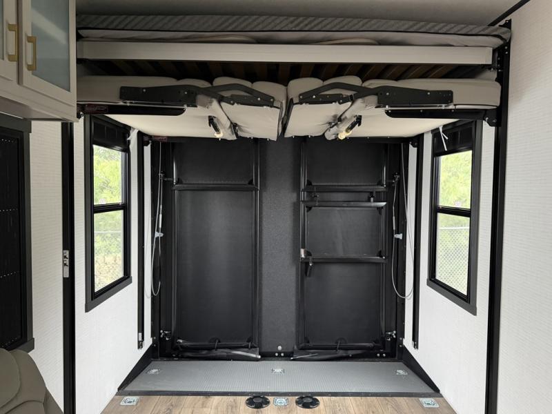 At the front of this spacious toy hauler, you’ll find a cozy retreat featuring a 66" x 80" king bed, complemented by a wardrobe and dresser to keep your clothing and essentials neatly organized. Down the hall, a full bathroom awaits with a convenient shower/tub combo and linen shelves for all your toiletries. The central living and kitchen area offers a roomy feel thanks to a slide out, showcasing an entertainment center with a fireplace, overhead cabinets, and a microwave on one side, while two comfortable armchairs sit across, perfect for unwinding after a day of adventure. Nearby, a 16 cu. ft. residential-style refrigerator, sink, and ample counter space ensure you have everything you need for easy meal prep. At the rear, the versatile Happi Jack Dinette with removable tables and the Happi Jack Queen Bed System provide flexible seating and sleeping options for guests. With a generous 16' 6" garage from the rear to the kitchen counter, you’ll have plenty of room to bring along all your favorite toys.