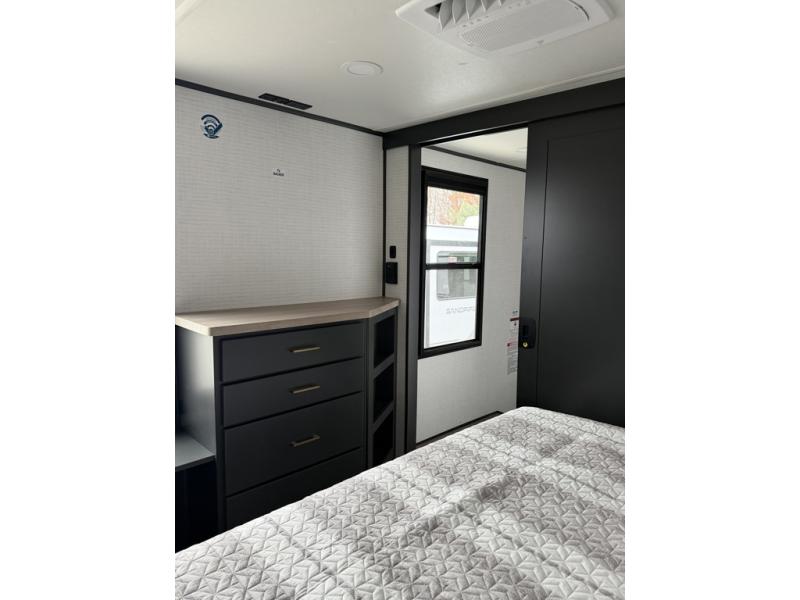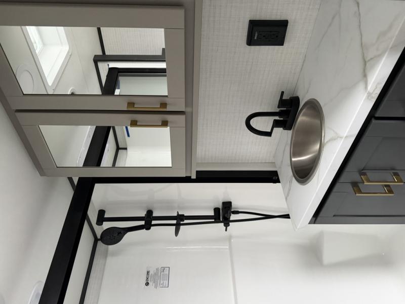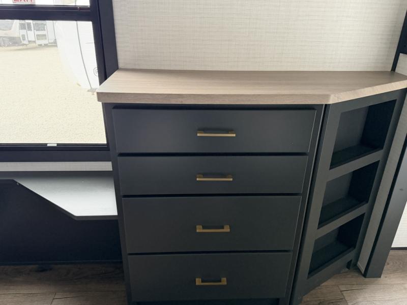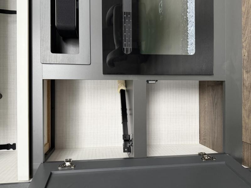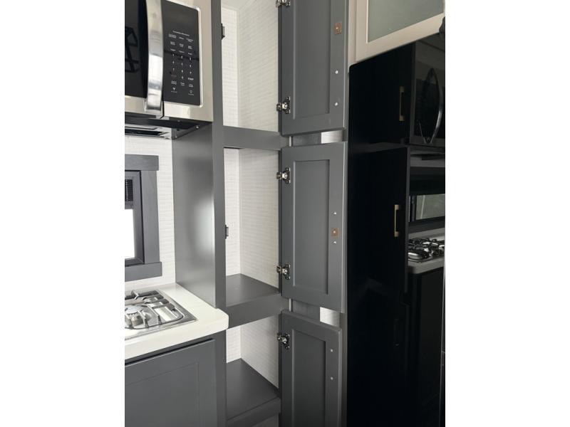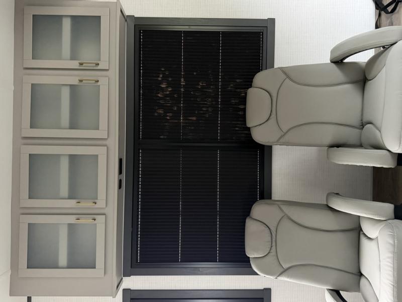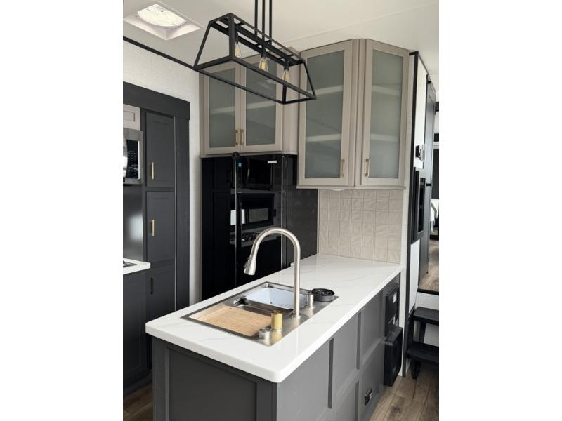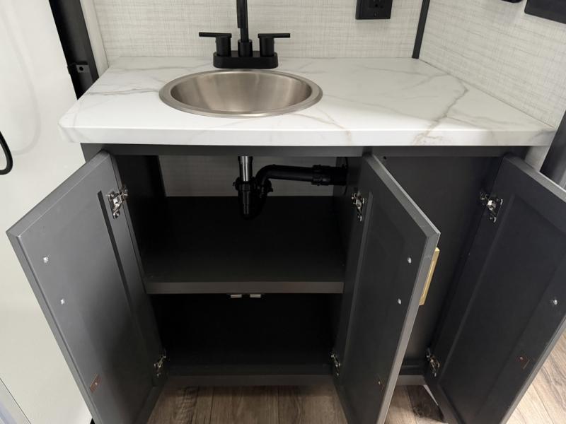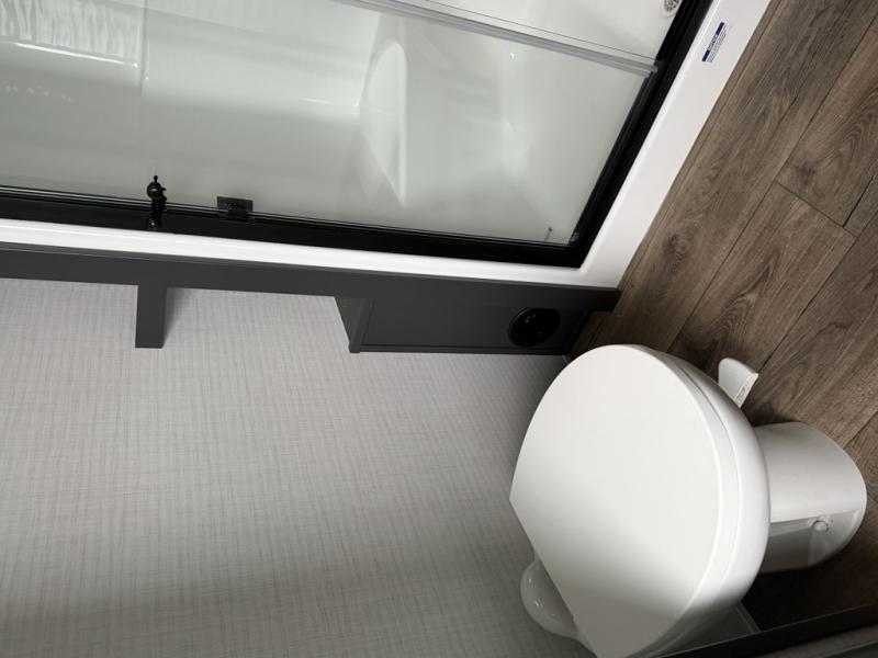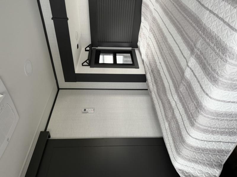 At the front of this spacious toy hauler, you’ll find a cozy retreat featuring a 66" x 80" king bed, complemented by a wardrobe and dresser to keep your clothing and essentials neatly organized. Down the hall, a full bathroom awaits with a convenient shower/tub combo and linen shelves for all your toiletries. The central living and kitchen area offers a roomy feel thanks to a slide out, showcasing an entertainment center with a fireplace, overhead cabinets, and a microwave on one side, while two comfortable armchairs sit across, perfect for unwinding after a day of adventure. Nearby, a 16 cu. ft. residential-style refrigerator, sink, and ample counter space ensure you have everything you need for easy meal prep. At the rear, the versatile Happi Jack Dinette with removable tables and the Happi Jack Queen Bed System provide flexible seating and sleeping options for guests. With a generous 16' 6" garage from the rear to the kitchen counter, you’ll have plenty of room to bring along all your favorite toys.