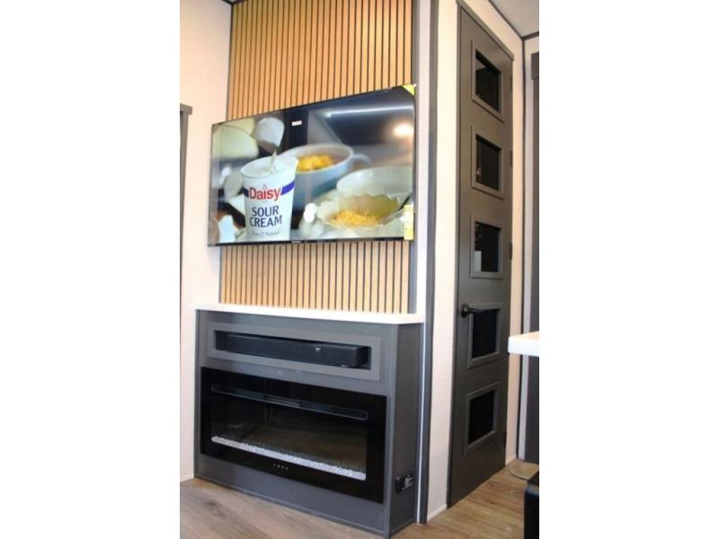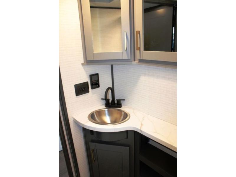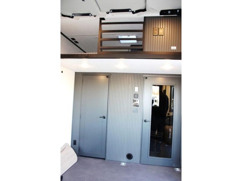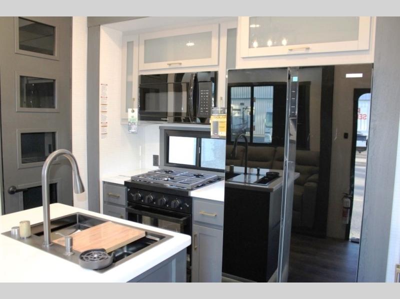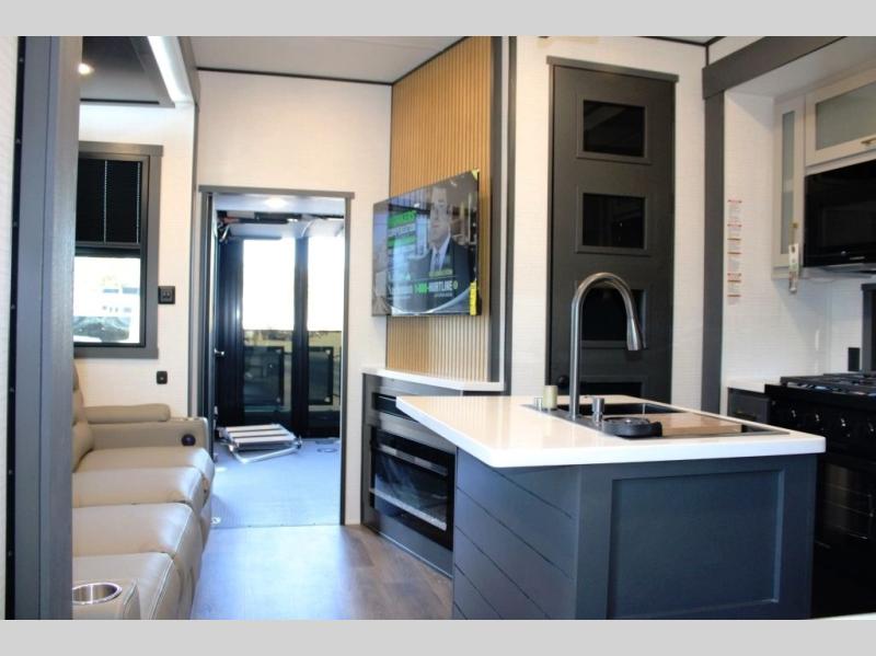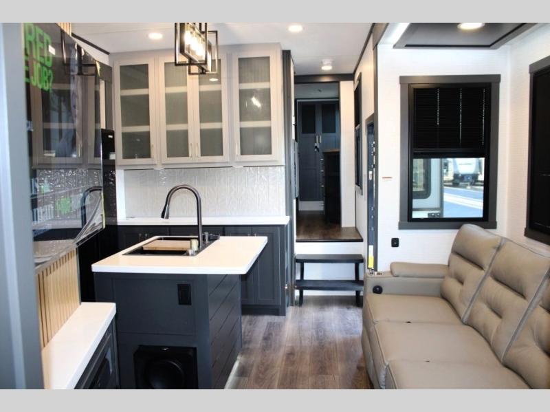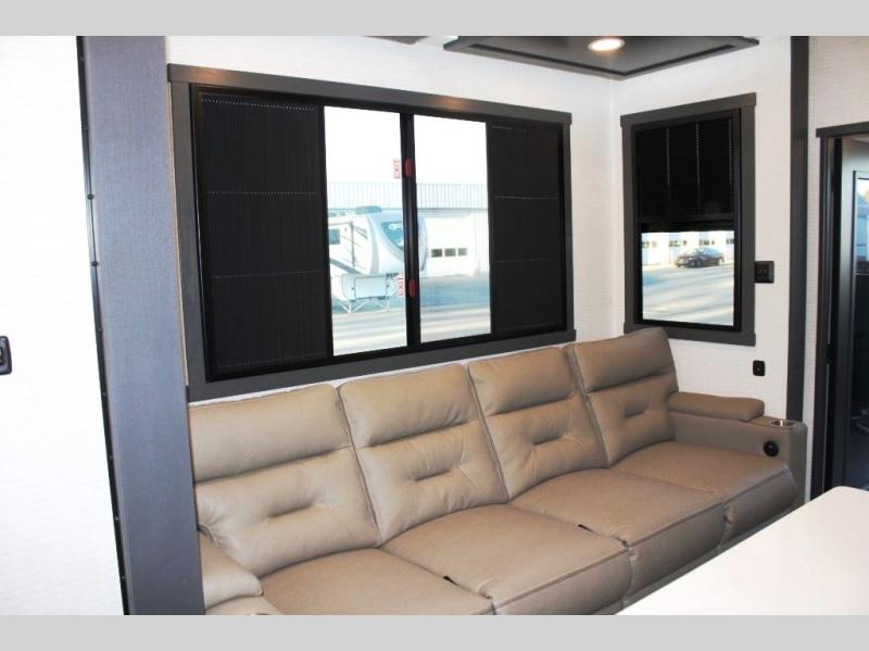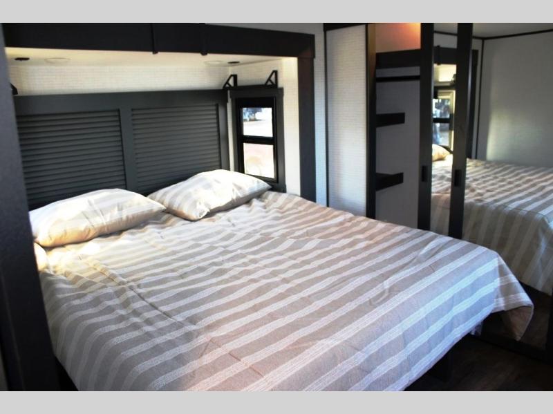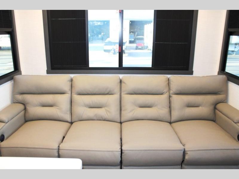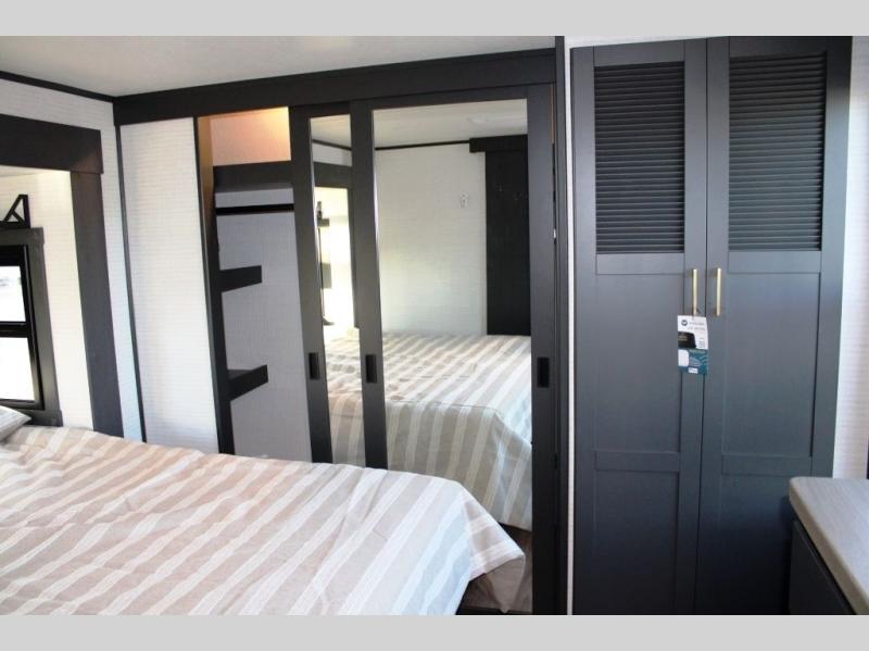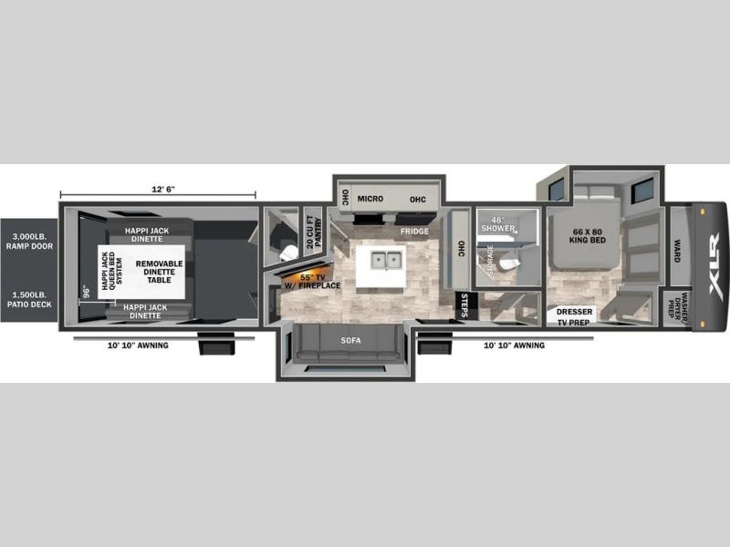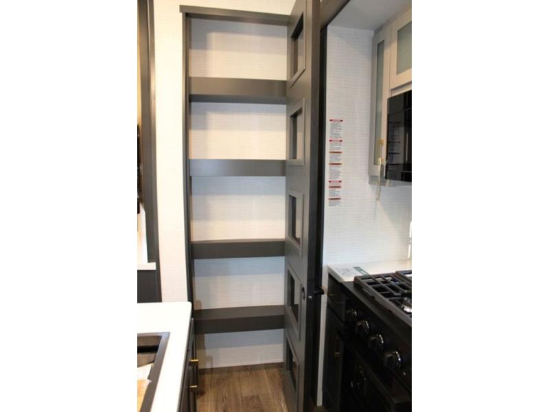 This 35G13 model has a spacious 12-ft 6" garage, you'll find plenty of room for your toys, along with a versatile Happi-Jack system that includes a queen bed and a dinette with a removable table for extra sleeping space or a meal with guests. A half bath is also located in the garage area for added ease during travels. Moving into the main living space, you’ll enjoy relaxing on the sofa while watching your favorite shows on the 55-inch TV. The kitchen is well-appointed with an island and an expansive 20-cubic-foot pantry, offering ample space for meal prep and storage. Up front, a full bathroom features a 48-inch shower, providing space to clean up after a long day outdoors. The master bedroom offers a king-size bed, large wardrobe, and a dresser to keep all your clothing and essentials organized, giving you all the comforts of home no matter where the road takes you.