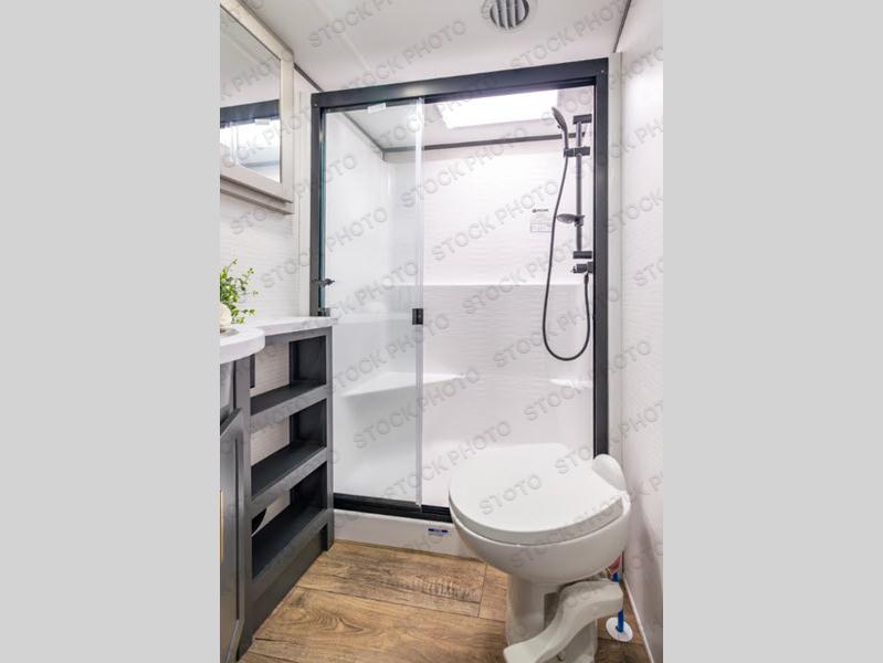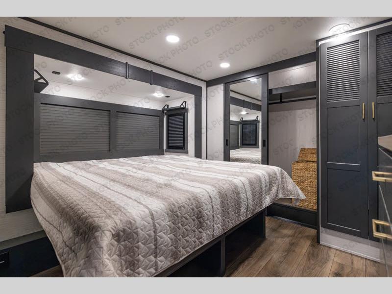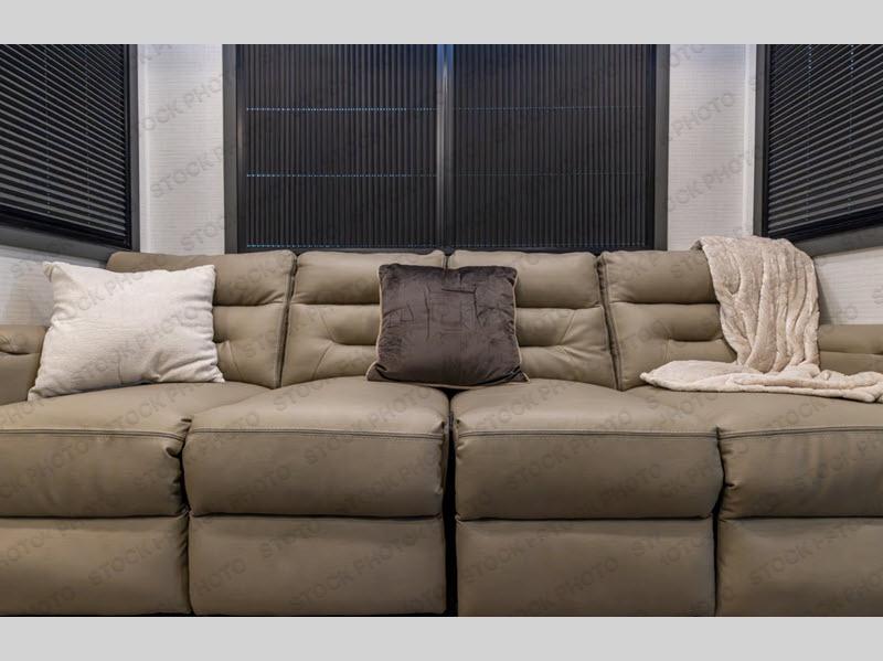 This 35G13 model has a spacious 12-ft 6" garage, you'll find plenty of room for your toys, along with a versatile Happi-Jack system that includes a queen bed and a dinette with a removable table for extra sleeping space or a meal with guests. A half bath is also located in the garage area for added ease during travels. Moving into the main living space, you’ll enjoy relaxing on the sofa while watching your favorite shows on the 55-inch TV. The kitchen is well-appointed with an island and an expansive 20-cubic-foot pantry, offering ample space for meal prep and storage. Up front, a full bathroom features a 48-inch shower, providing space to clean up after a long day outdoors. The master bedroom offers a king-size bed, large wardrobe, and a dresser to keep all your clothing and essentials organized, giving you all the comforts of home no matter where the road takes you.