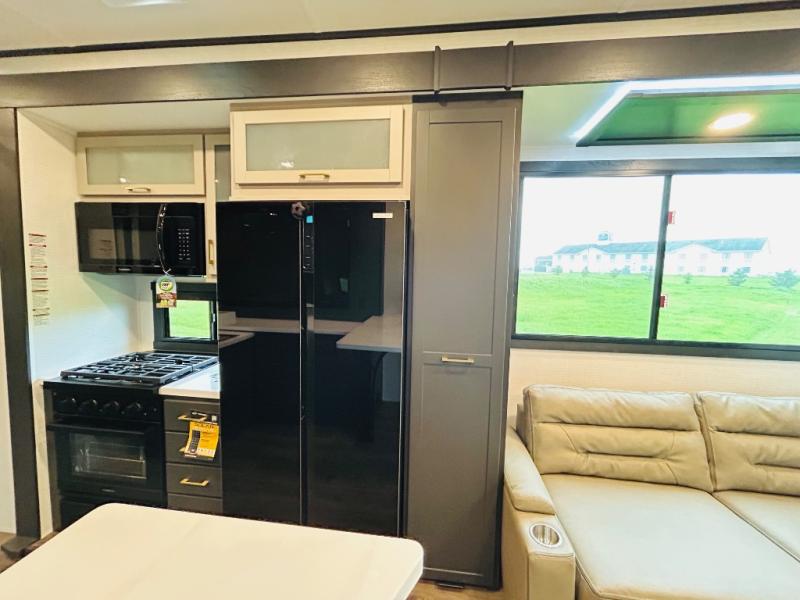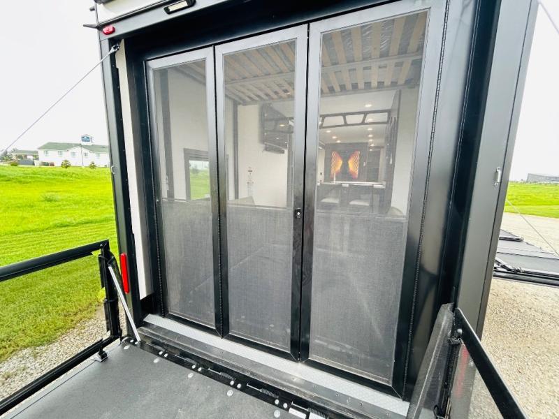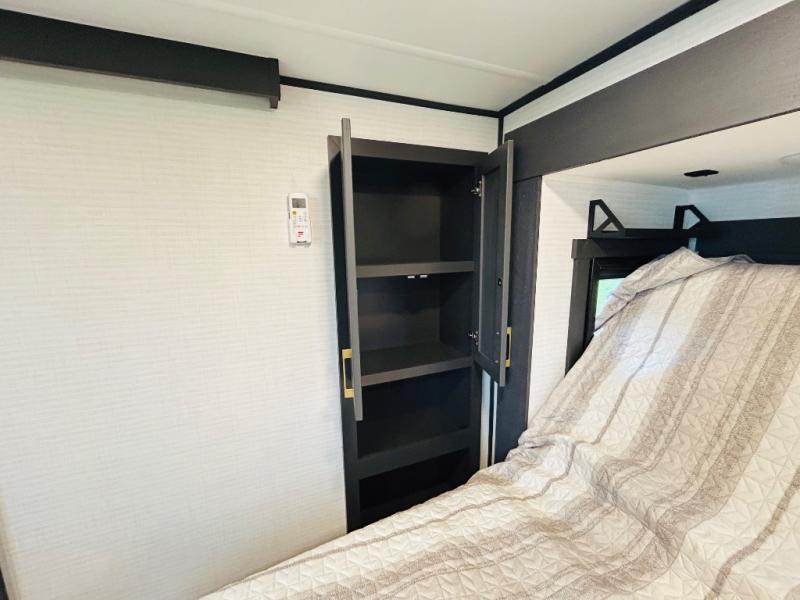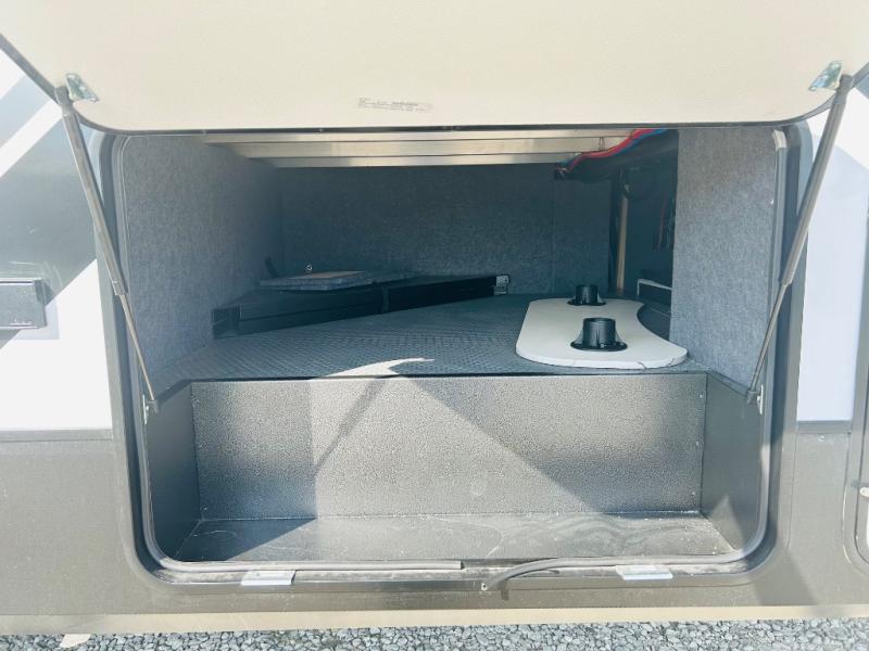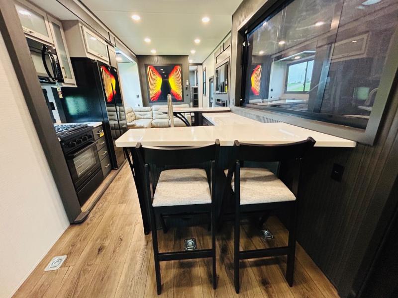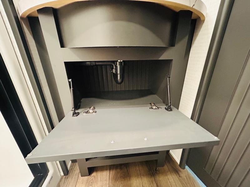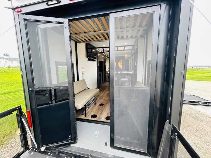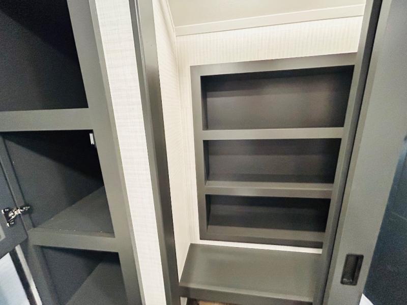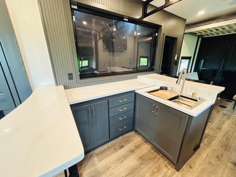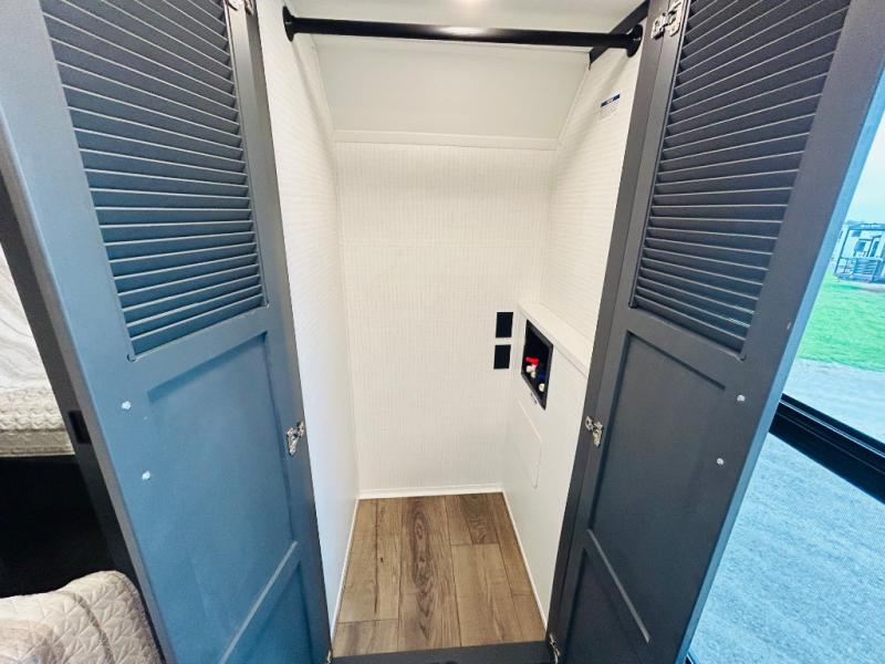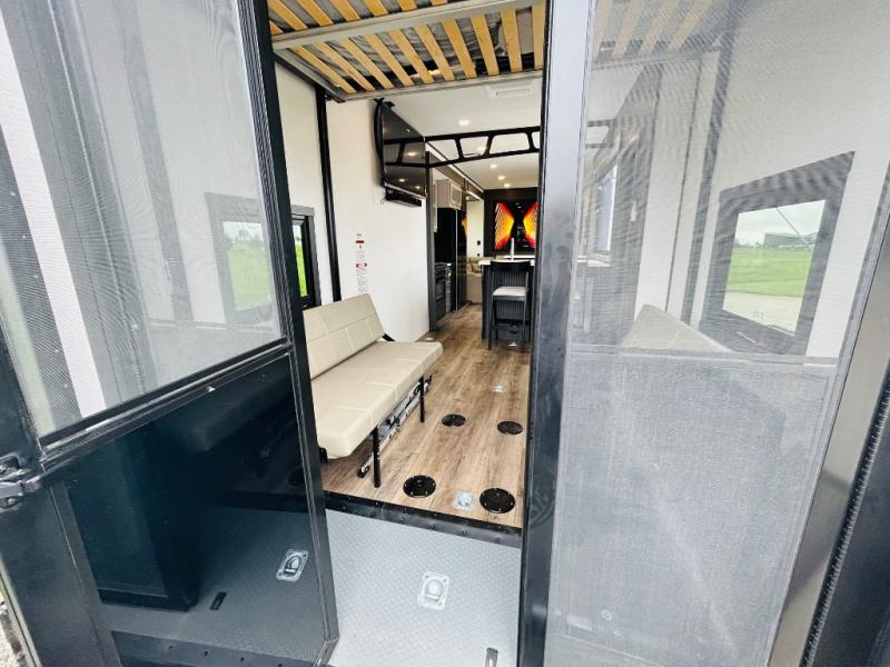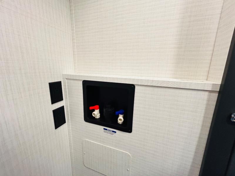 Once you arrive at your destination, you can unload your toys from the 13' garage, then relax on the dual gaucho sofas with a removable dinette table in between. There is also a queen-size Euro bed above the sofa where guests can sleep. Everyone will love to gather on the side patio that features a flip-down bar top and a window that looks into the kitchen. There are also bar stools here and inside at the counter so everyone has a seat. If the weather isn't cooperating, you can relax on the L-shaped sofa in the main living area, and there is a 55" TV with a hidden pantry behind for snacks! A spacious full bath will let everyone freshen up after trail riding, and you'll love having your own bedroom up front. Here, you'll find a 66 x 80 king bed slide out, a wardrobe, dresser, plus washer and dryer prep if you choose to add those appliances!