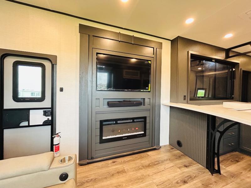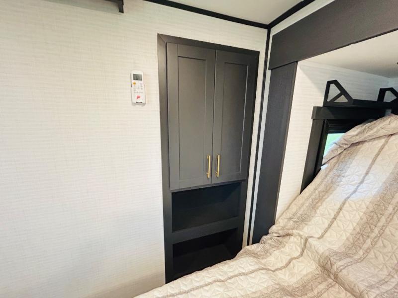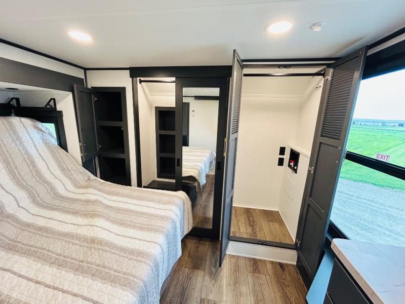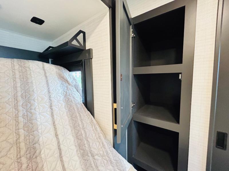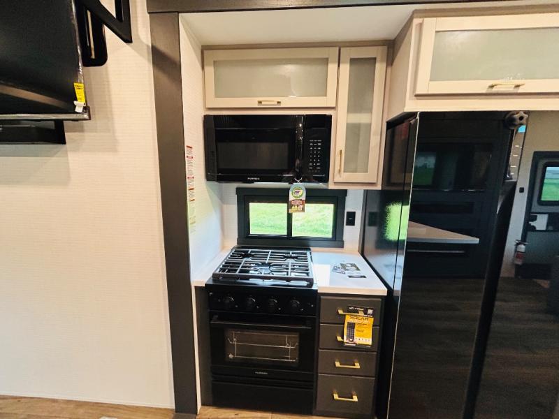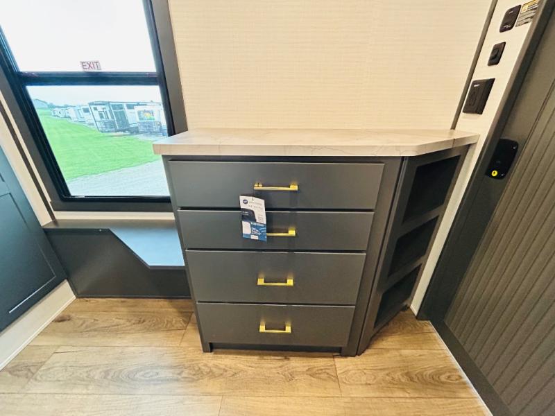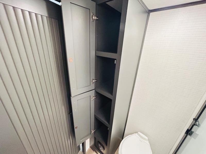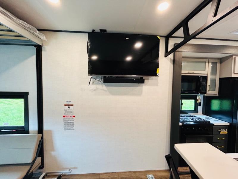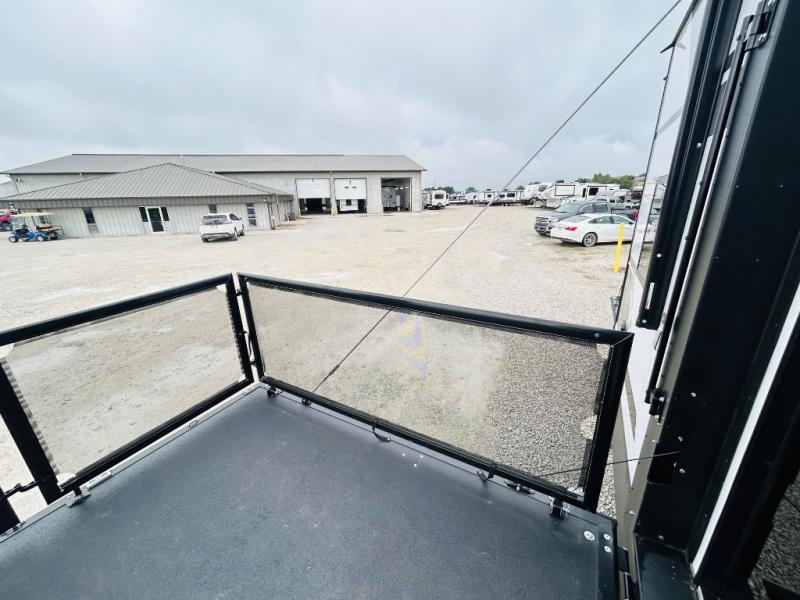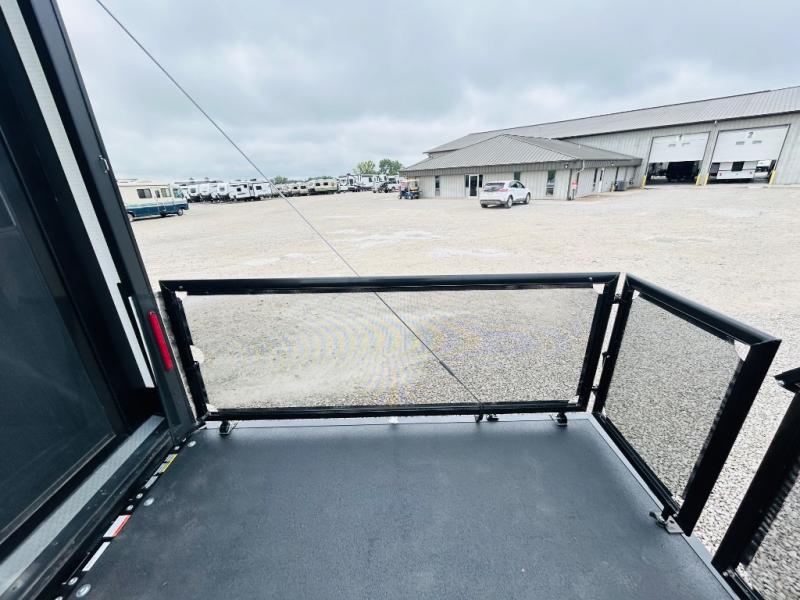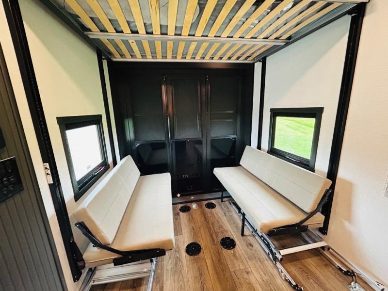 Once you arrive at your destination, you can unload your toys from the 13' garage, then relax on the dual gaucho sofas with a removable dinette table in between. There is also a queen-size Euro bed above the sofa where guests can sleep. Everyone will love to gather on the side patio that features a flip-down bar top and a window that looks into the kitchen. There are also bar stools here and inside at the counter so everyone has a seat. If the weather isn't cooperating, you can relax on the L-shaped sofa in the main living area, and there is a 55" TV with a hidden pantry behind for snacks! A spacious full bath will let everyone freshen up after trail riding, and you'll love having your own bedroom up front. Here, you'll find a 66 x 80 king bed slide out, a wardrobe, dresser, plus washer and dryer prep if you choose to add those appliances!
