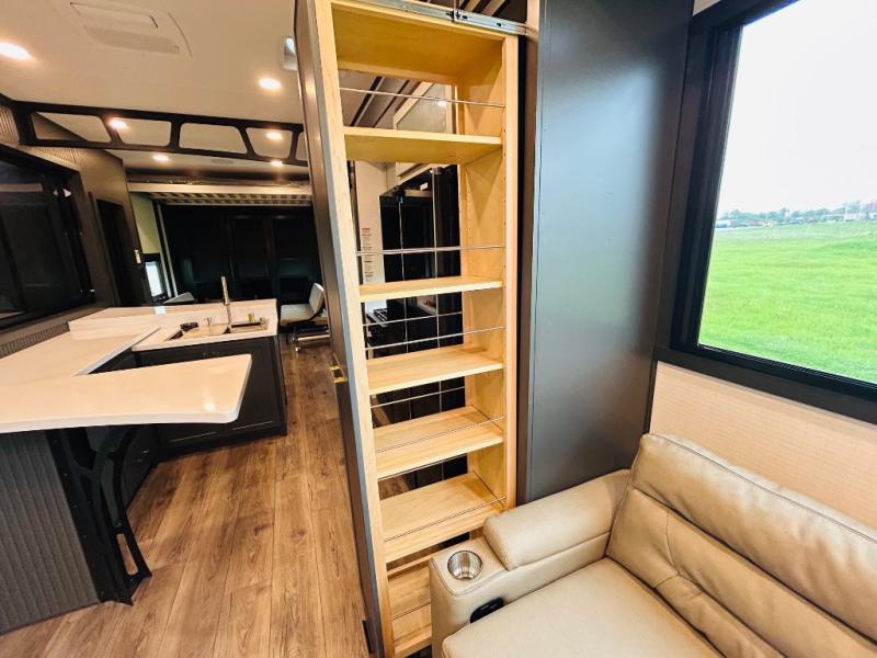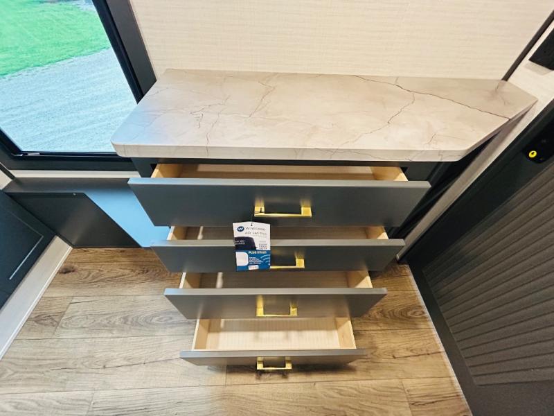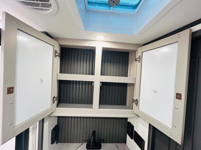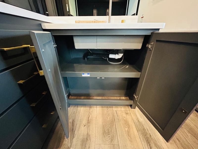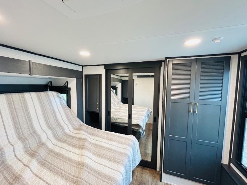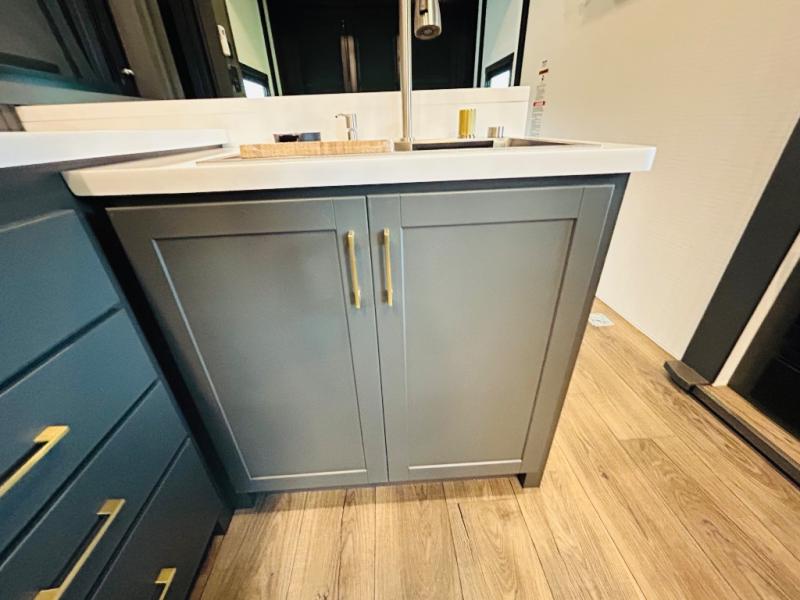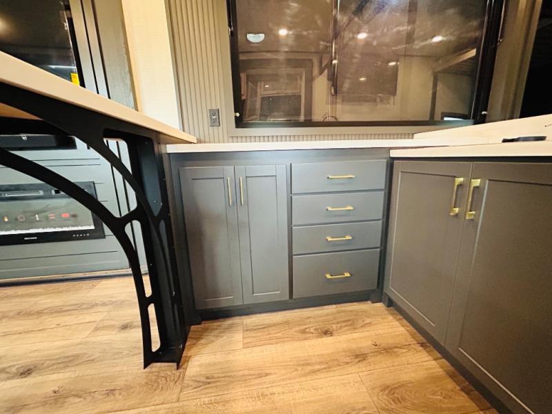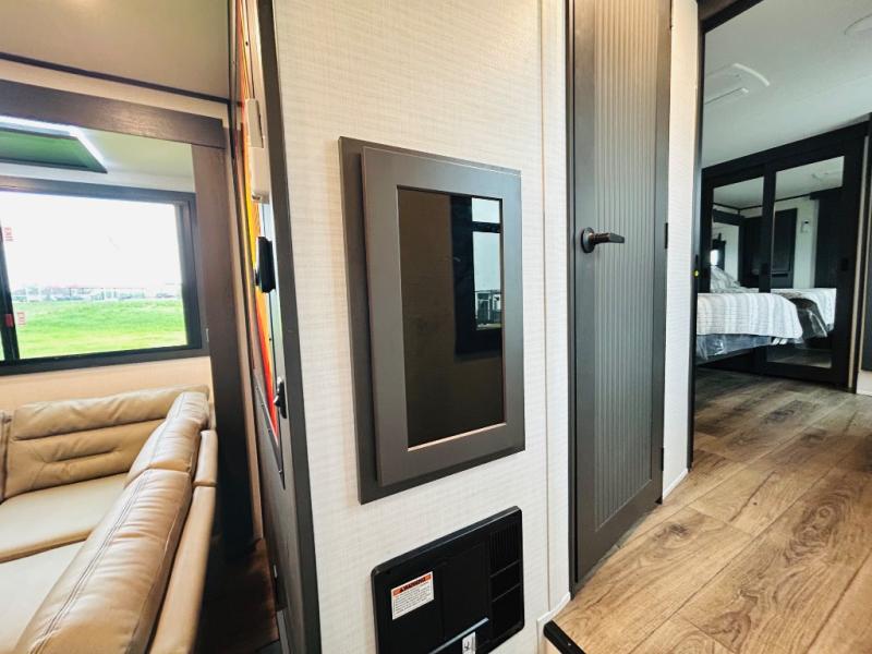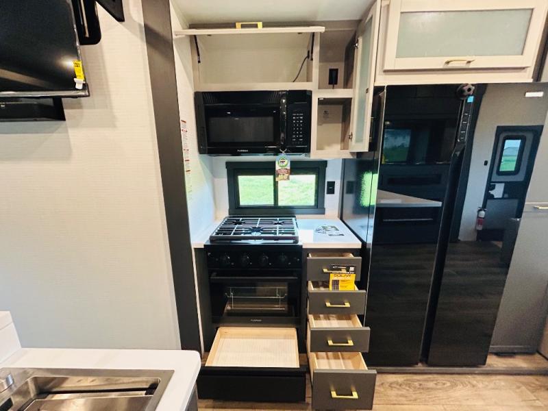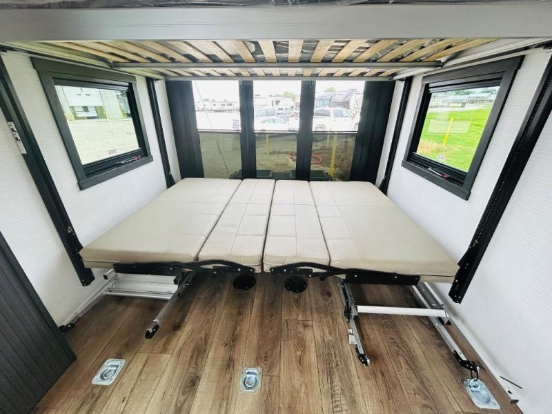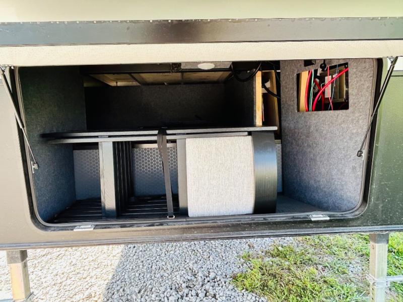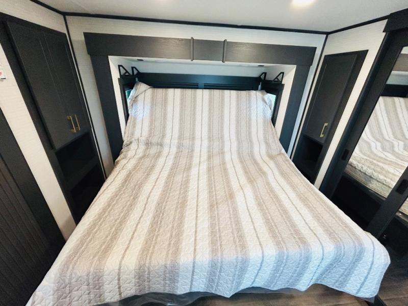 Once you arrive at your destination, you can unload your toys from the 13' garage, then relax on the dual gaucho sofas with a removable dinette table in between. There is also a queen-size Euro bed above the sofa where guests can sleep. Everyone will love to gather on the side patio that features a flip-down bar top and a window that looks into the kitchen. There are also bar stools here and inside at the counter so everyone has a seat. If the weather isn't cooperating, you can relax on the L-shaped sofa in the main living area, and there is a 55" TV with a hidden pantry behind for snacks! A spacious full bath will let everyone freshen up after trail riding, and you'll love having your own bedroom up front. Here, you'll find a 66 x 80 king bed slide out, a wardrobe, dresser, plus washer and dryer prep if you choose to add those appliances!