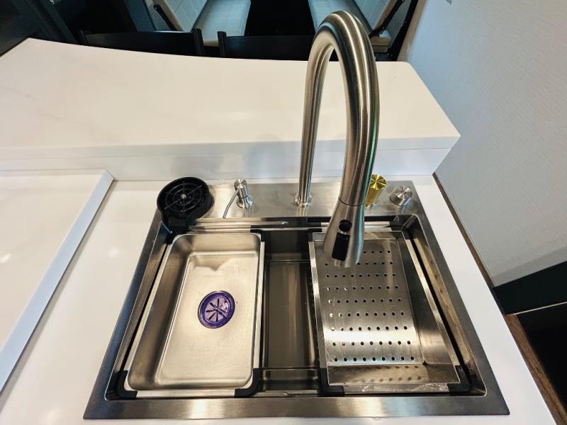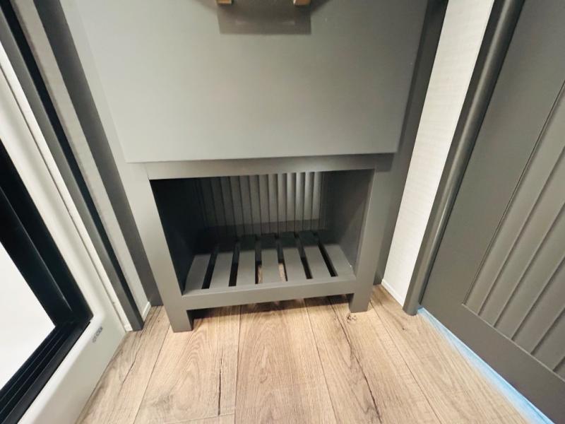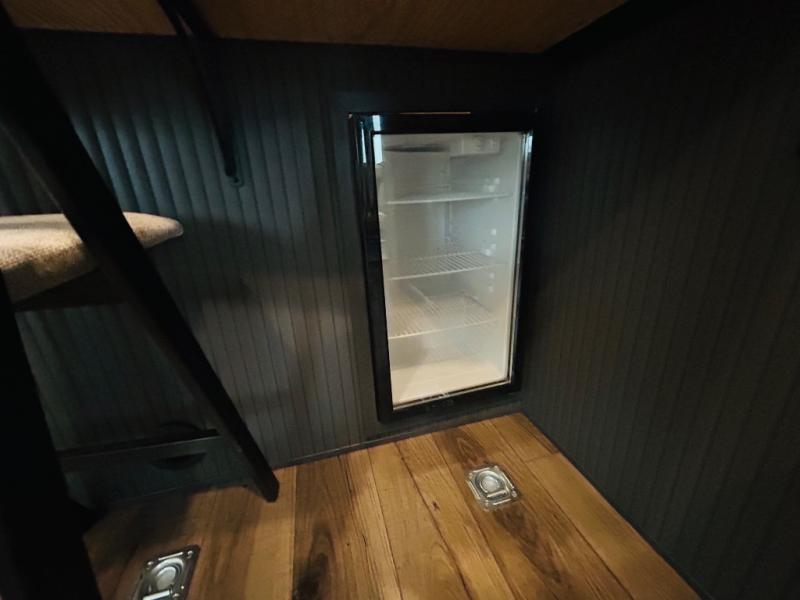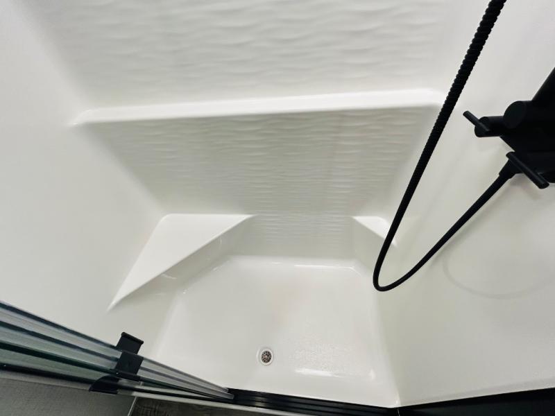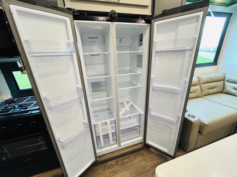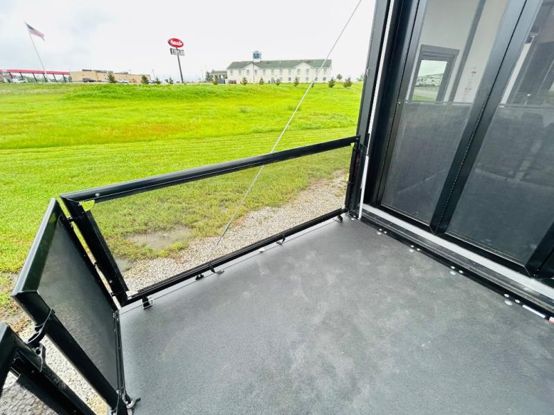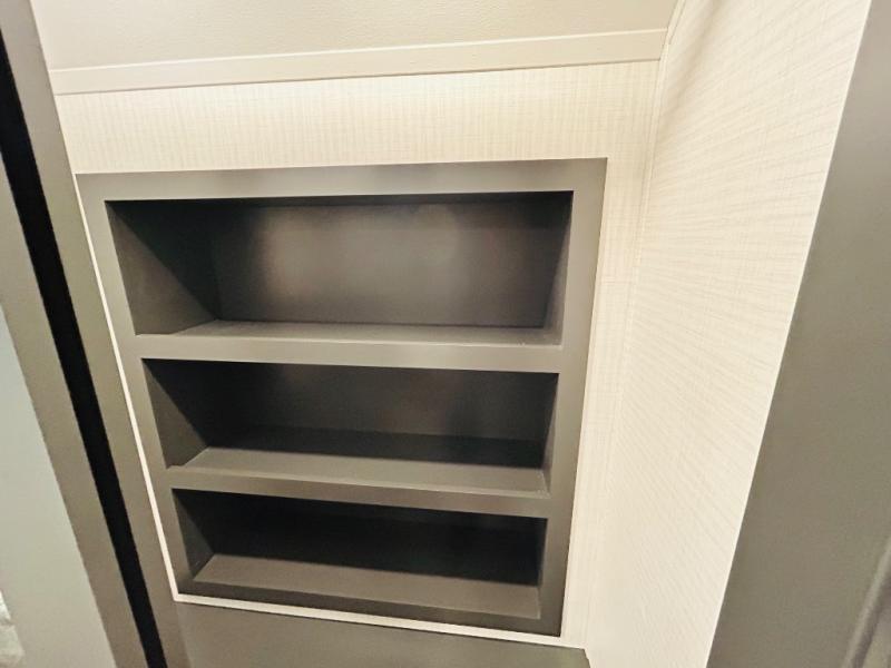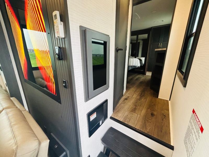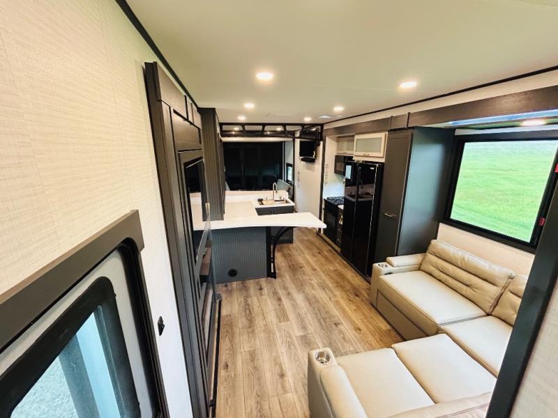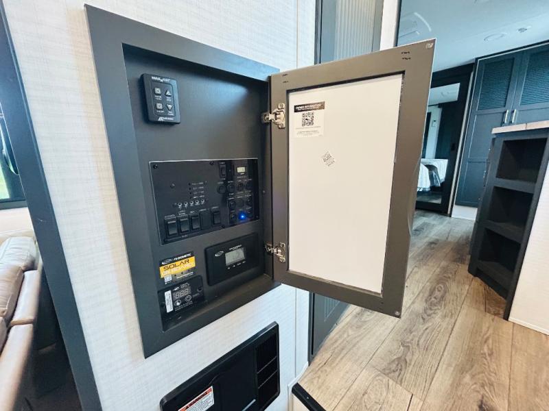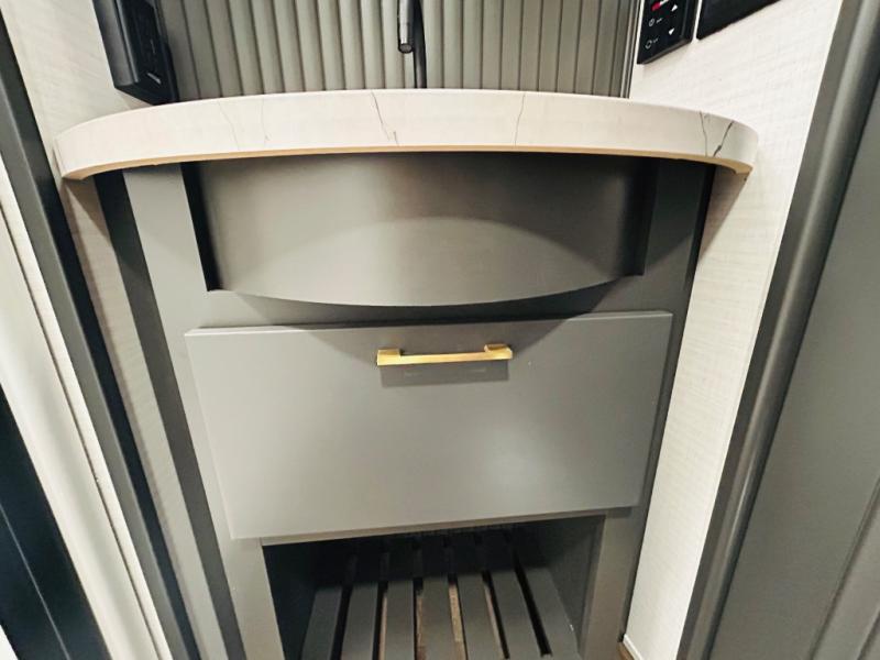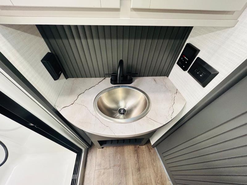 Once you arrive at your destination, you can unload your toys from the 13' garage, then relax on the dual gaucho sofas with a removable dinette table in between. There is also a queen-size Euro bed above the sofa where guests can sleep. Everyone will love to gather on the side patio that features a flip-down bar top and a window that looks into the kitchen. There are also bar stools here and inside at the counter so everyone has a seat. If the weather isn't cooperating, you can relax on the L-shaped sofa in the main living area, and there is a 55" TV with a hidden pantry behind for snacks! A spacious full bath will let everyone freshen up after trail riding, and you'll love having your own bedroom up front. Here, you'll find a 66 x 80 king bed slide out, a wardrobe, dresser, plus washer and dryer prep if you choose to add those appliances!
