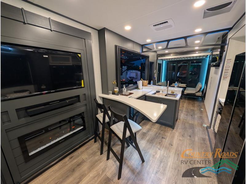 Once you arrive at your destination, you can unload your toys from the 13' garage, then relax on the dual gaucho sofas with a removable dinette table in between. There is also a queen-size Euro bed above the sofa where guests can sleep. Everyone will love to gather on the side patio that features a flip-down bar top and a window that looks into the kitchen. There are also bar stools here and inside at the counter so everyone has a seat. If the weather isn't cooperating, you can relax on the L-shaped sofa in the main living area, and there is a 55" TV with a hidden pantry behind for snacks! A spacious full bath will let everyone freshen up after trail riding, and you'll love having your own bedroom up front. Here, you'll find a 66 x 80 king bed slide out, a wardrobe, dresser, plus washer and dryer prep if you choose to add those appliances!